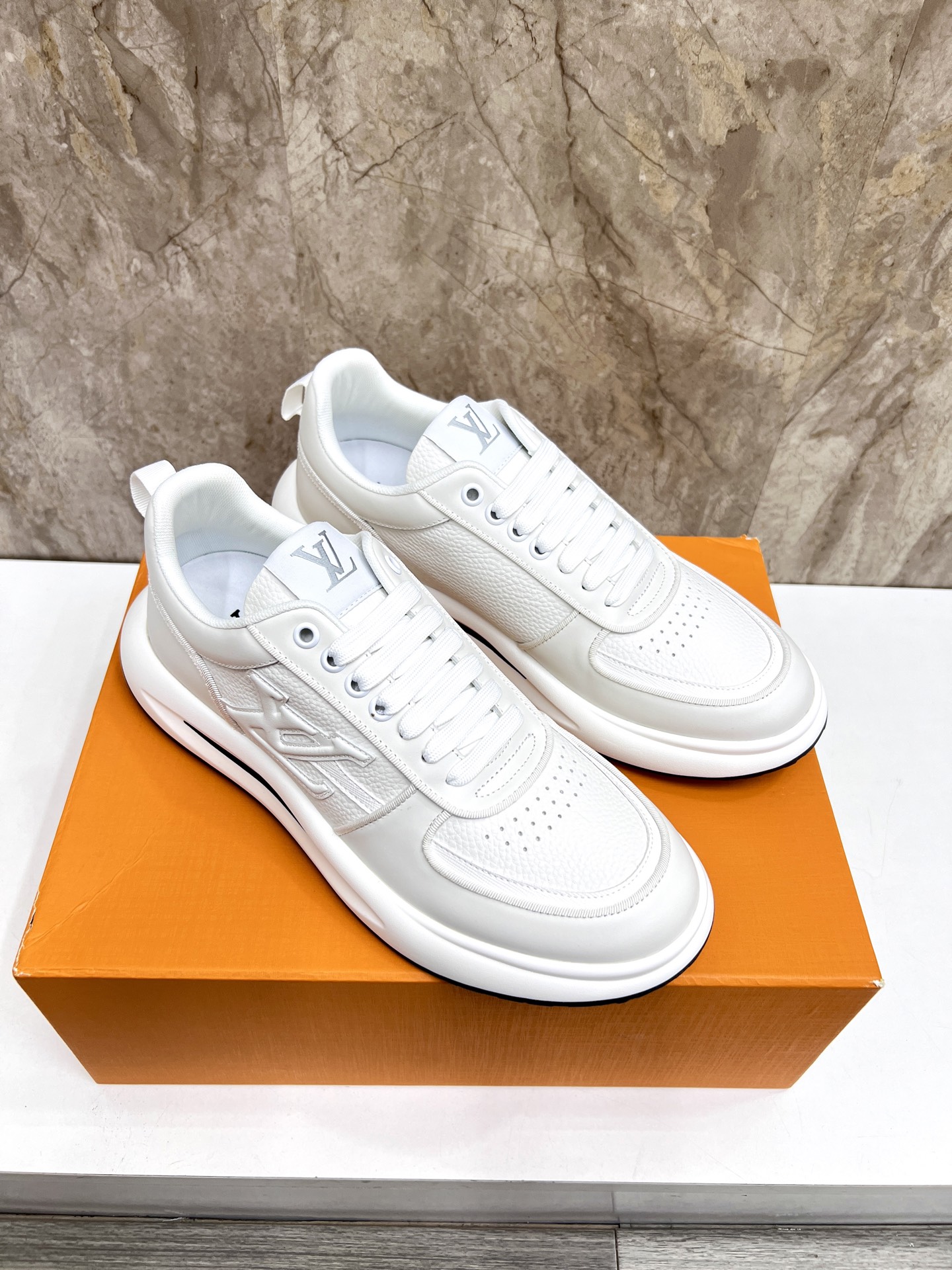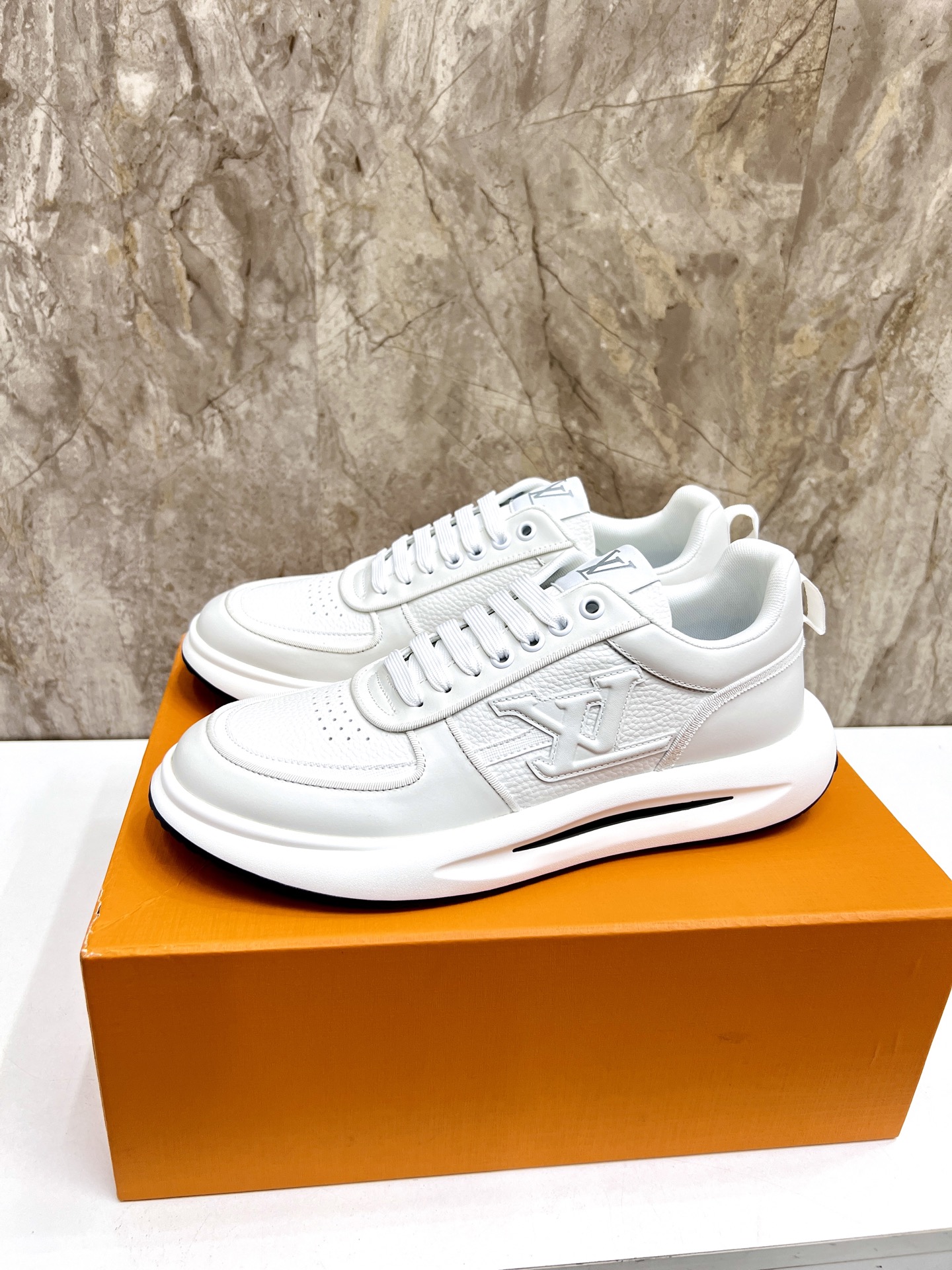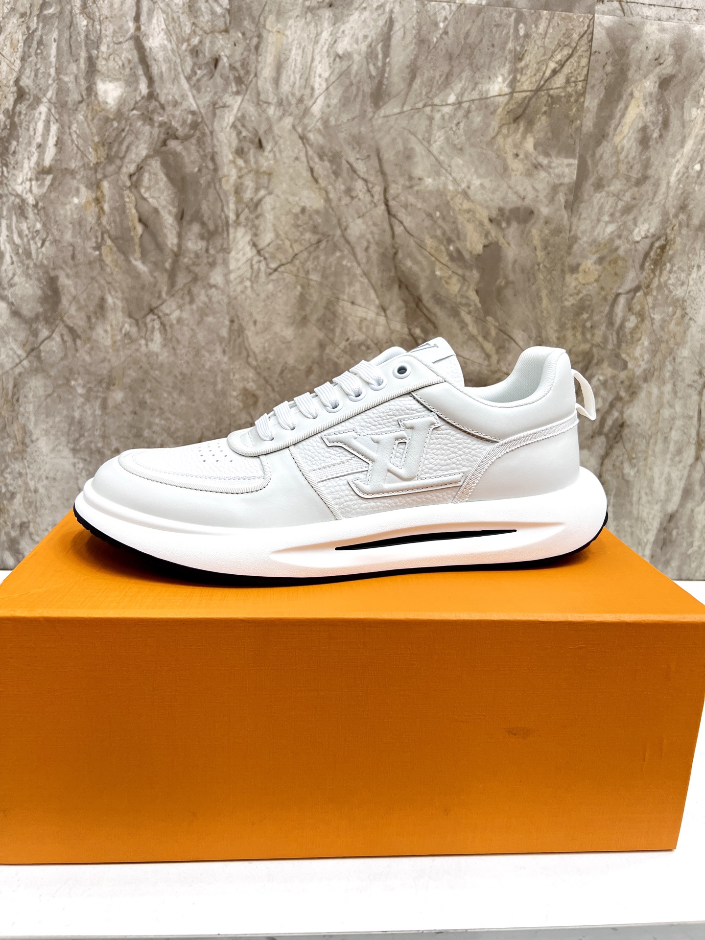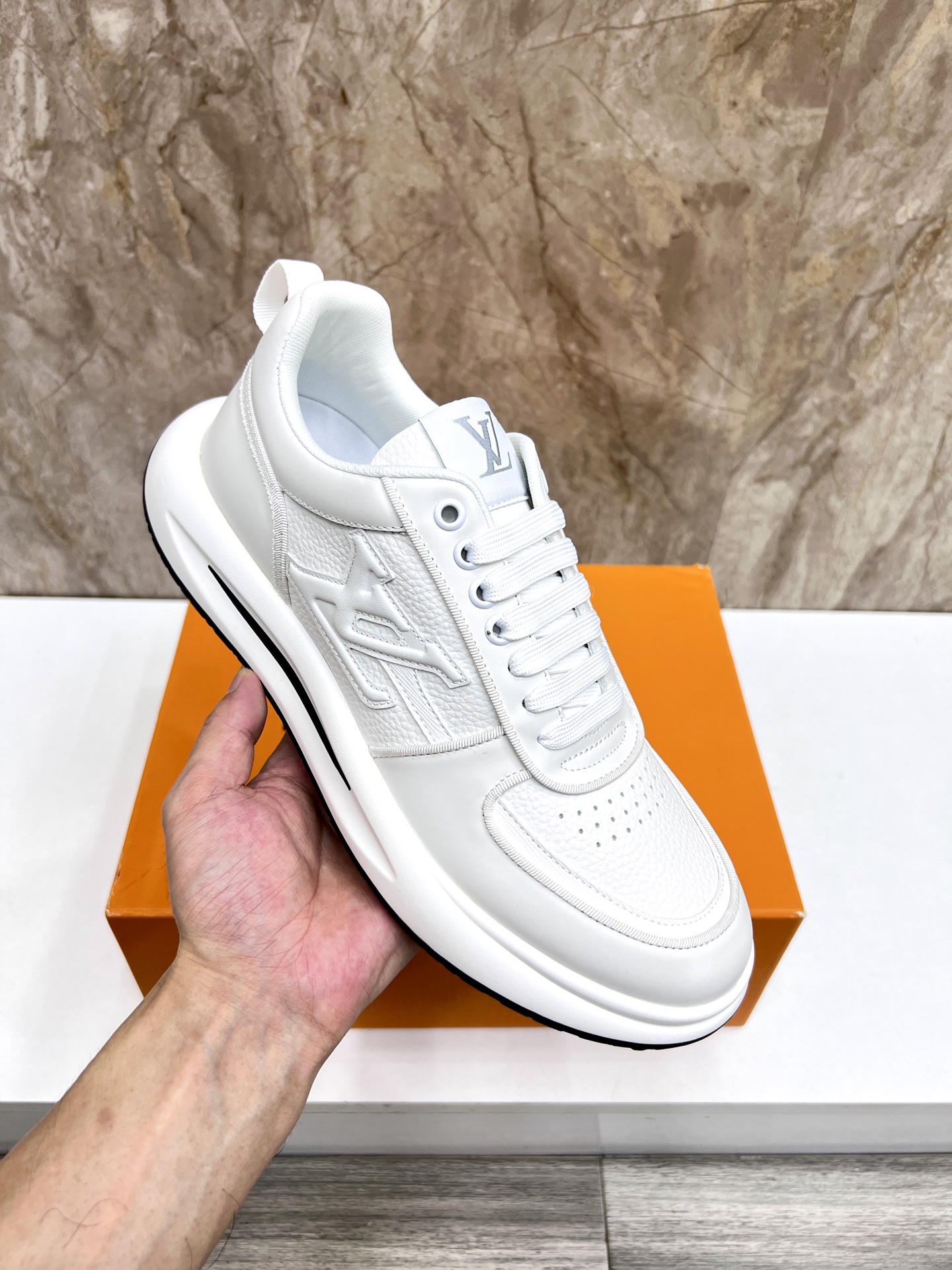 这款鞋子是AAAAA 1:1 质量 (非常棒). 使用了和原版一模一样的材料. 商标部分也保持了和路易威登/Louis Vuitton一样. 图片拍摄是实物鞋子拍摄, 您所收到的实物保证和我们图片一模一样.