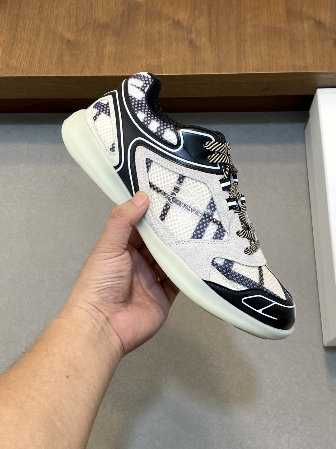 这款鞋子是AAAAA 1:1 质量 (非常棒). 使用了和原版一模一样的材料. 商标部分也保持了和巴宝莉/Burberry一样. 图片拍摄是实物鞋子拍摄, 您所收到的实物保证和我们图片一模一样.