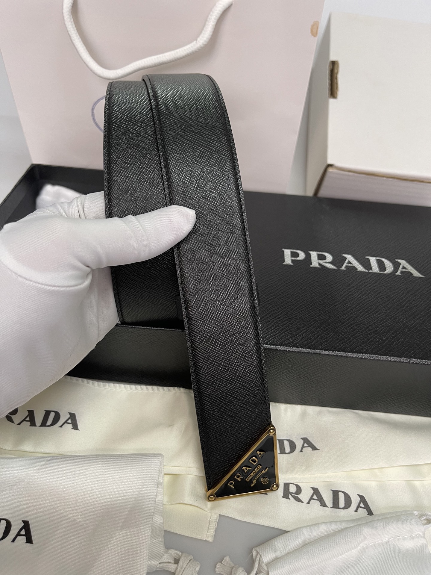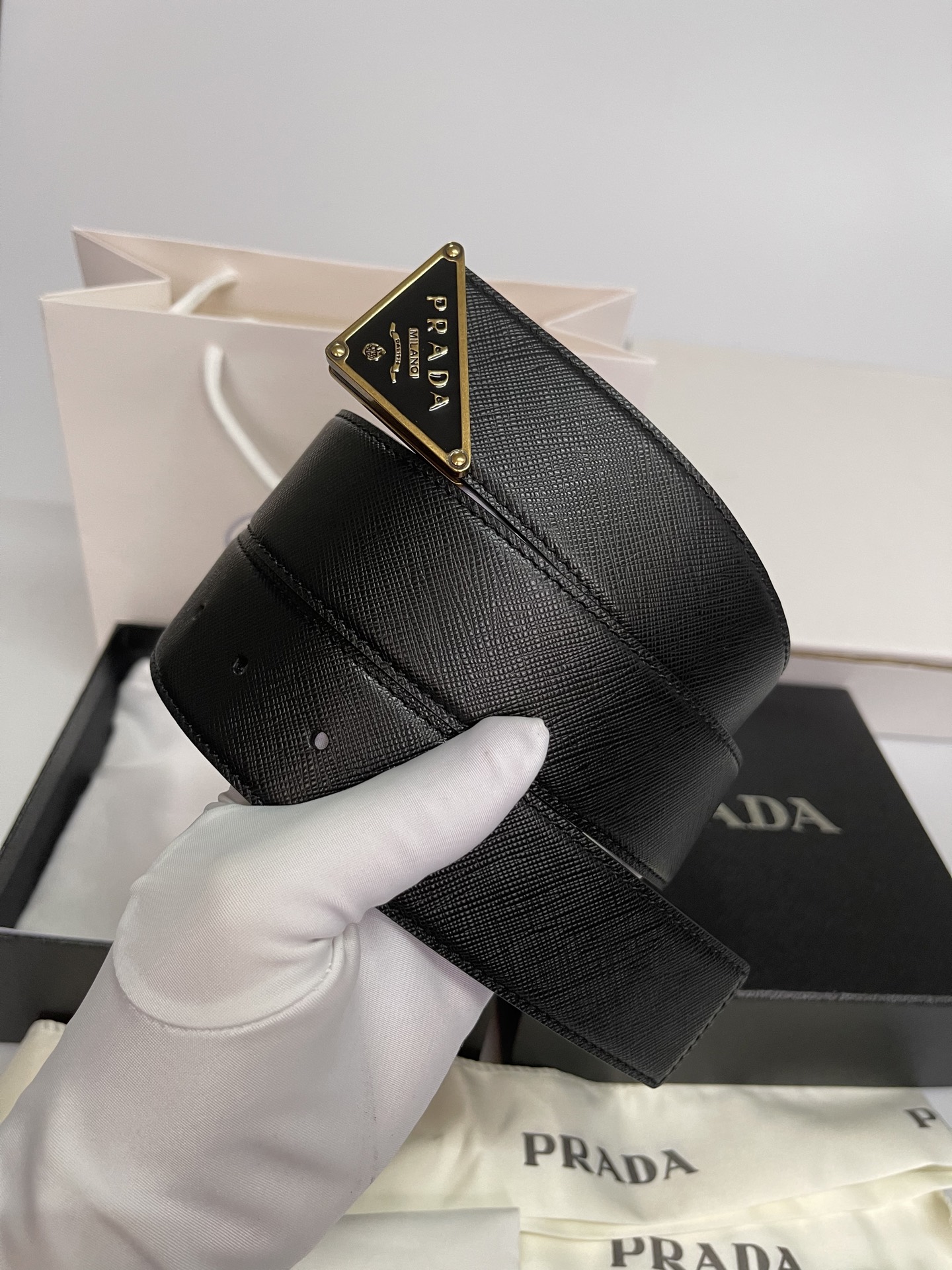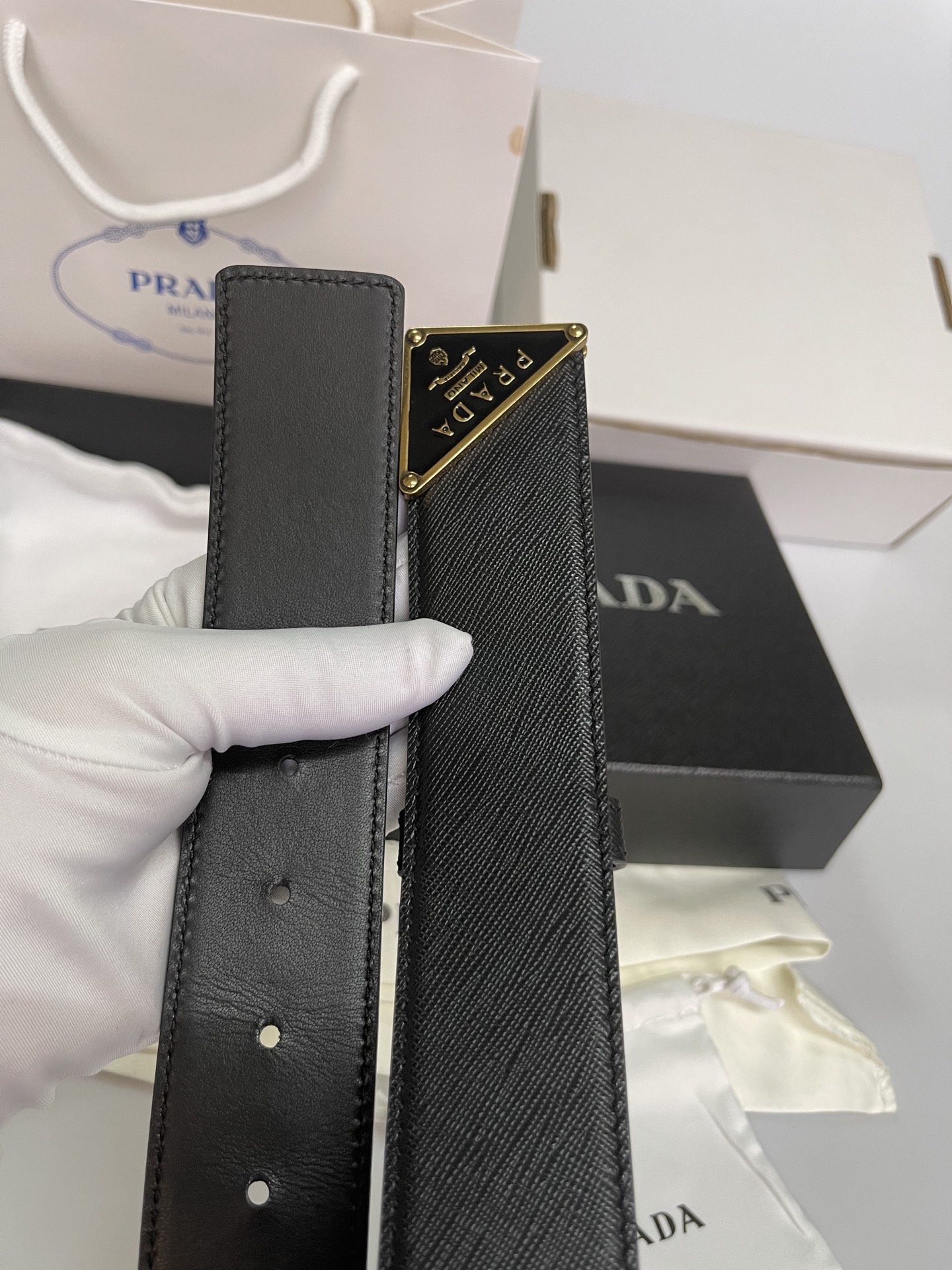 这款皮带是AAAAA 1:1 质量 (非常棒). 使用了和原版一模一样的材料. 商标部分也保持了和普拉达/Prada一样. 图片拍摄是实物皮带拍摄, 您所收到的实物保证和我们图片一模一样.