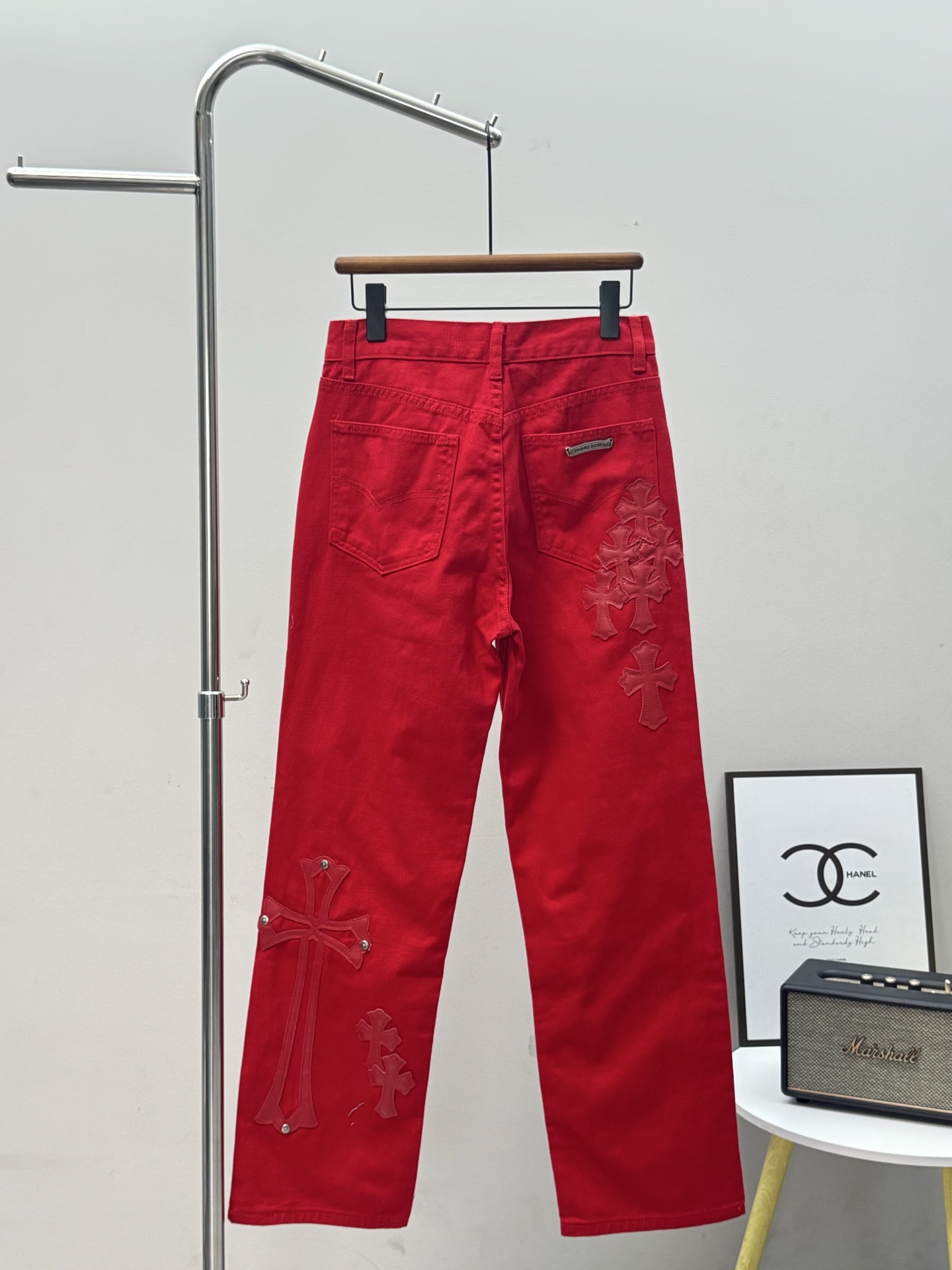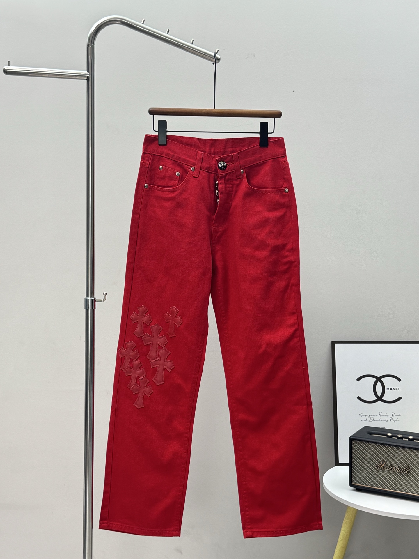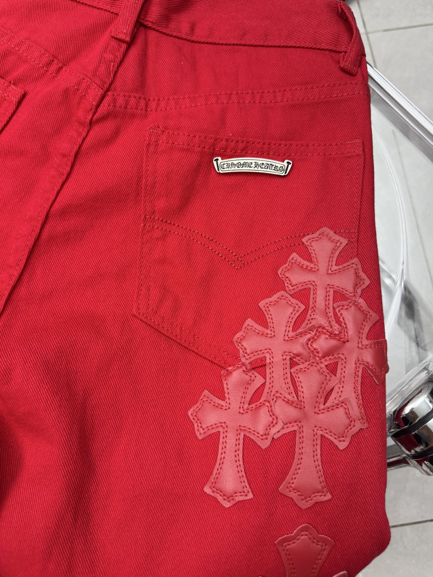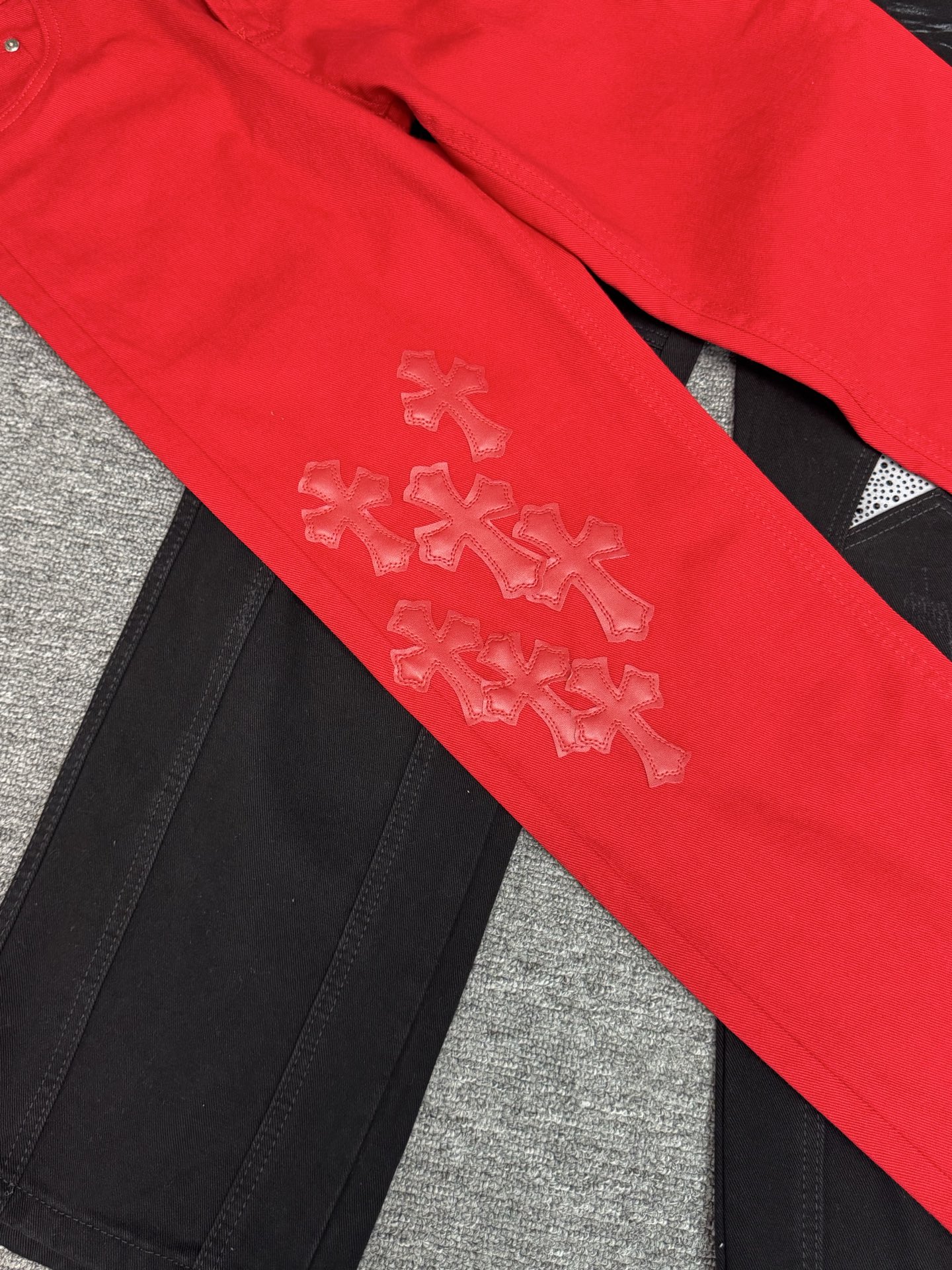 这款衣服是AAAAA 1:1 质量 (非常棒). 使用了和原版一模一样的材料. 商标部分也保持了和克罗心/Chrome Hearts一样. 图片拍摄是实物衣服拍摄, 您所收到的实物保证和我们图片一模一样.