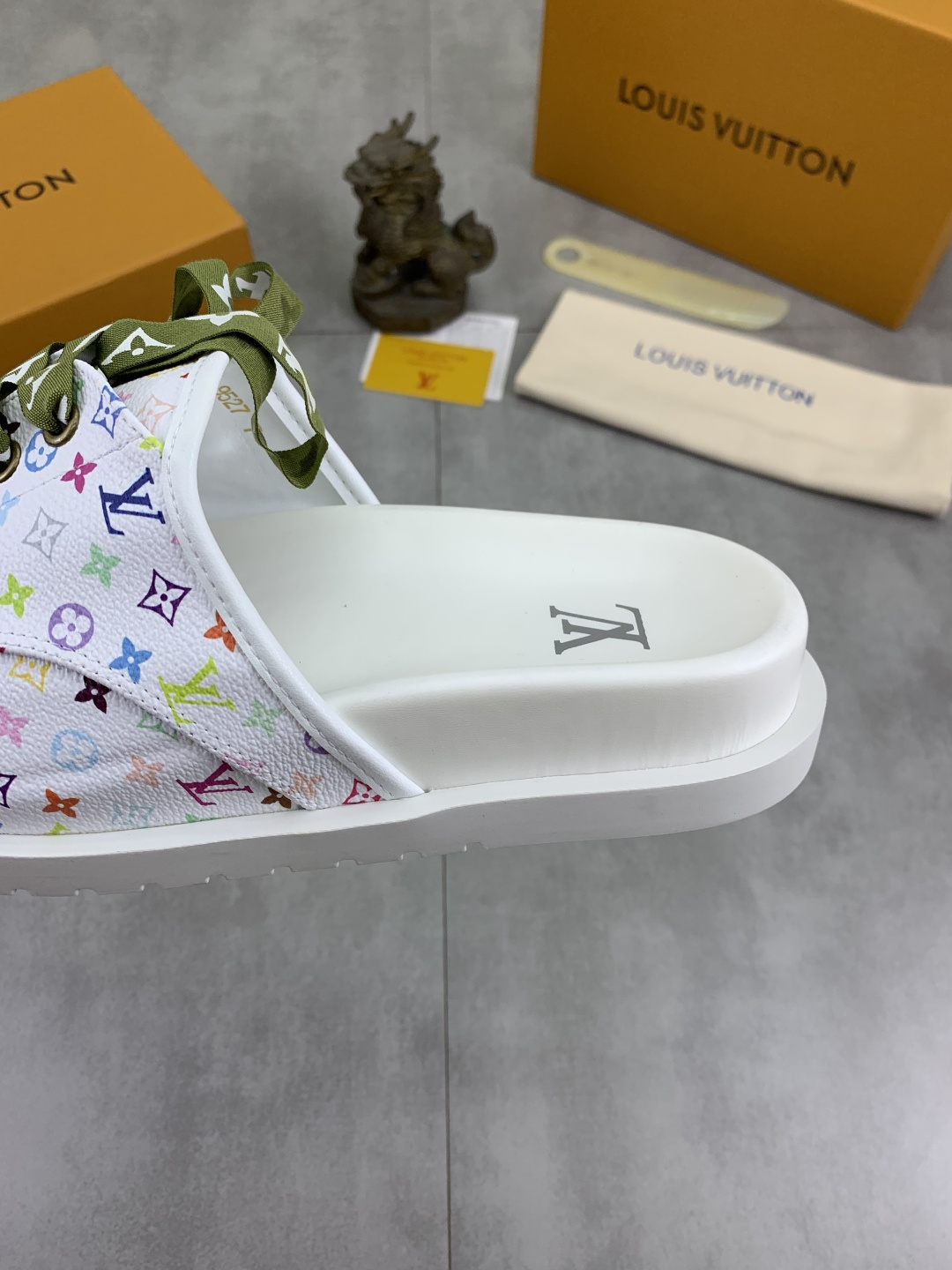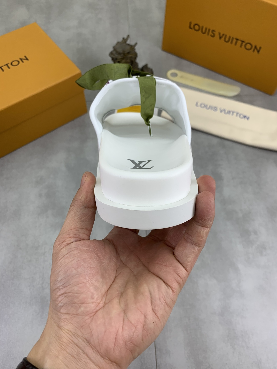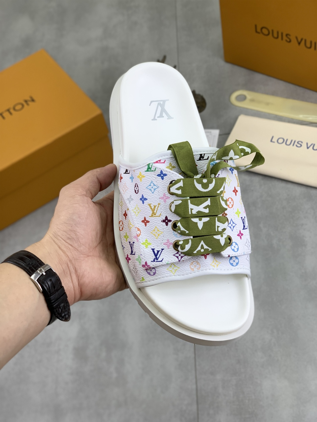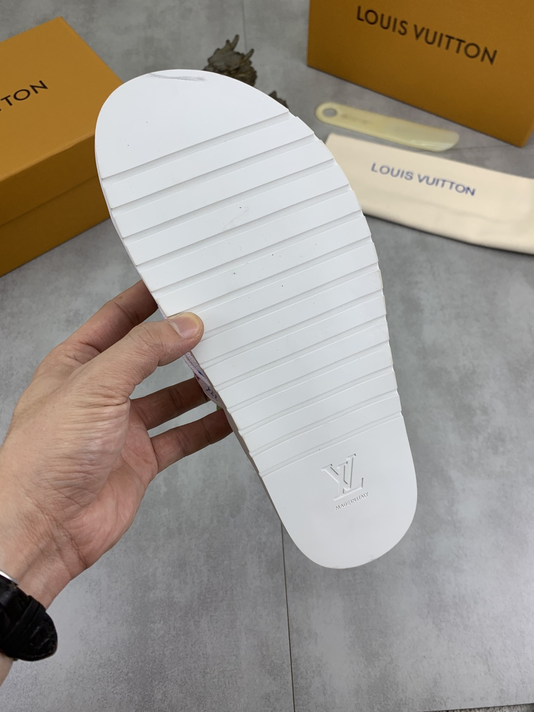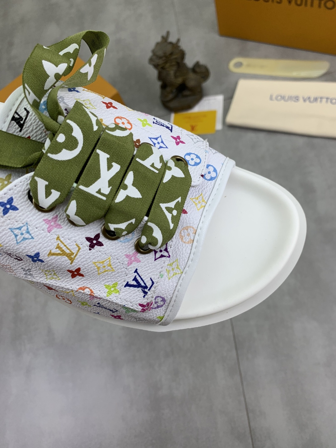 这款鞋子是AAAAA 1:1 质量 (非常棒). 使用了和原版一模一样的材料. 商标部分也保持了和路易威登/Louis Vuitton一样. 图片拍摄是实物鞋子拍摄, 您所收到的实物保证和我们图片一模一样.
