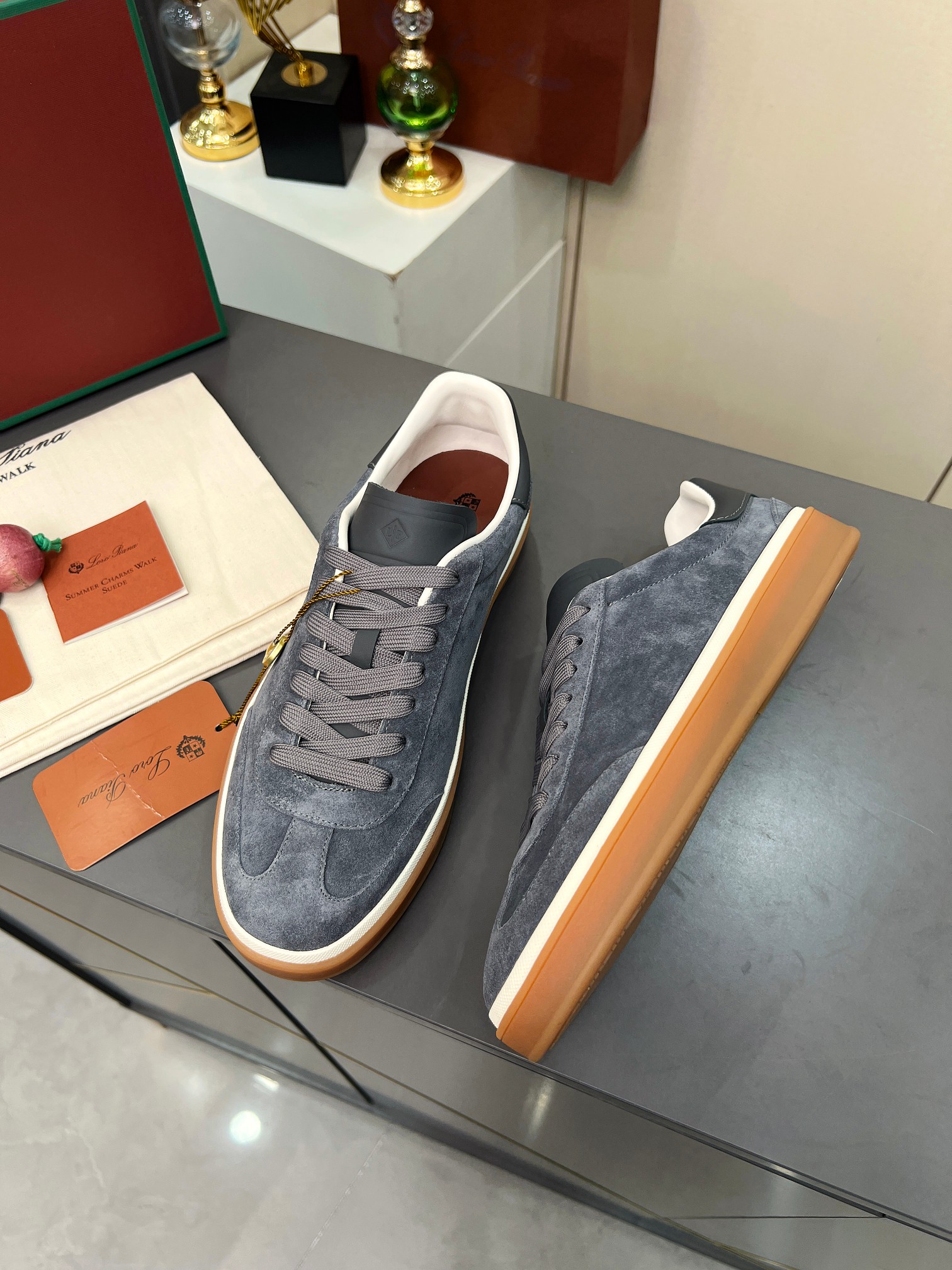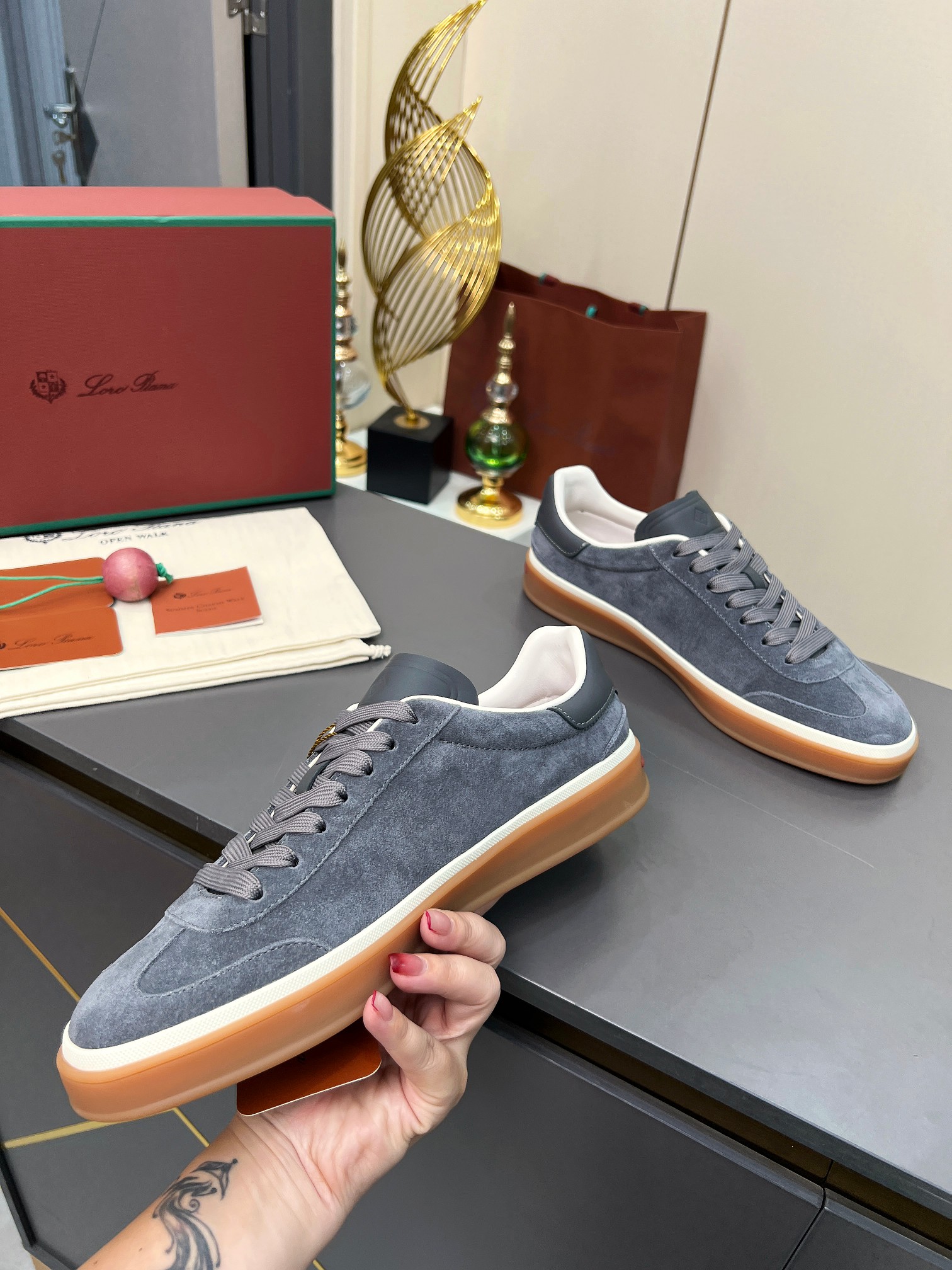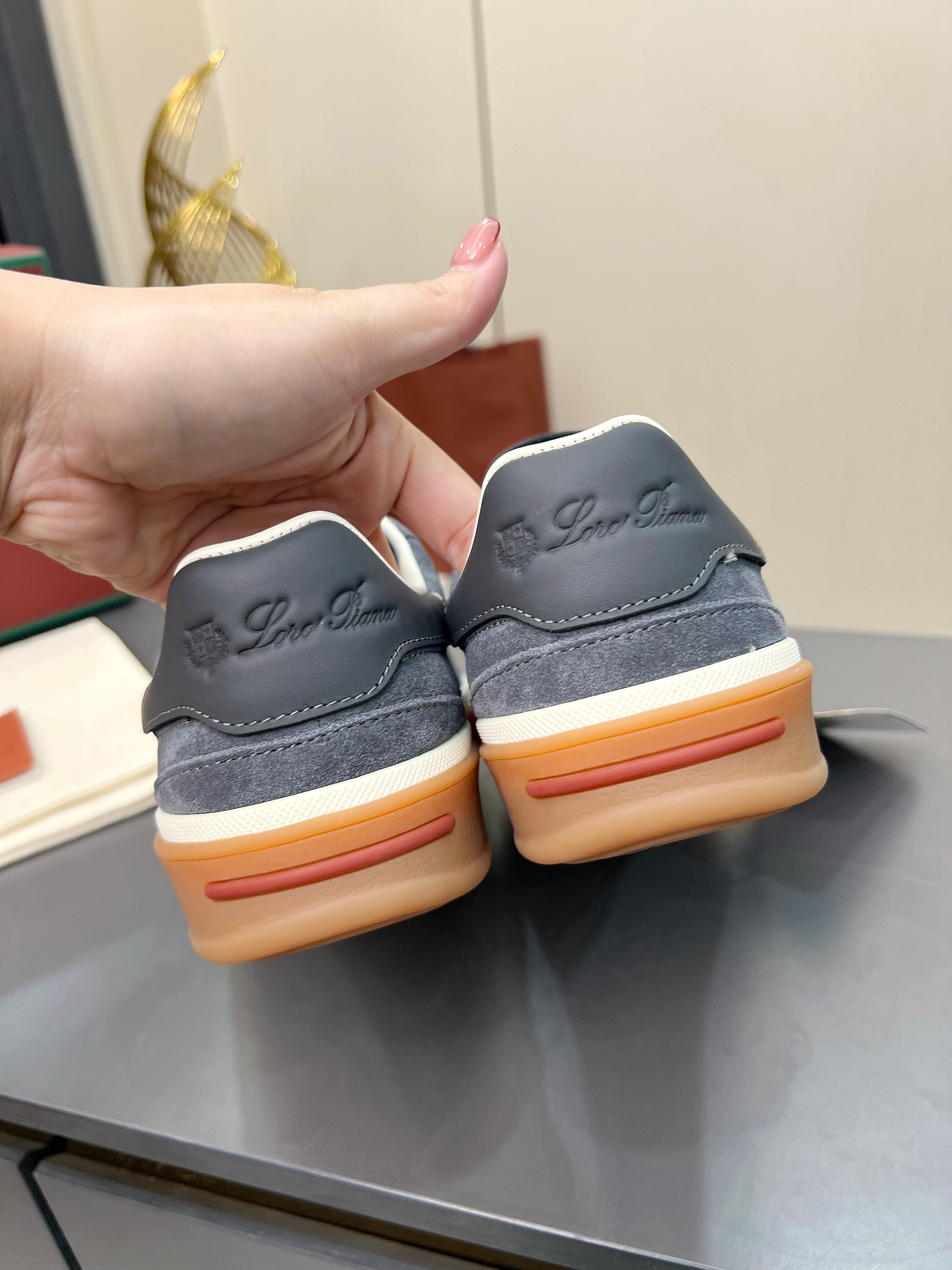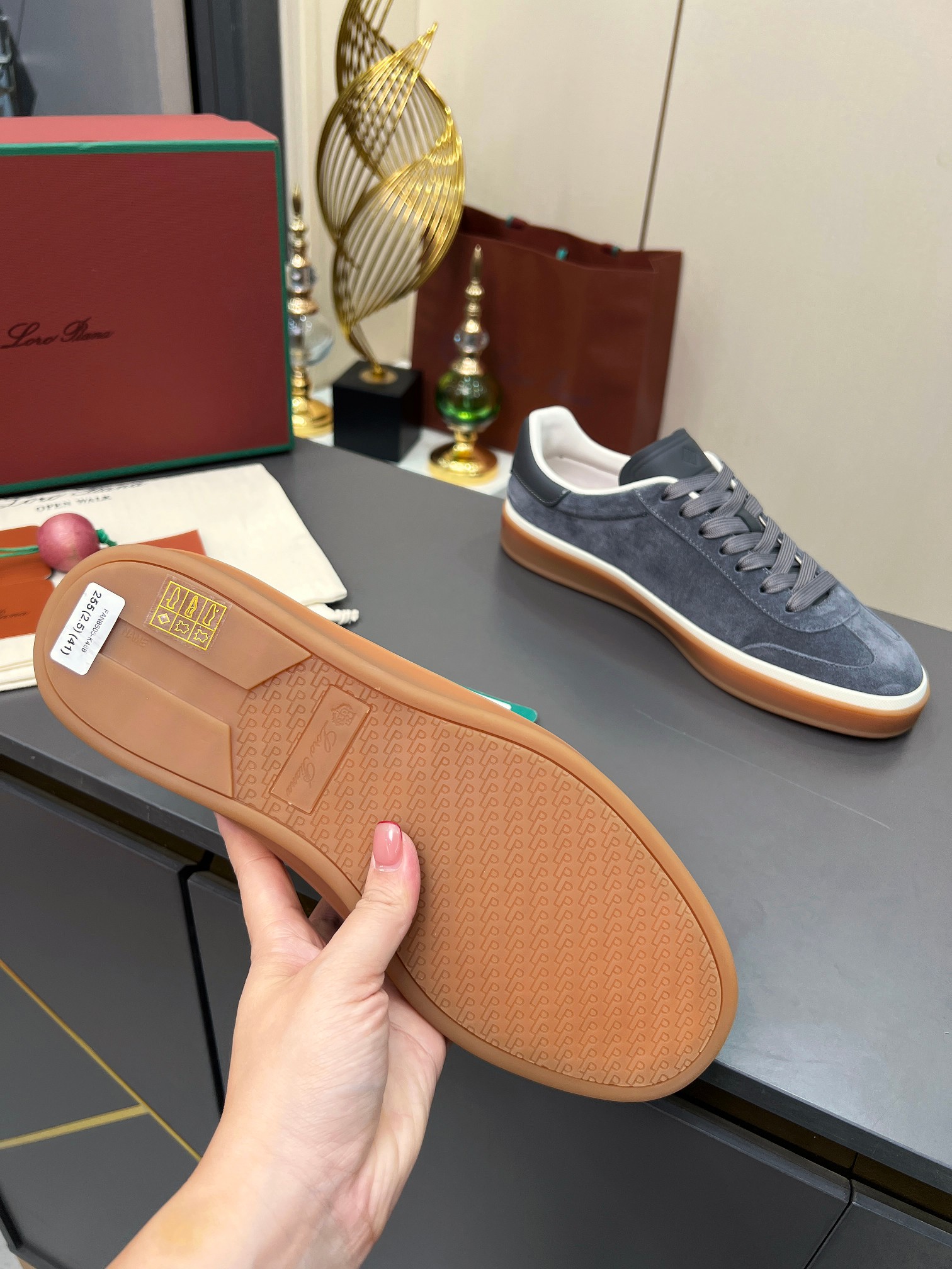这款鞋子是AAAAA 1:1 质量 (非常棒). 使用了和原版一模一样的材料. 商标部分也保持了和洛罗皮亚纳/Loro Piana一样. 图片拍摄是实物鞋子拍摄, 您所收到的实物保证和我们图片一模一样.