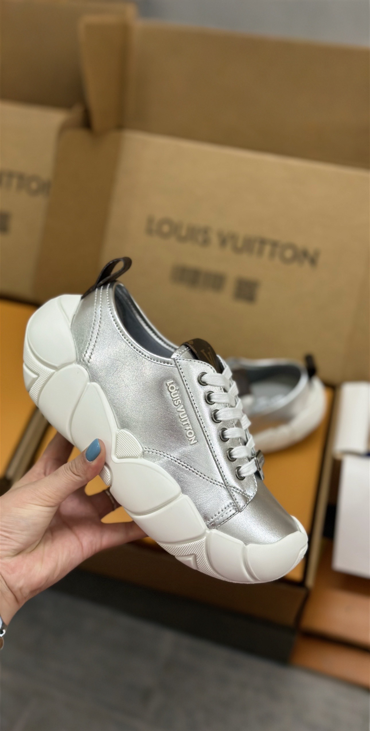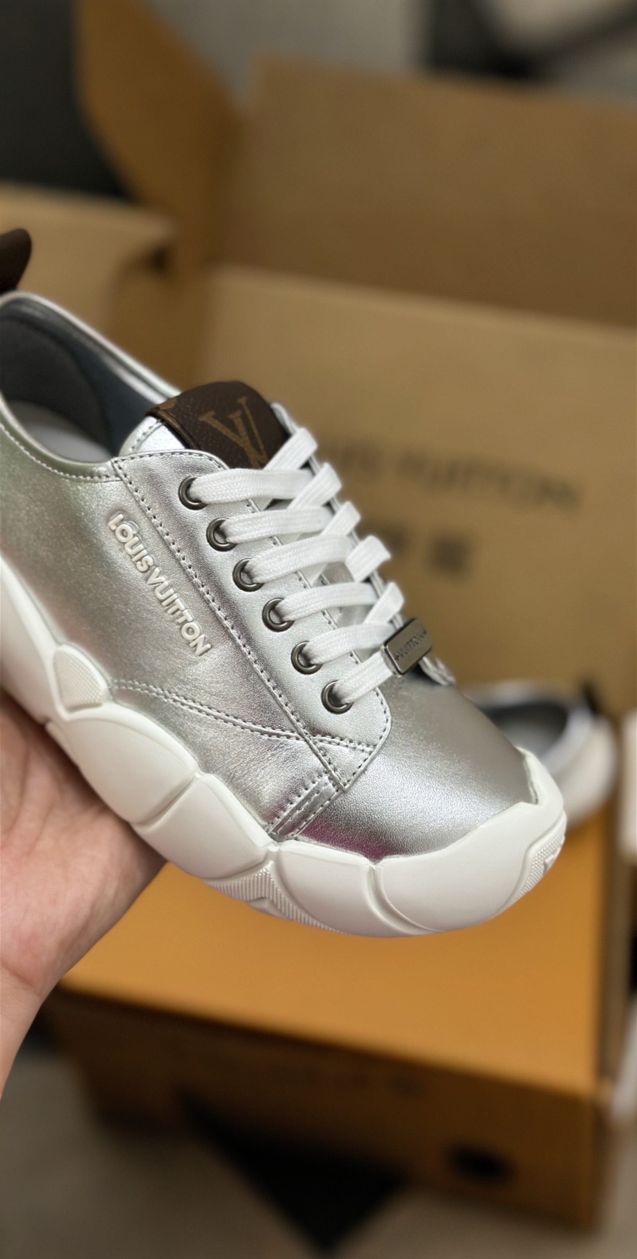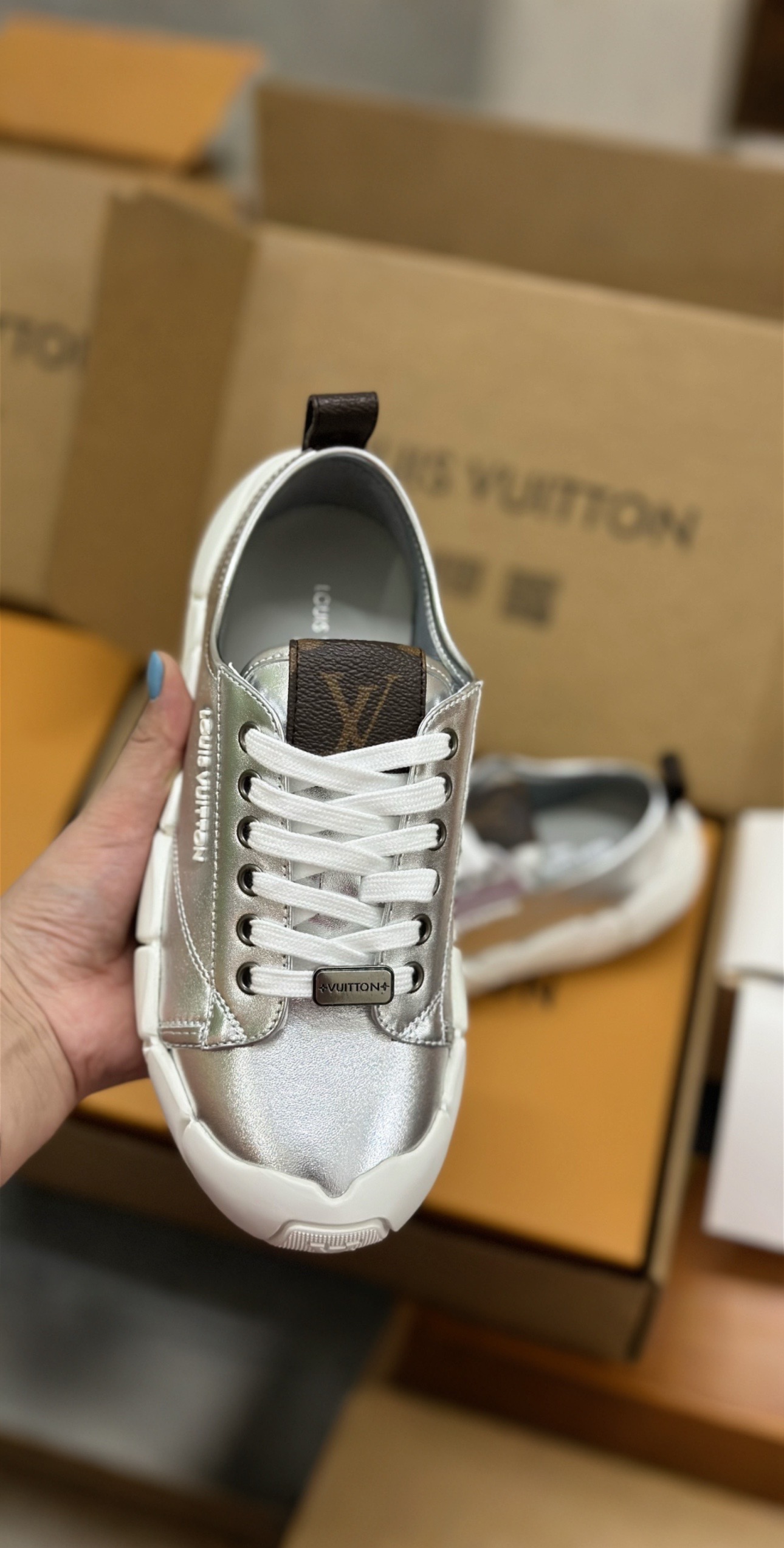 这款鞋子是AAAAA 1:1 质量 (非常棒). 使用了和原版一模一样的材料. 商标部分也保持了和路易威登/Louis Vuitton一样. 图片拍摄是实物鞋子拍摄, 您所收到的实物保证和我们图片一模一样.