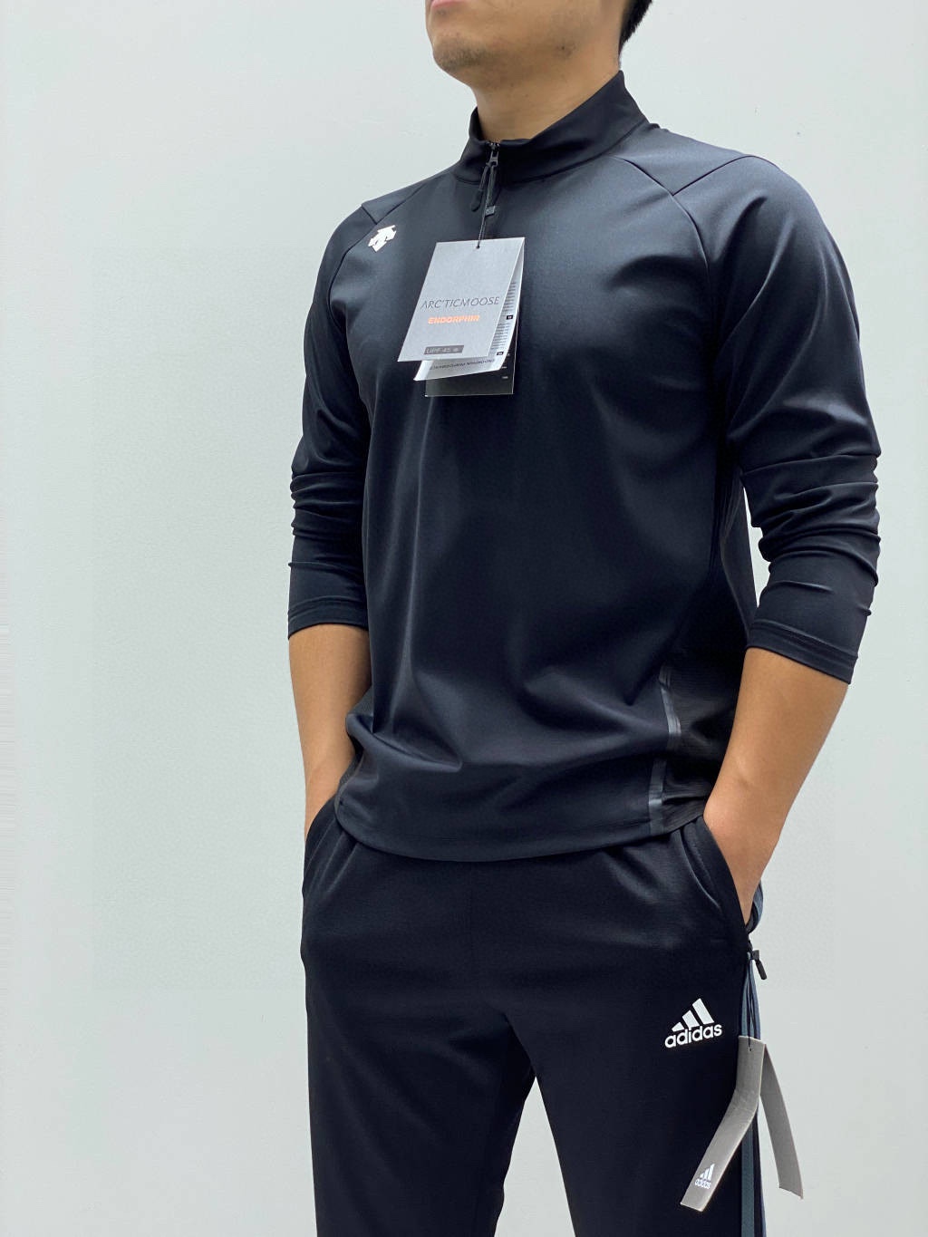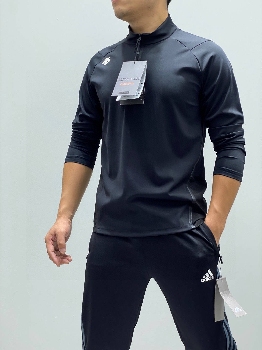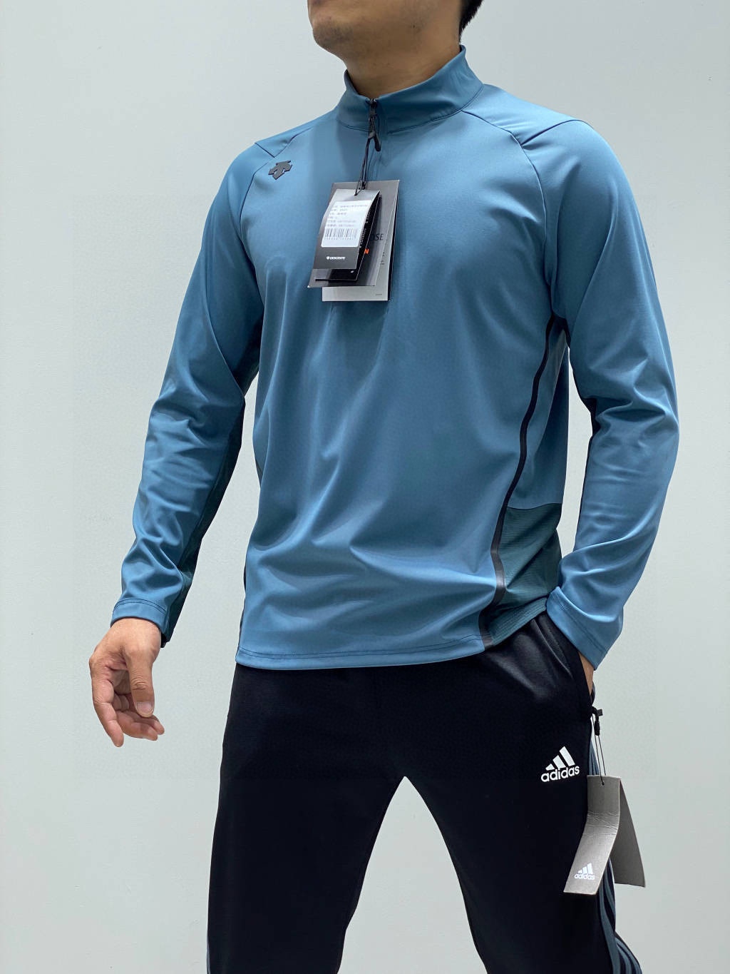 这款衣服是AAAAA 1:1 质量 (非常棒). 使用了和原版一模一样的材料. 商标部分也保持了和Descente一样. 图片拍摄是实物衣服拍摄, 您所收到的实物保证和我们图片一模一样.