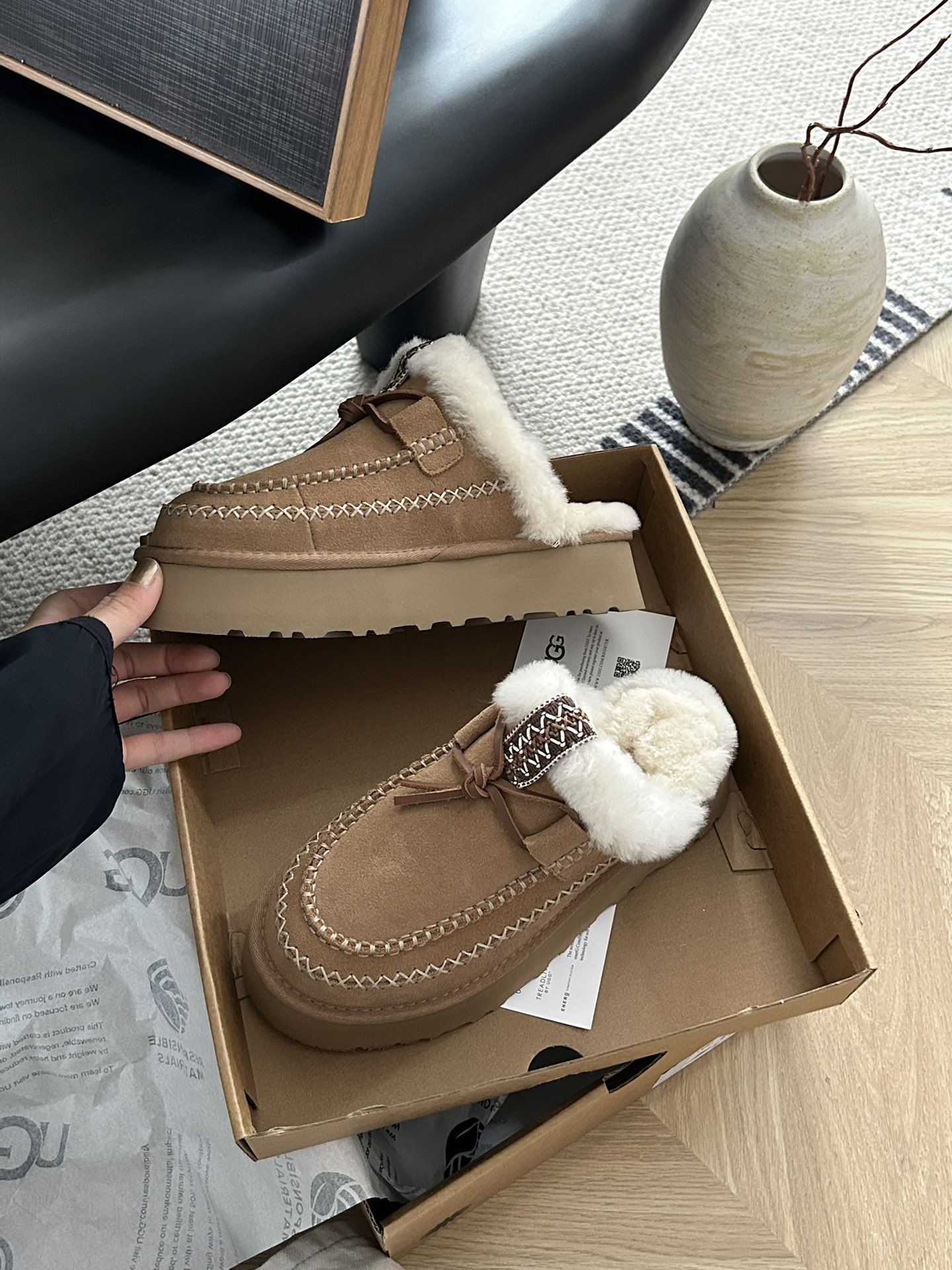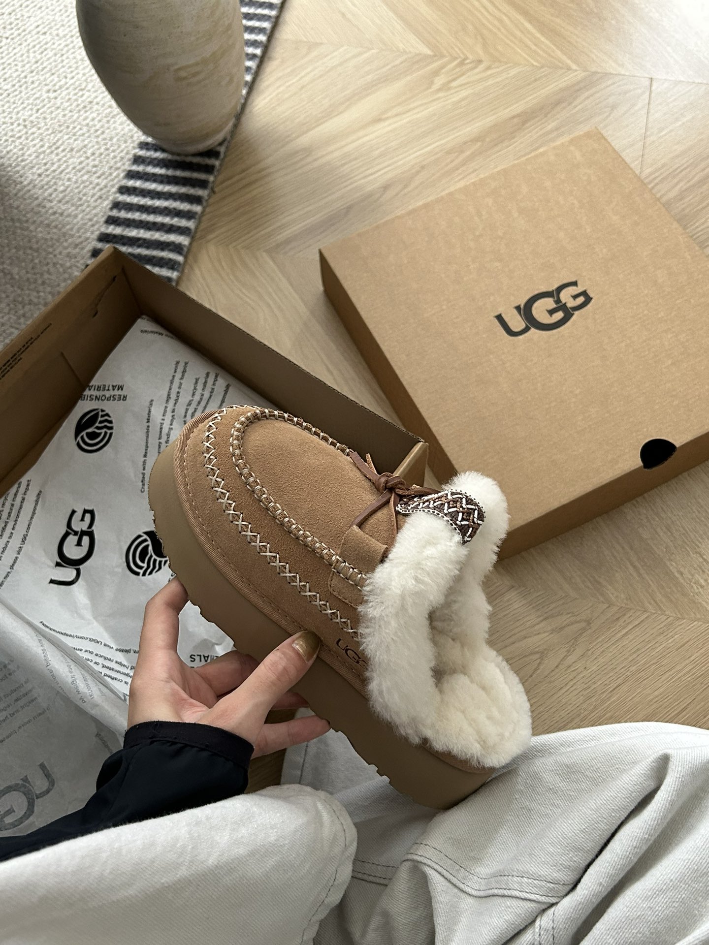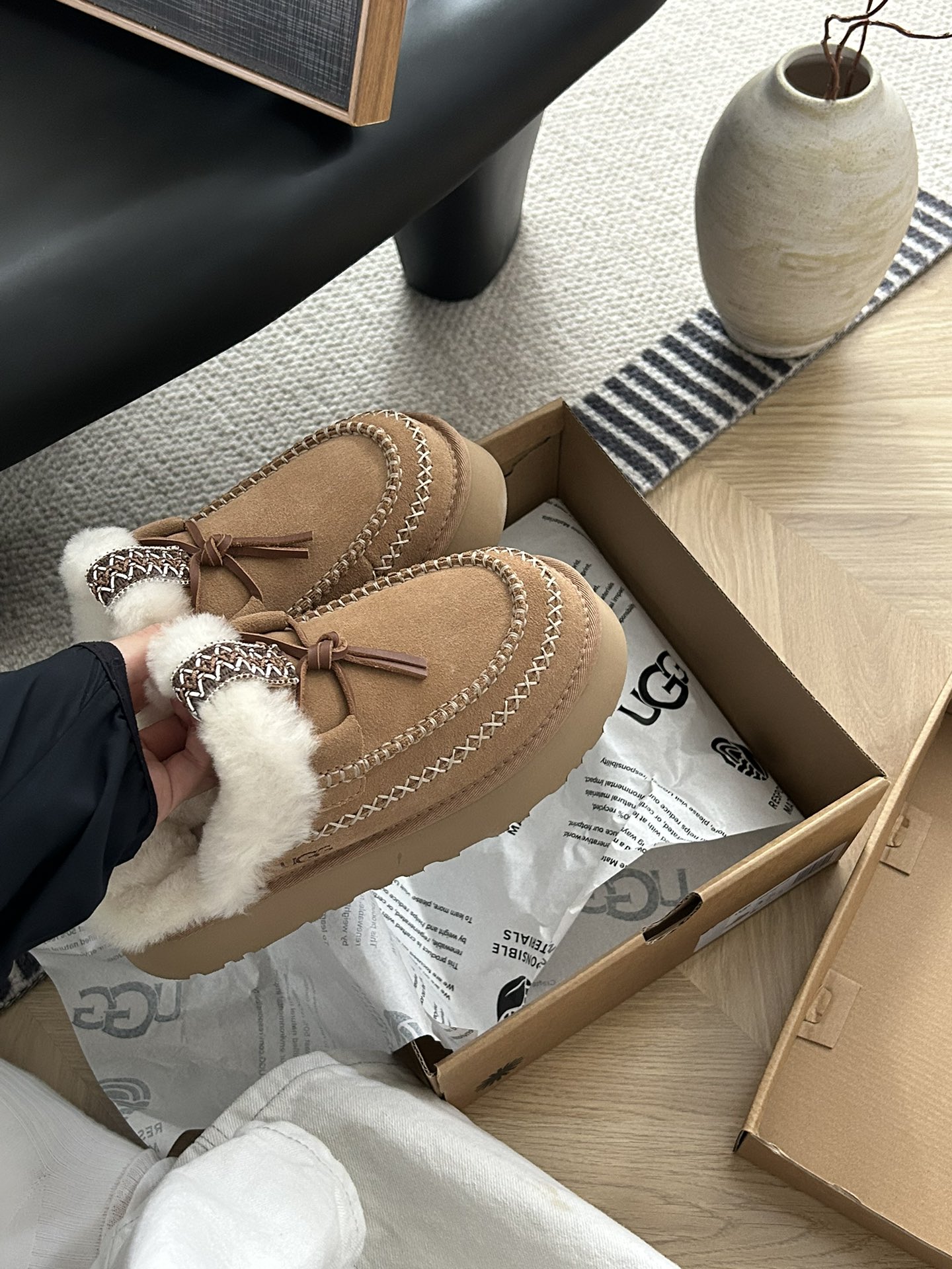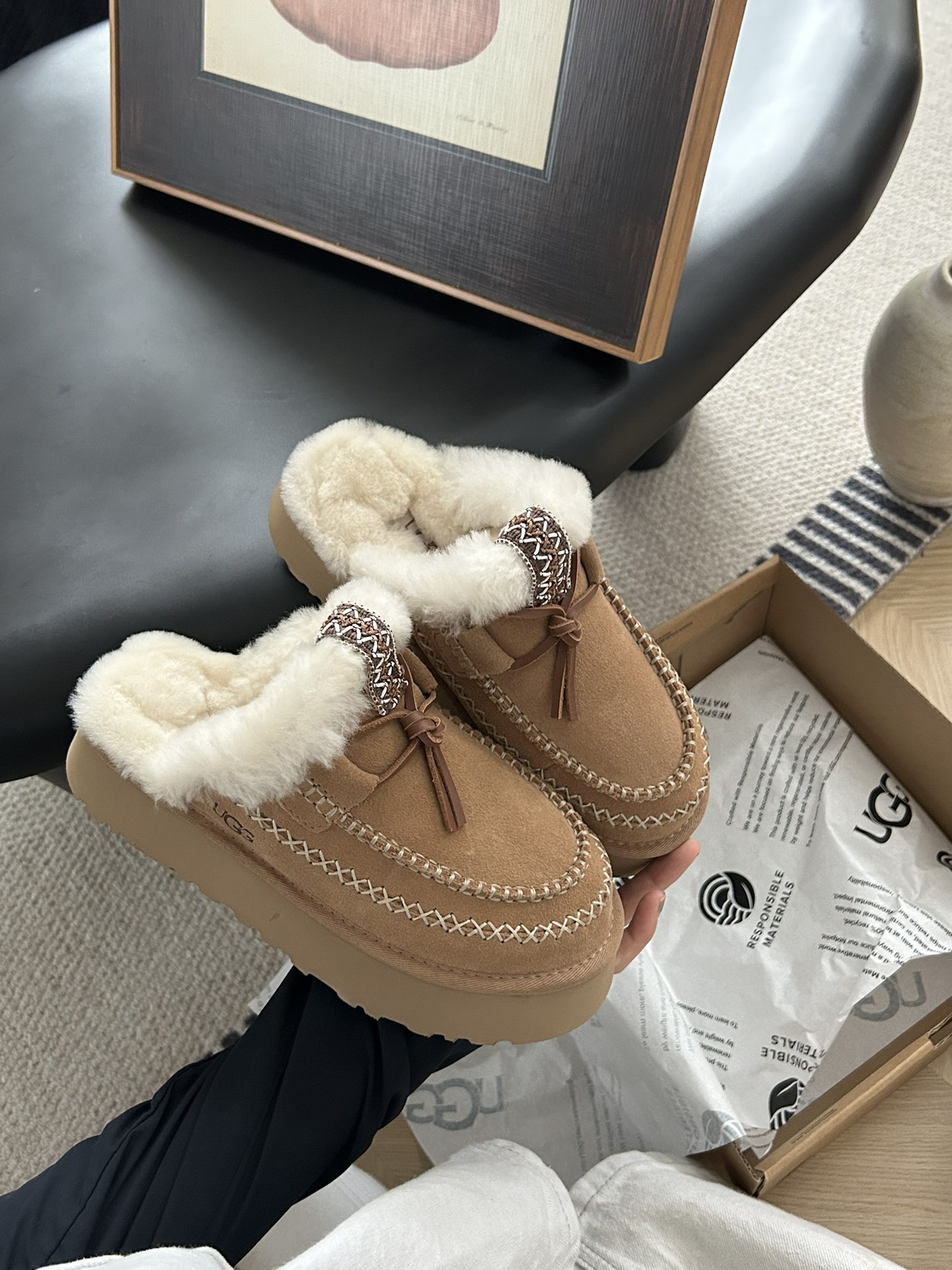 这款鞋子是AAAAA 1:1 质量 (非常棒). 使用了和原版一模一样的材料. 商标部分也保持了和UGG雪地靴一样. 图片拍摄是实物鞋子拍摄, 您所收到的实物保证和我们图片一模一样.