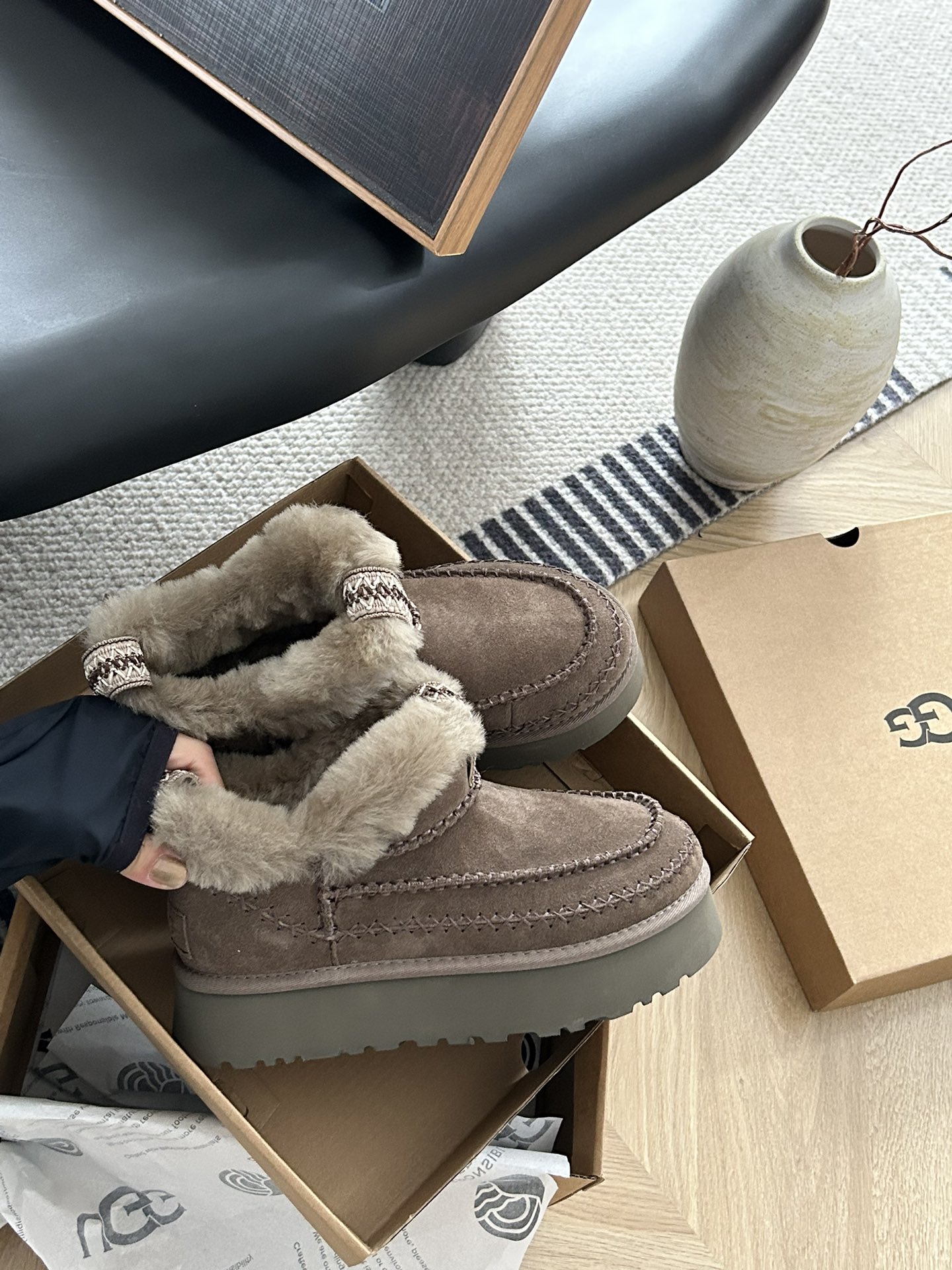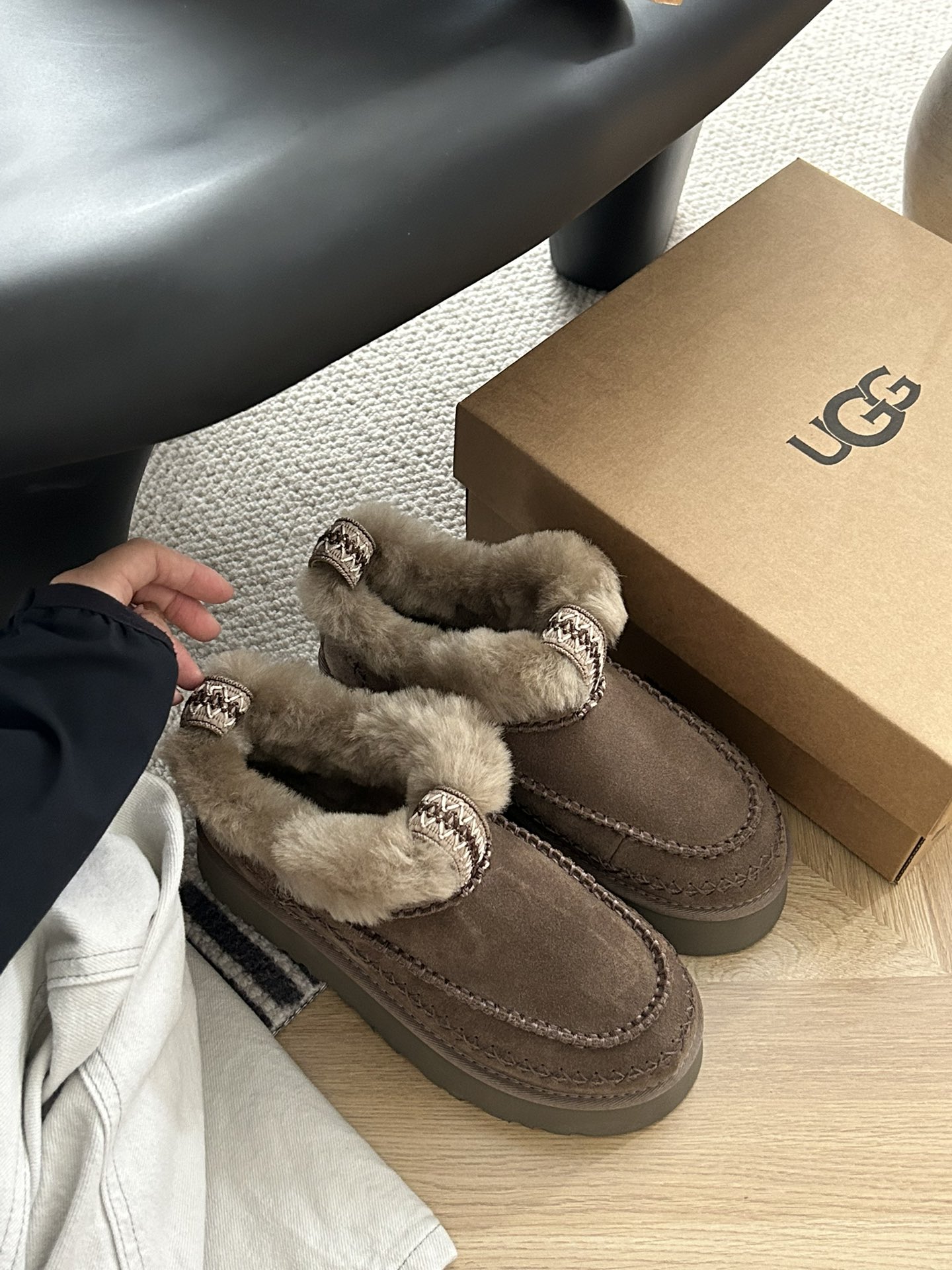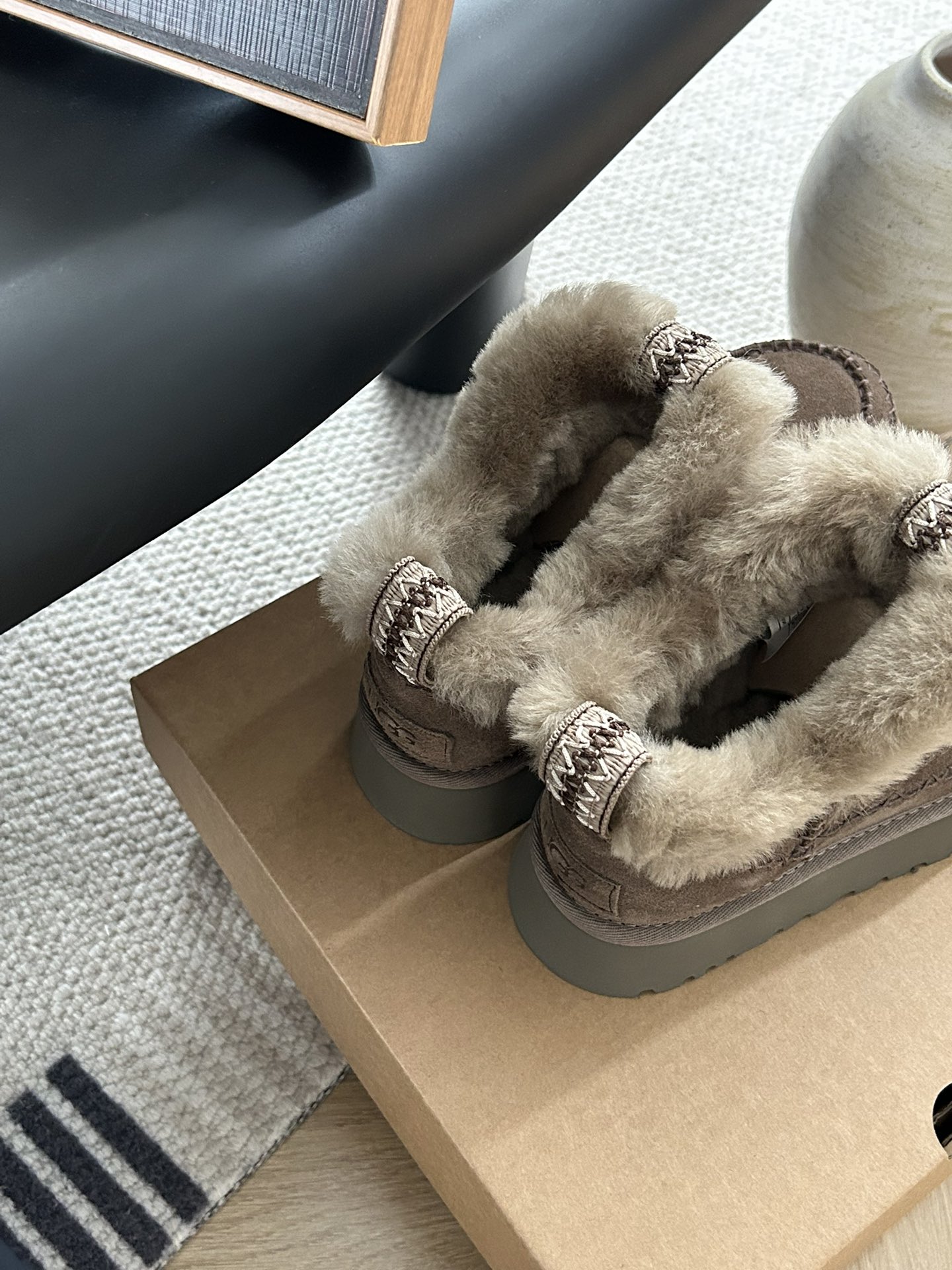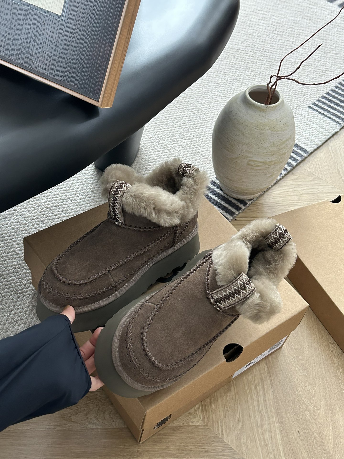 这款鞋子是AAAAA 1:1 质量 (非常棒). 使用了和原版一模一样的材料. 商标部分也保持了和UGG雪地靴一样. 图片拍摄是实物鞋子拍摄, 您所收到的实物保证和我们图片一模一样.