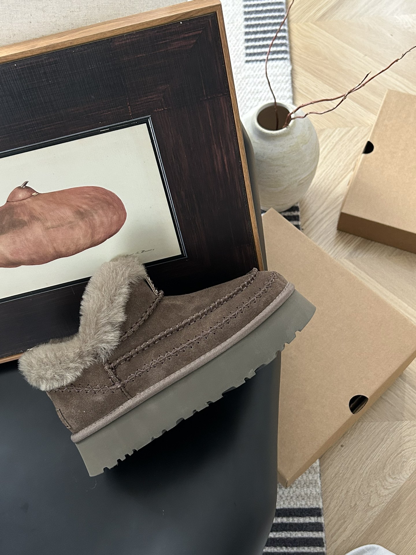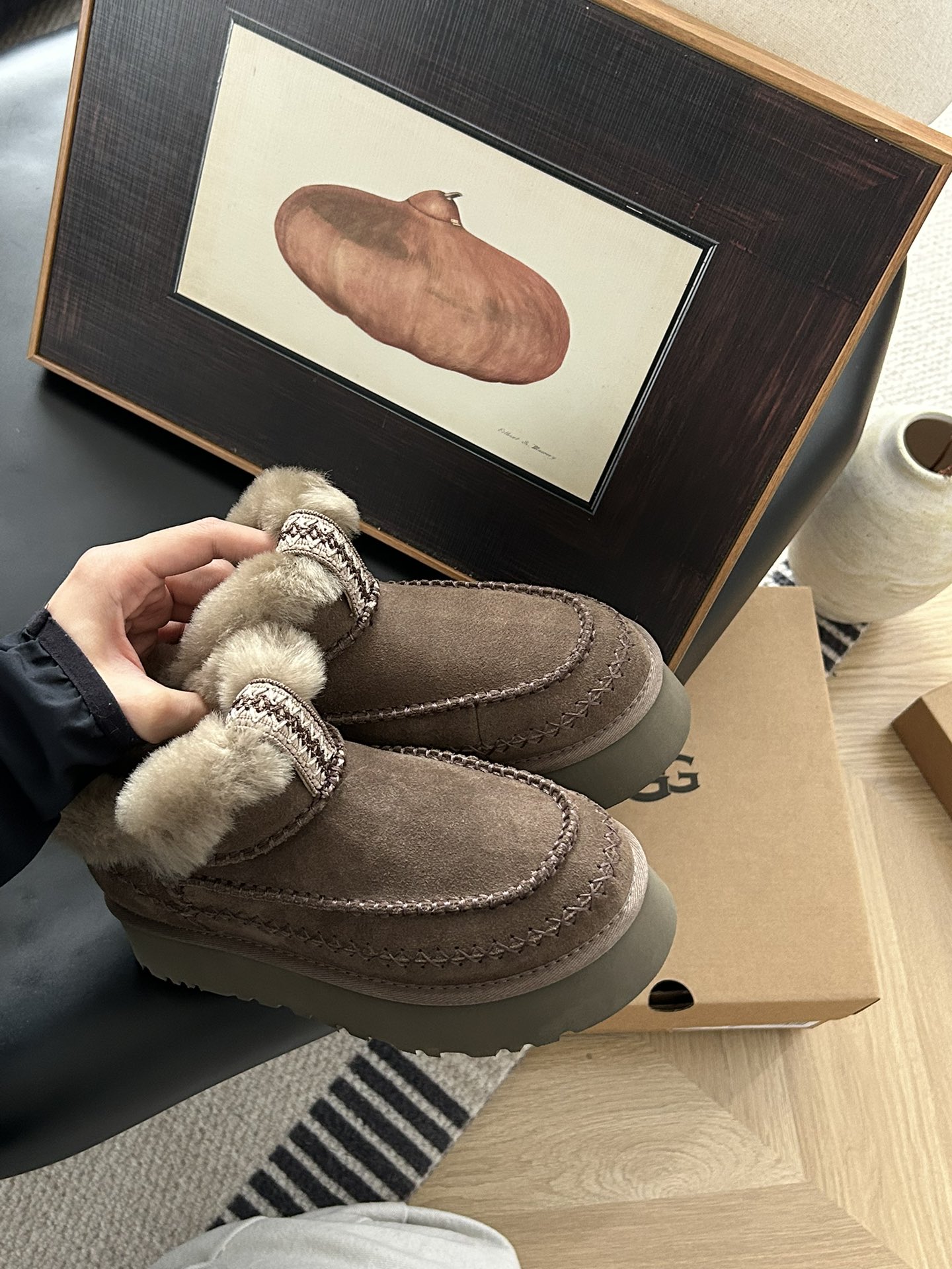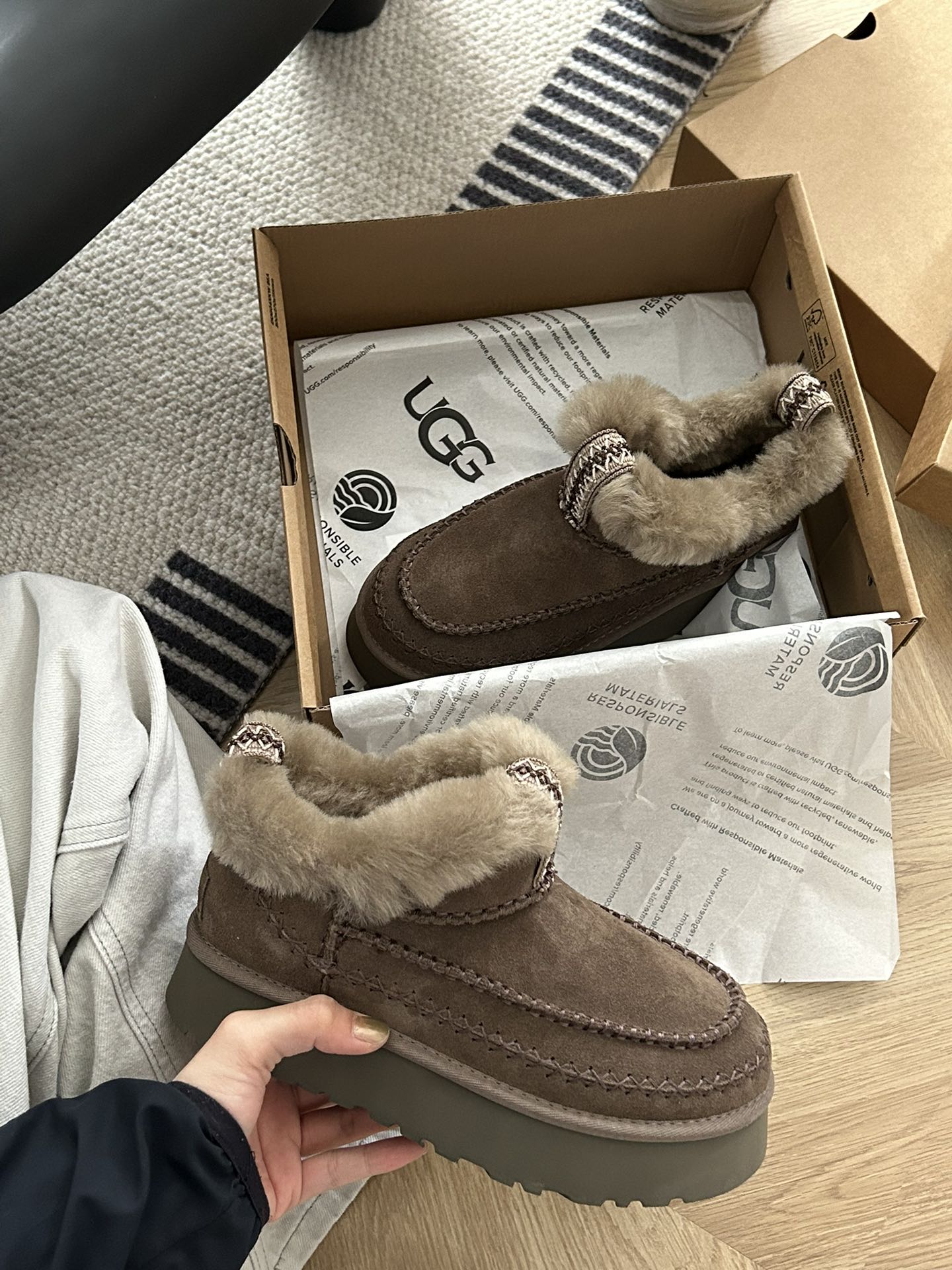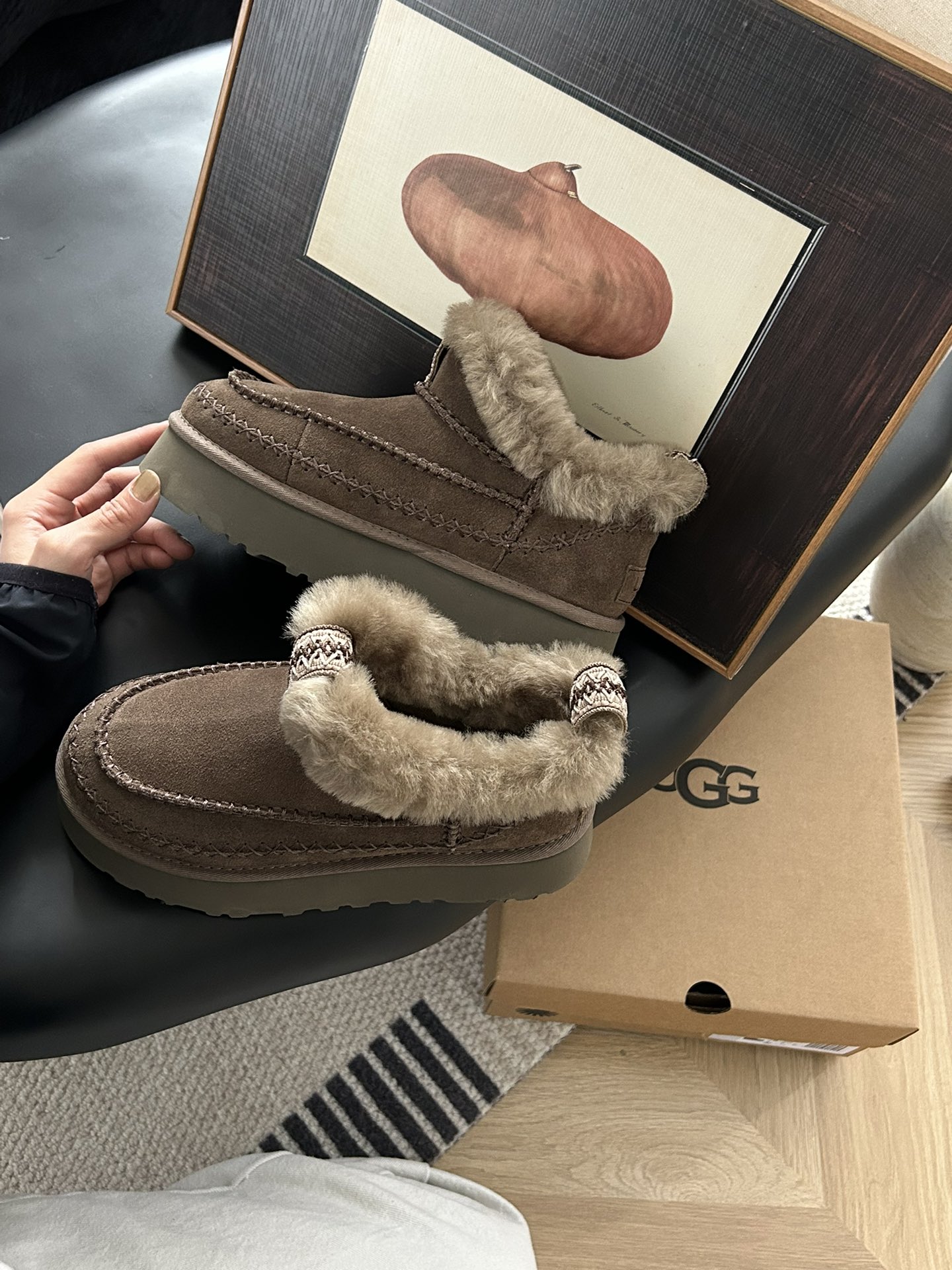 这款鞋子是AAAAA 1:1 质量 (非常棒). 使用了和原版一模一样的材料. 商标部分也保持了和UGG雪地靴一样. 图片拍摄是实物鞋子拍摄, 您所收到的实物保证和我们图片一模一样.
