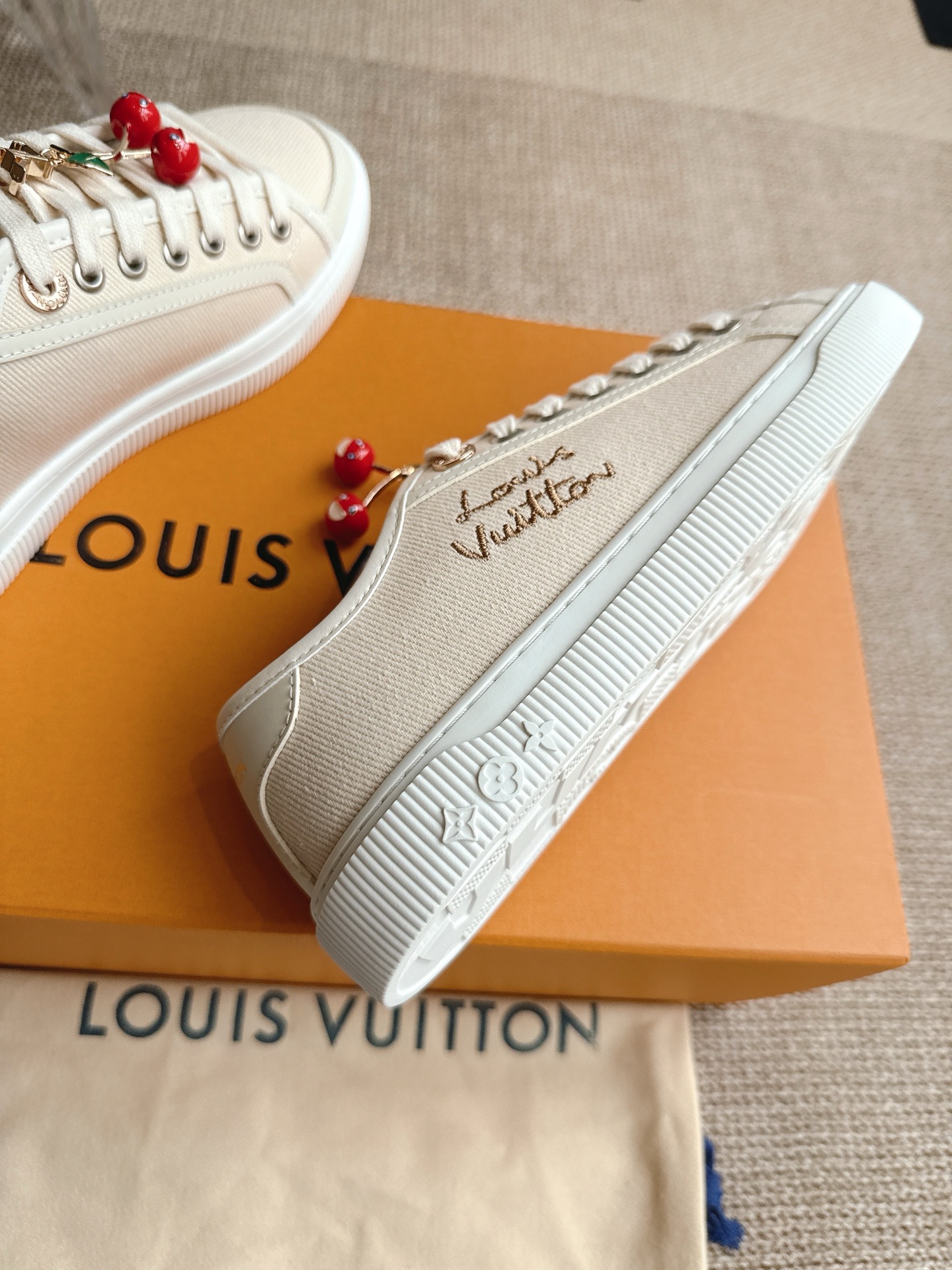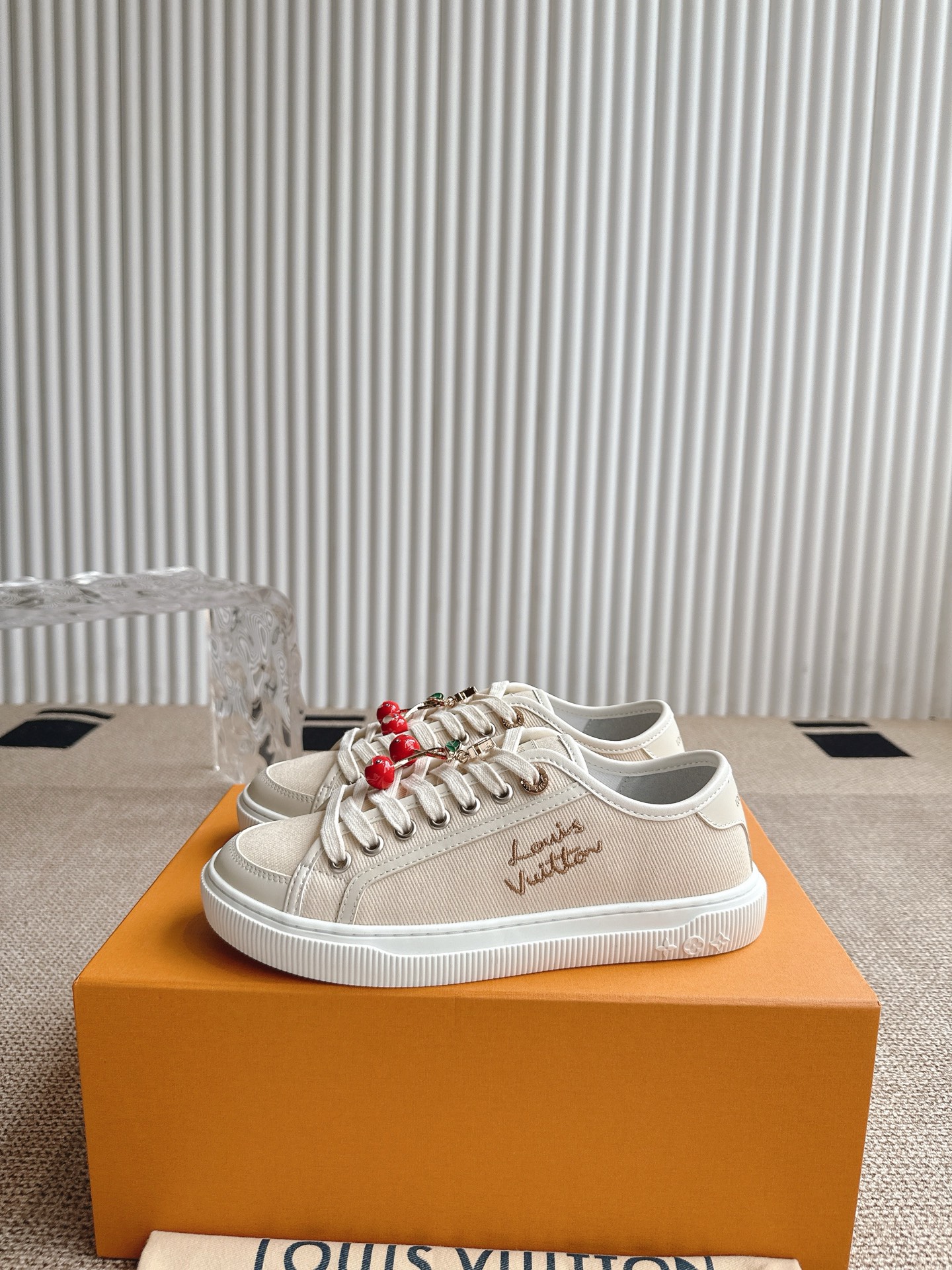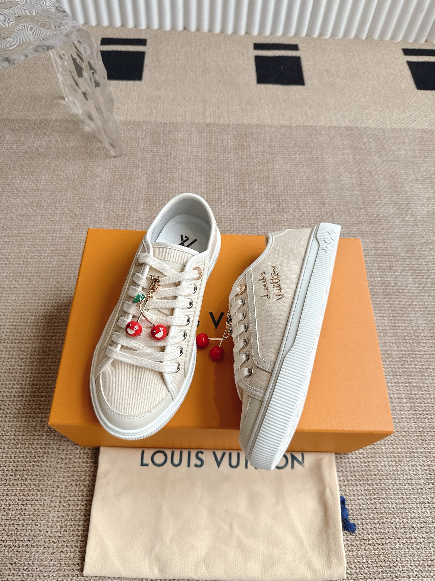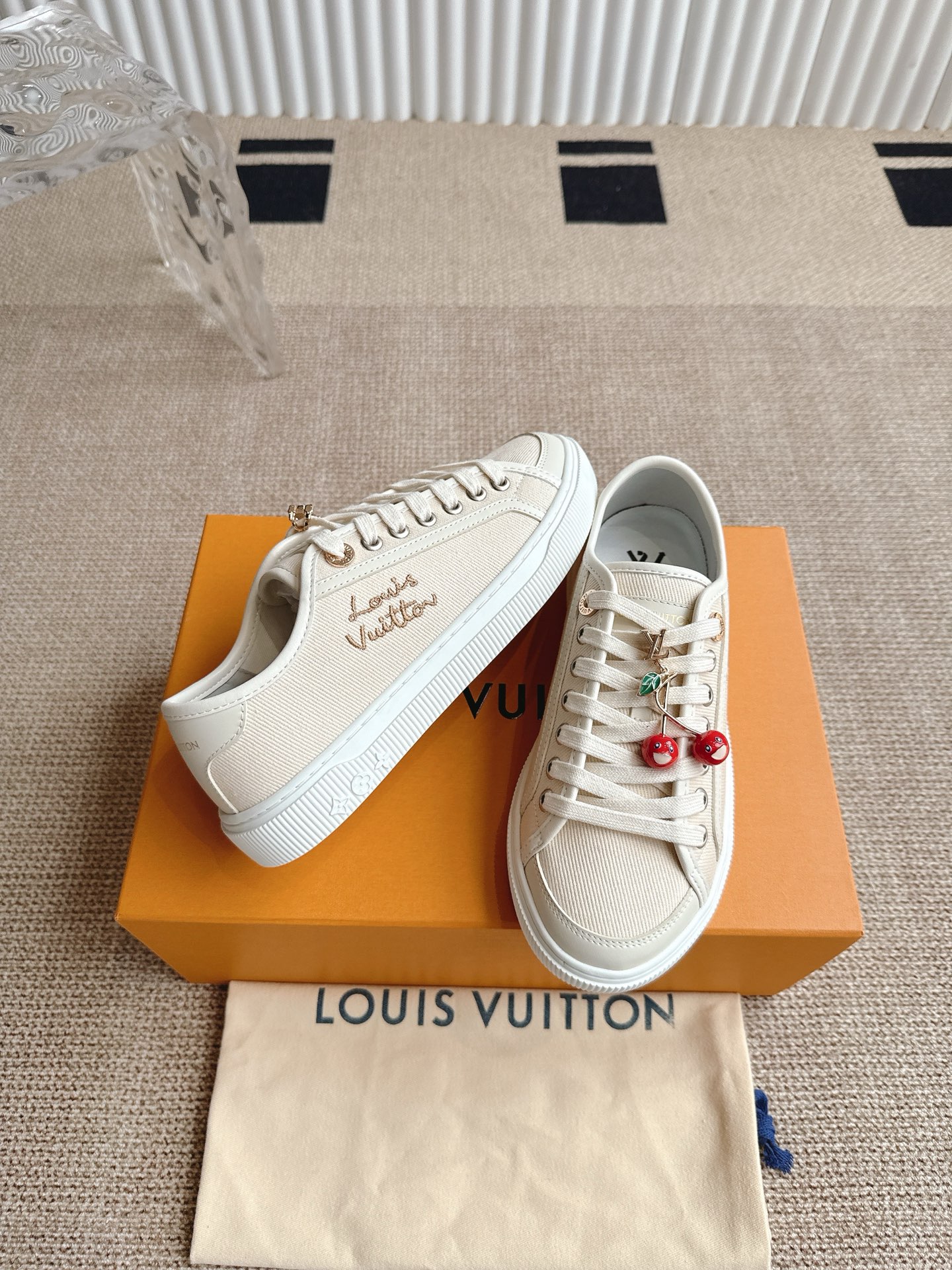 这款鞋子是AAAAA 1:1 质量 (非常棒). 使用了和原版一模一样的材料. 商标部分也保持了和路易威登/Louis Vuitton一样. 图片拍摄是实物鞋子拍摄, 您所收到的实物保证和我们图片一模一样.