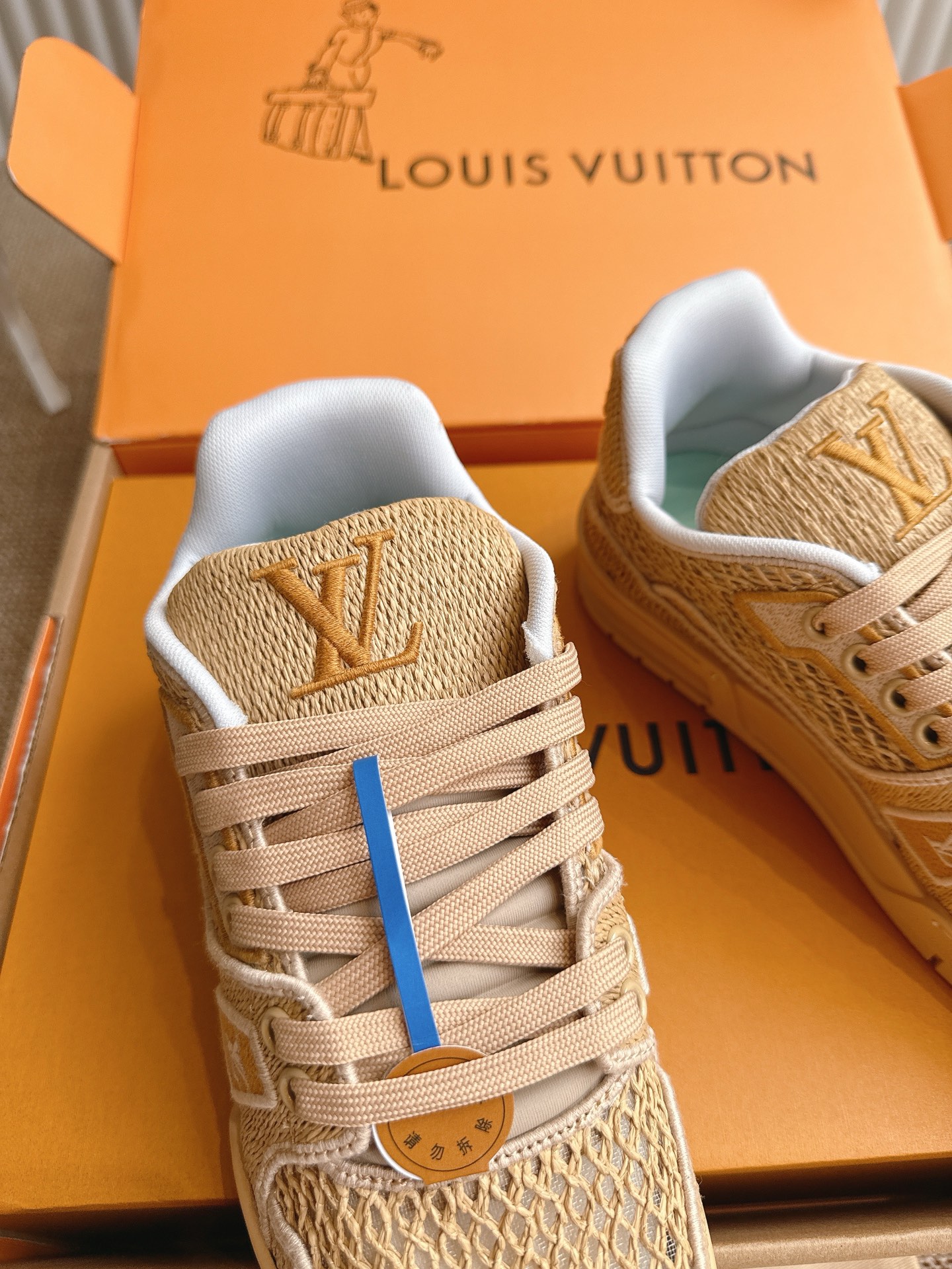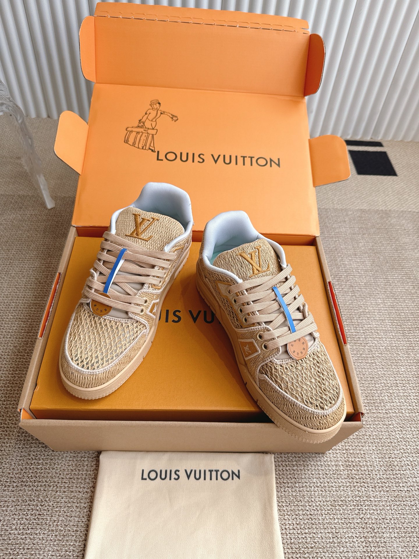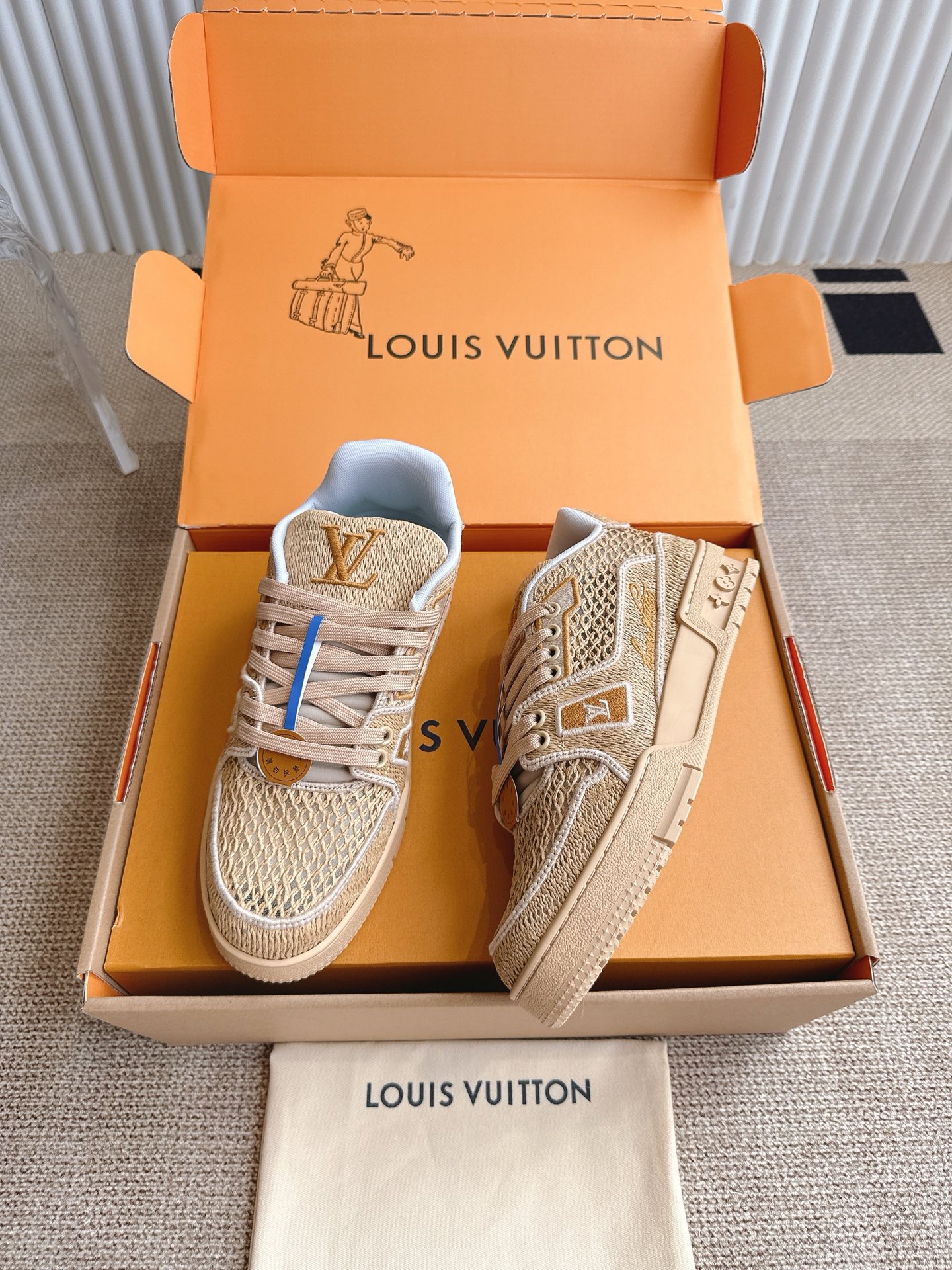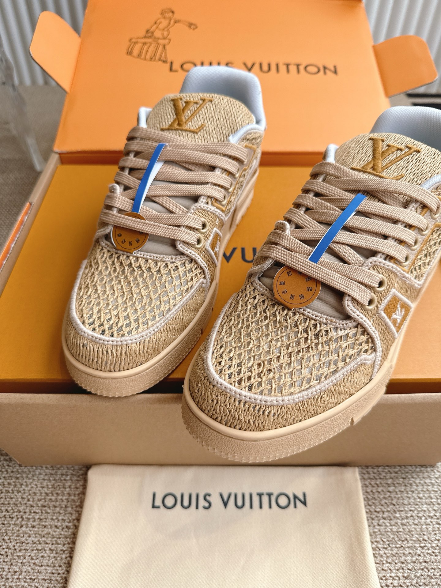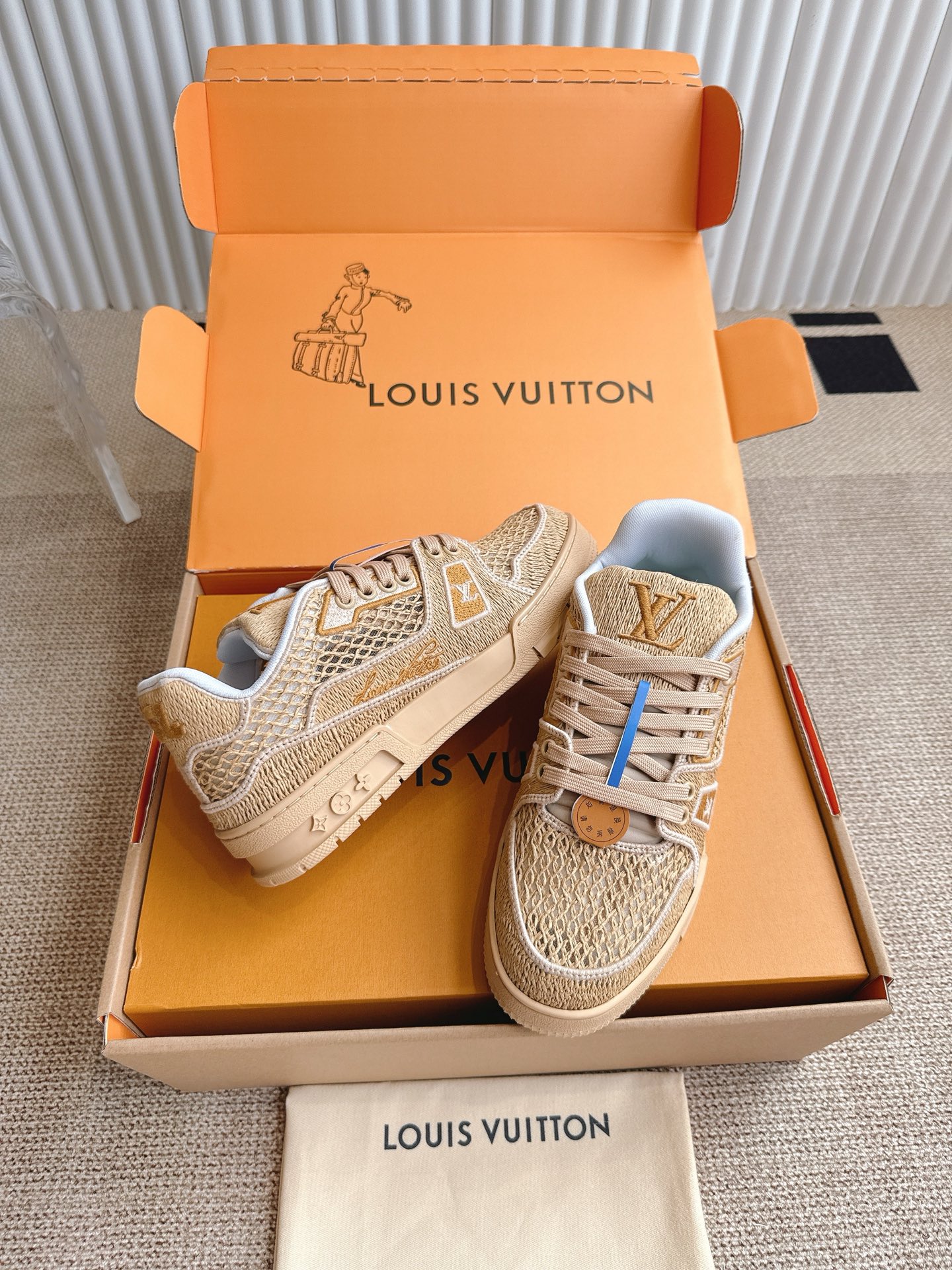 这款鞋子是AAAAA 1:1 质量 (非常棒). 使用了和原版一模一样的材料. 商标部分也保持了和路易威登/Louis Vuitton一样. 图片拍摄是实物鞋子拍摄, 您所收到的实物保证和我们图片一模一样.