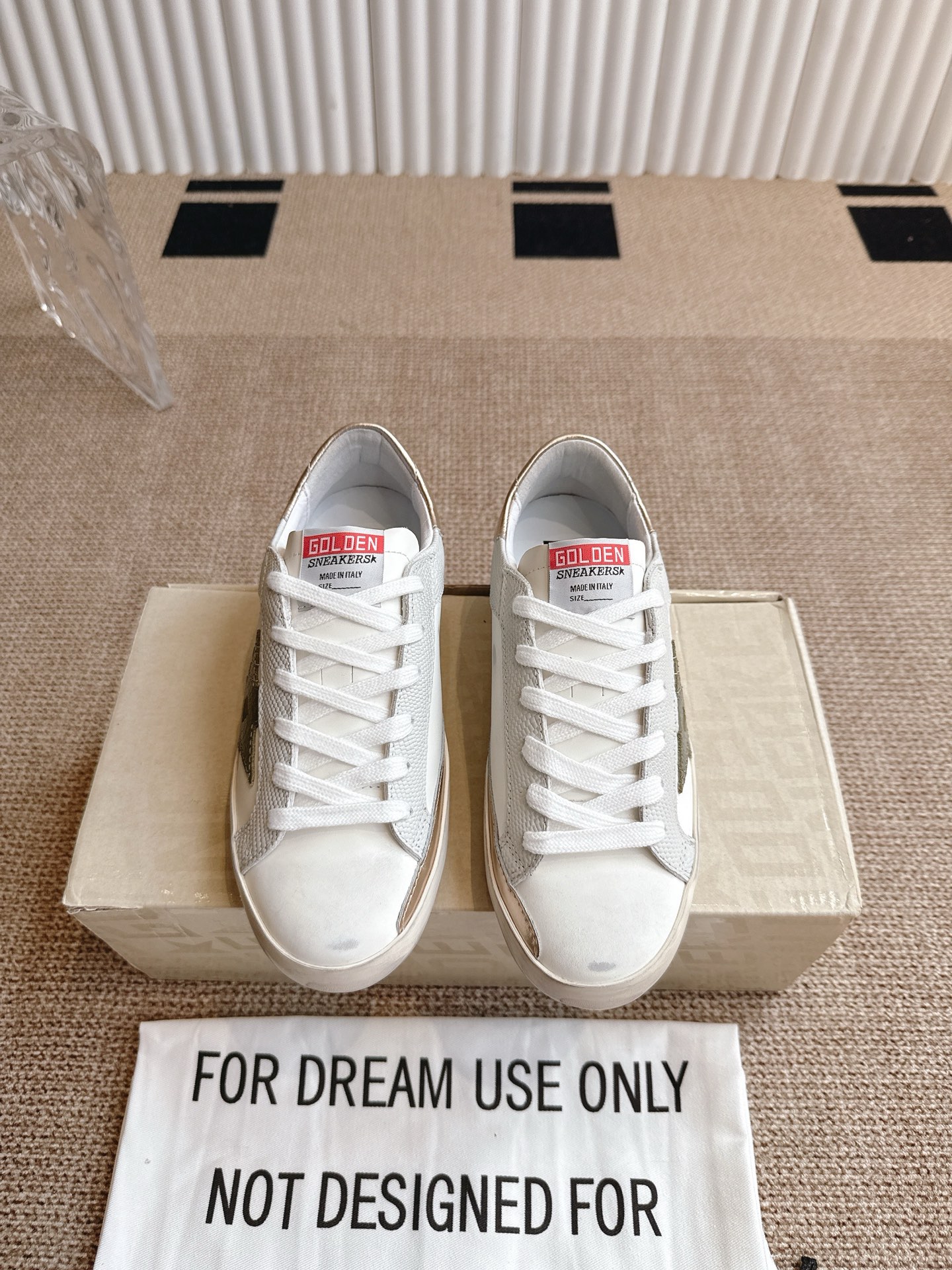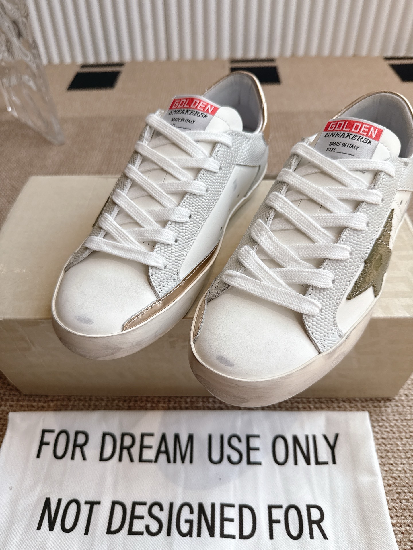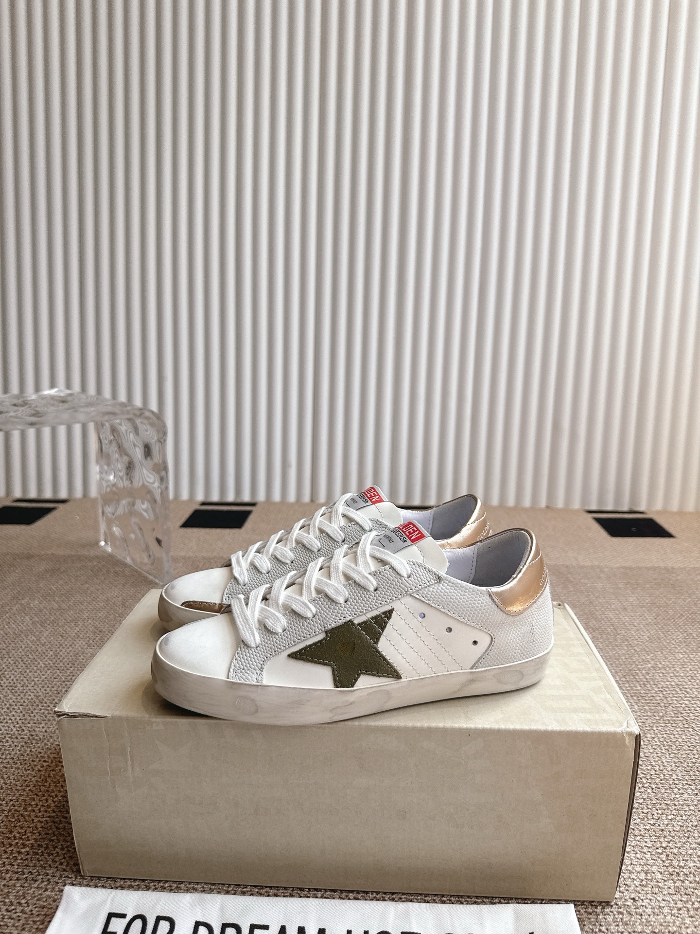 这款鞋子是AAAAA 1:1 质量 (非常棒). 使用了和原版一模一样的材料. 商标部分也保持了和Golden Goose一样. 图片拍摄是实物鞋子拍摄, 您所收到的实物保证和我们图片一模一样.