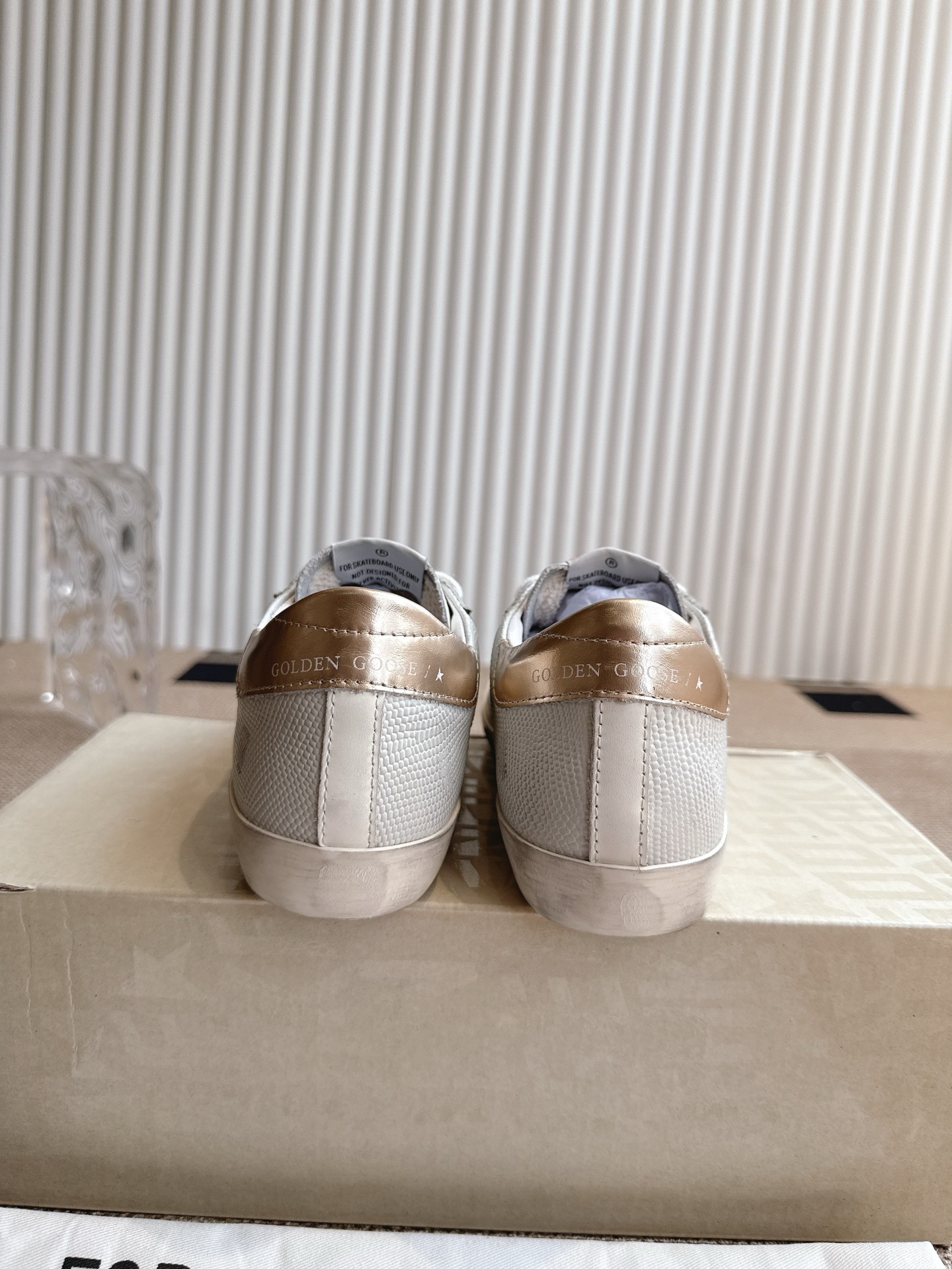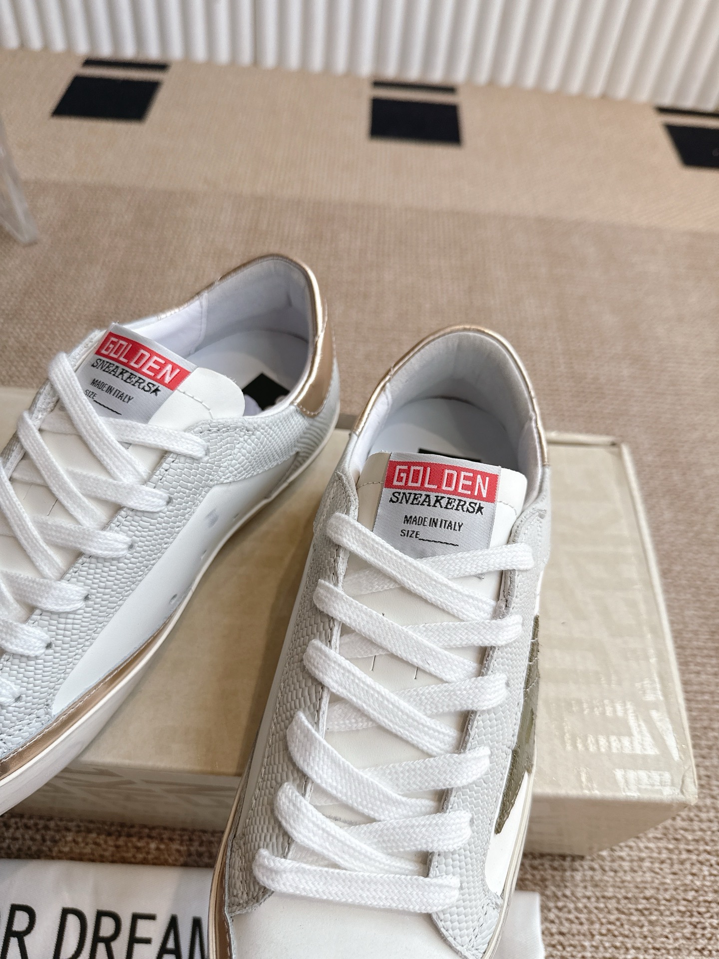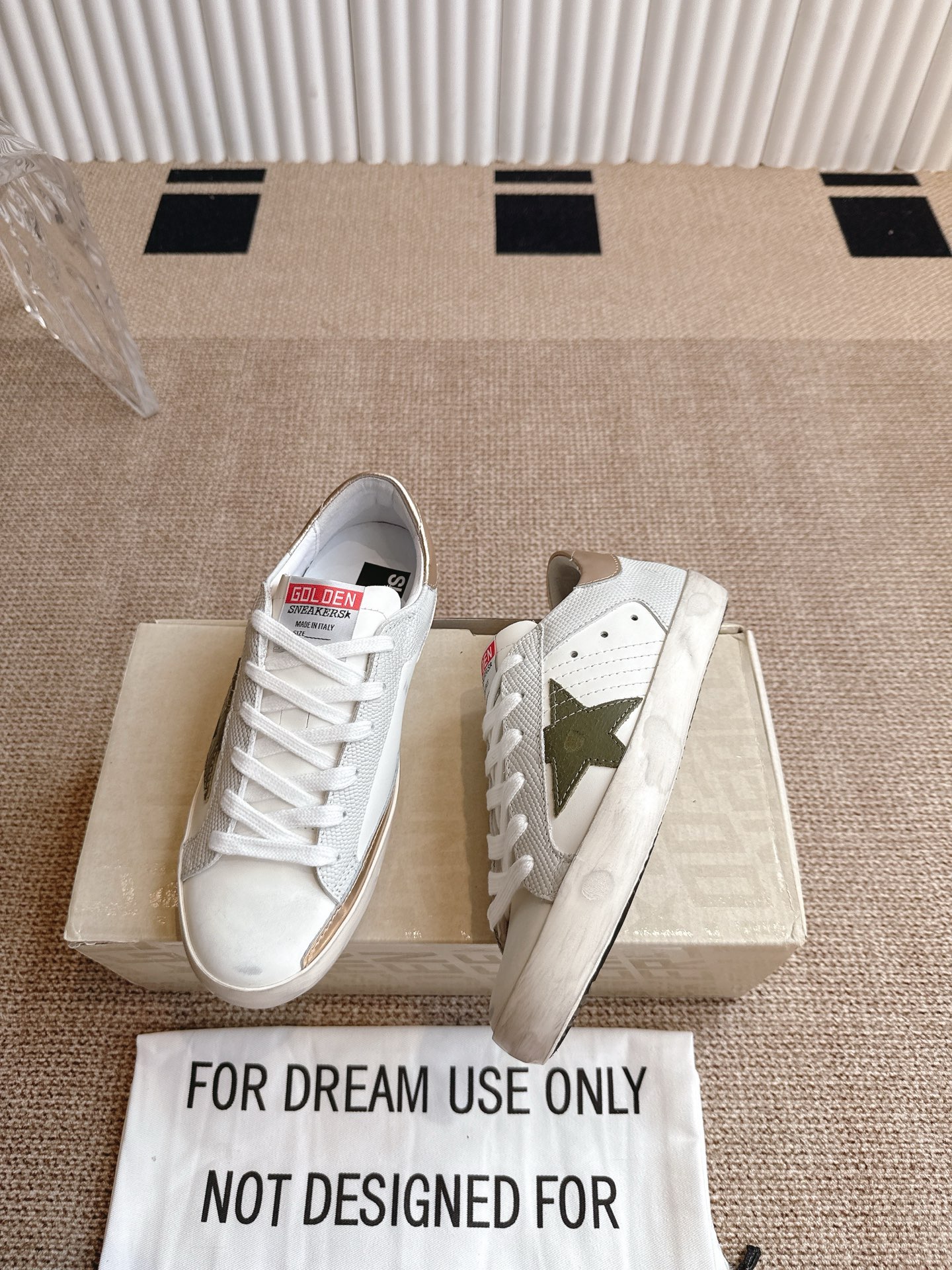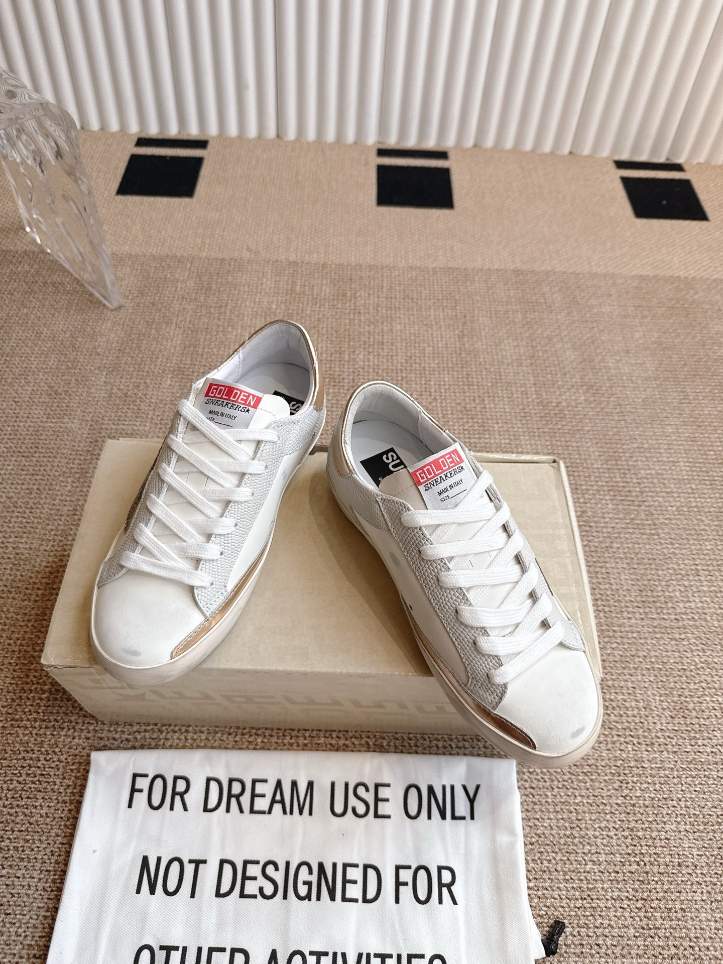 这款鞋子是AAAAA 1:1 质量 (非常棒). 使用了和原版一模一样的材料. 商标部分也保持了和Golden Goose一样. 图片拍摄是实物鞋子拍摄, 您所收到的实物保证和我们图片一模一样.