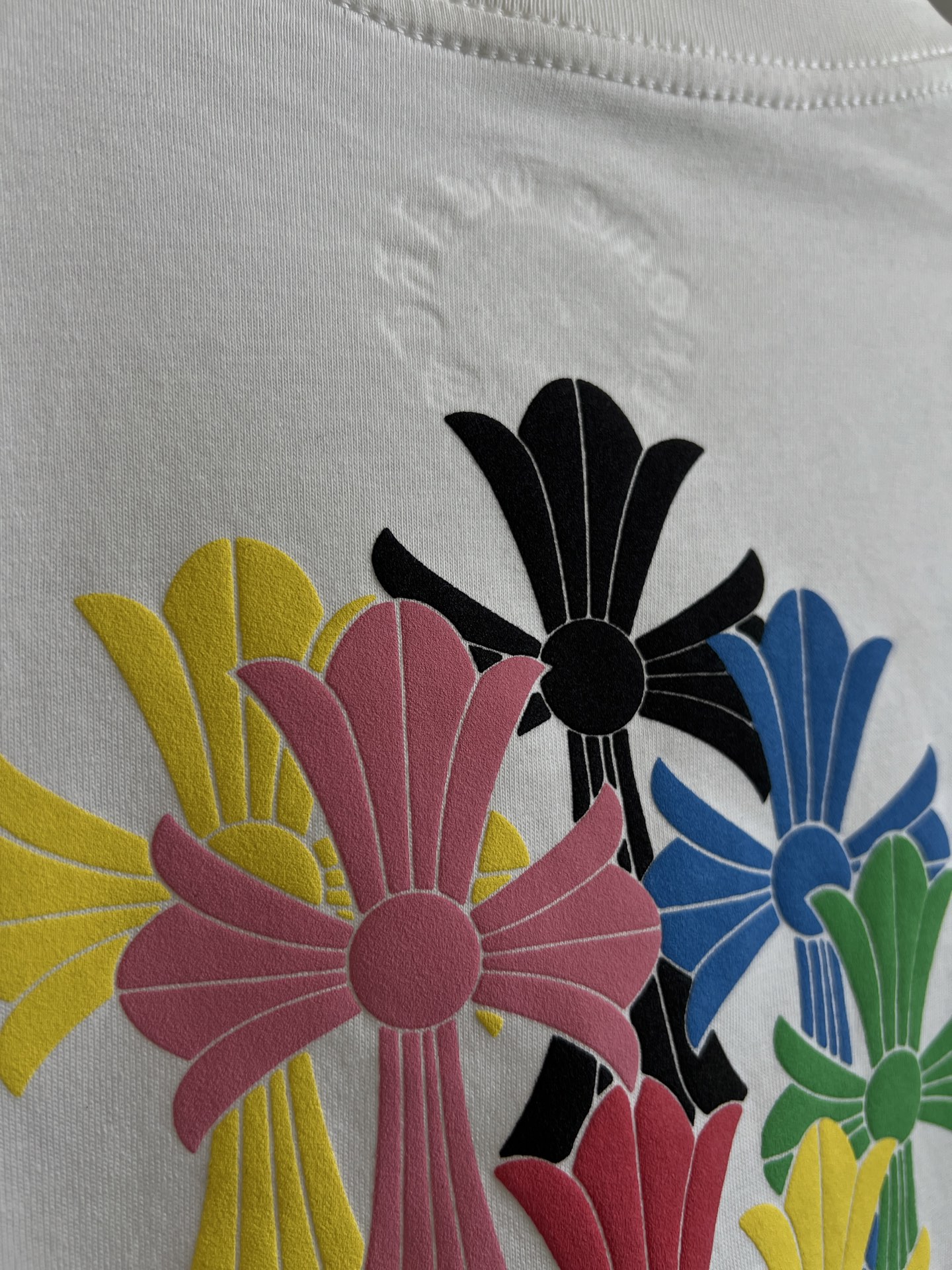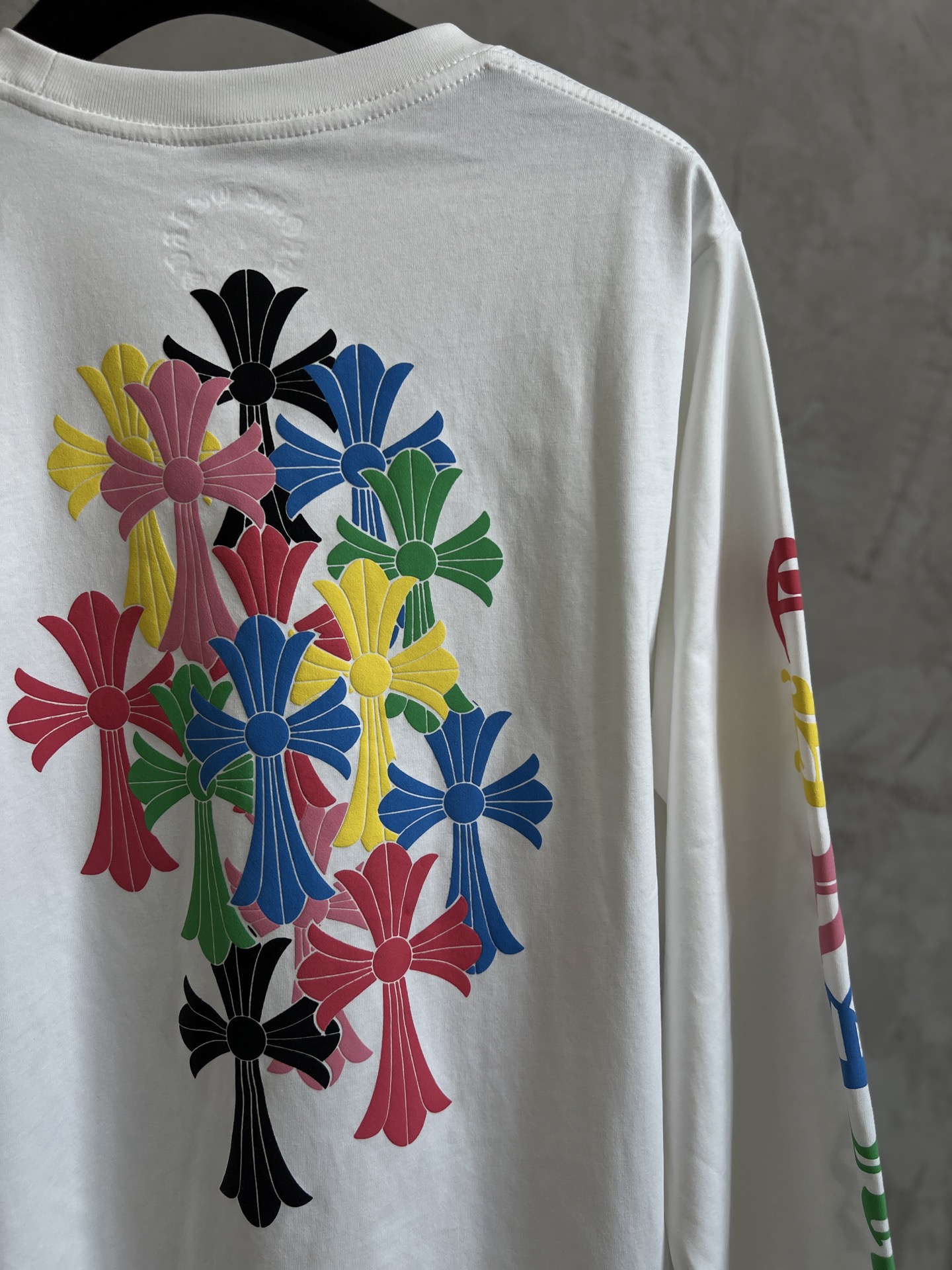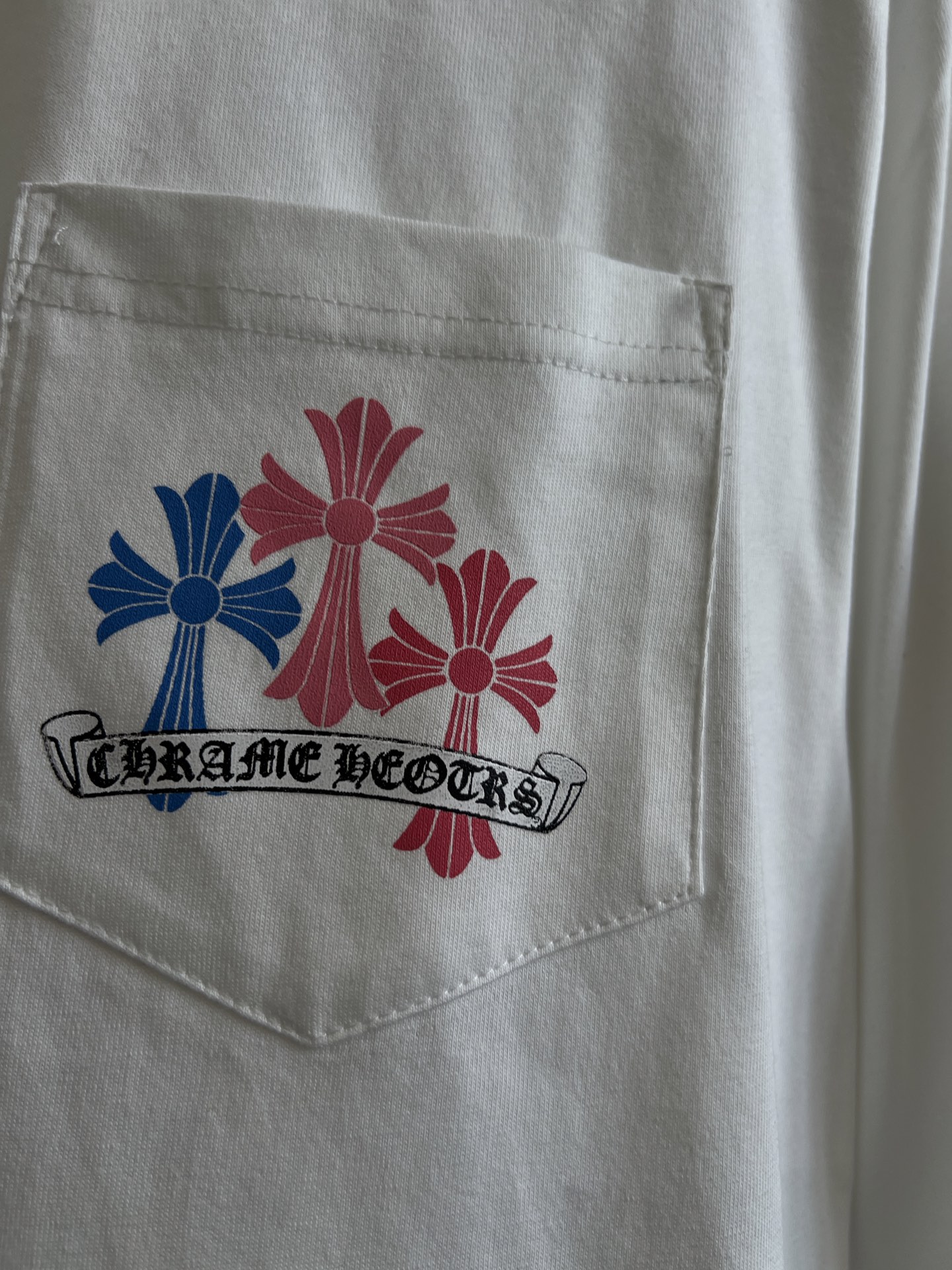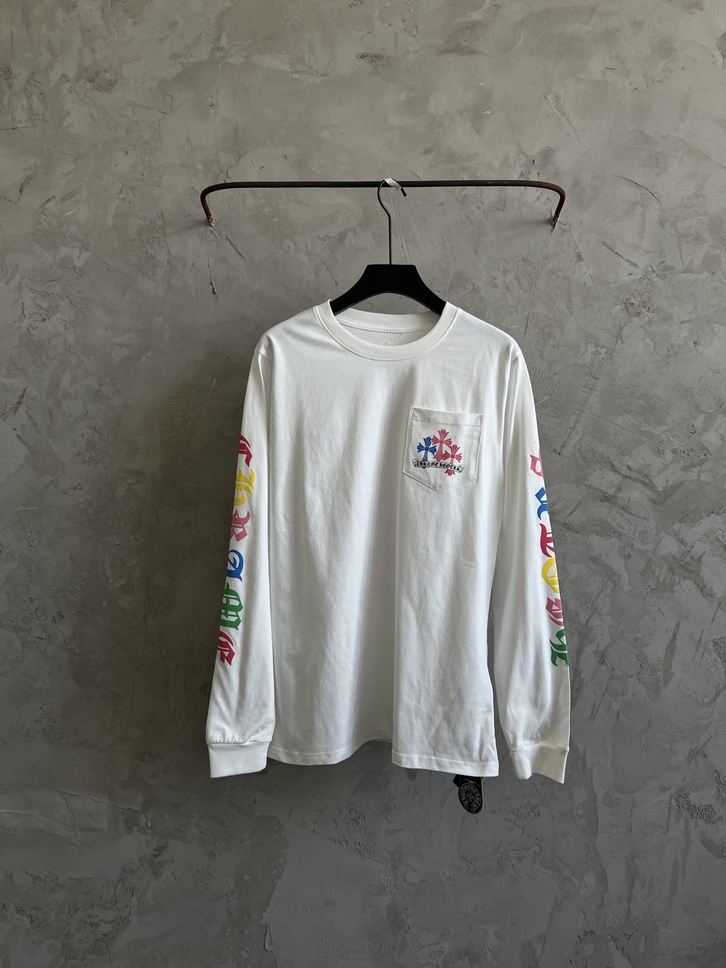 这款衣服是AAAAA 1:1 质量 (非常棒). 使用了和原版一模一样的材料. 商标部分也保持了和克罗心/Chrome Hearts一样. 图片拍摄是实物衣服拍摄, 您所收到的实物保证和我们图片一模一样.