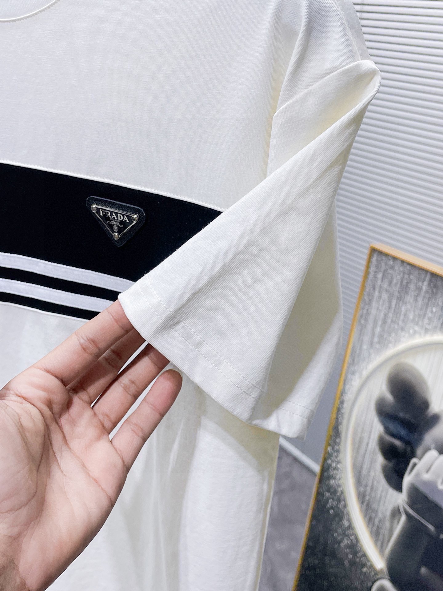 这款衣服是AAAAA 1:1 质量 (非常棒). 使用了和原版一模一样的材料. 商标部分也保持了和普拉达/Prada一样. 图片拍摄是实物衣服拍摄, 您所收到的实物保证和我们图片一模一样.