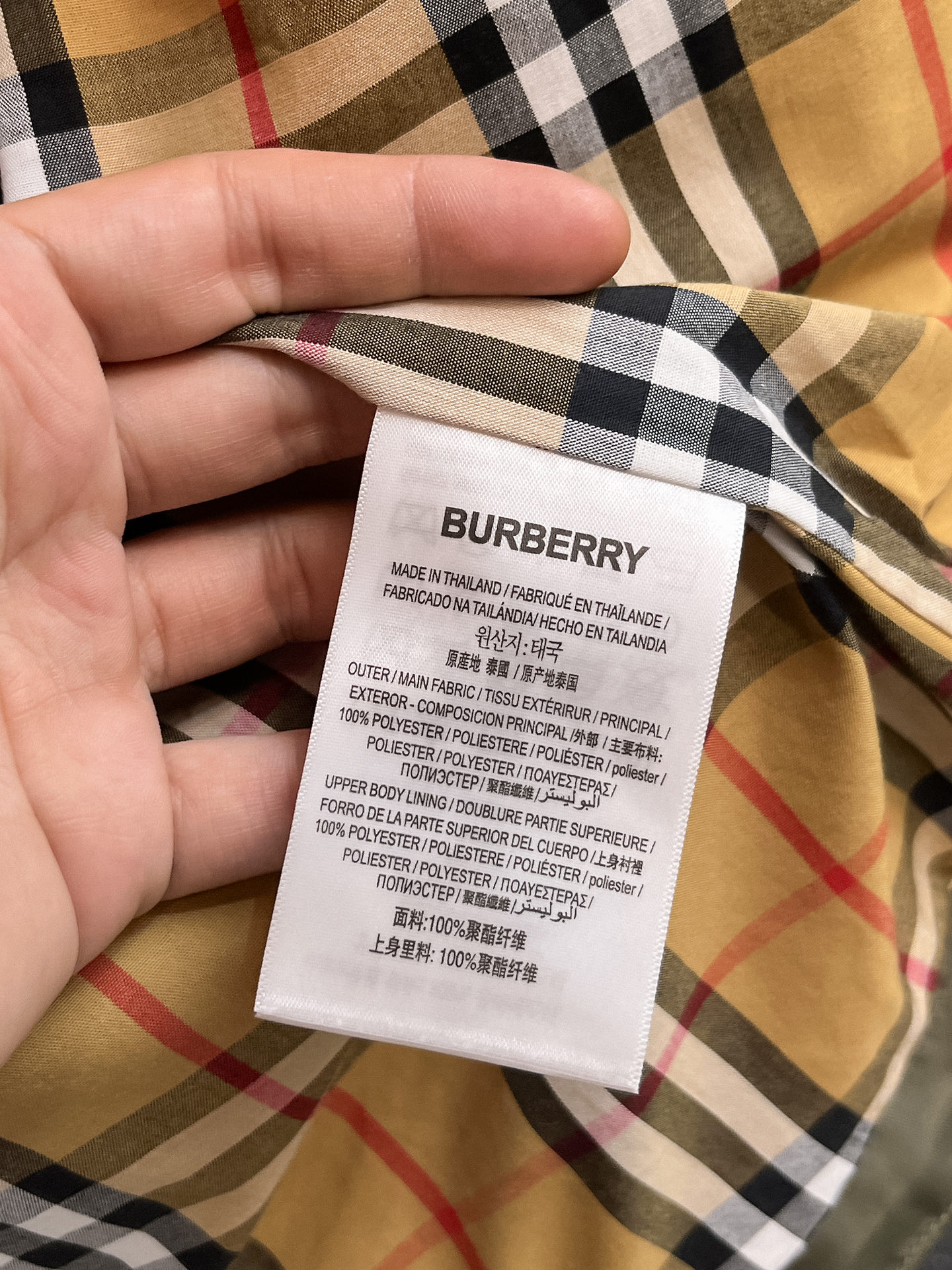 这款衣服是AAAAA 1:1 质量 (非常棒). 使用了和原版一模一样的材料. 商标部分也保持了和巴宝莉/Burberry一样. 图片拍摄是实物衣服拍摄, 您所收到的实物保证和我们图片一模一样.