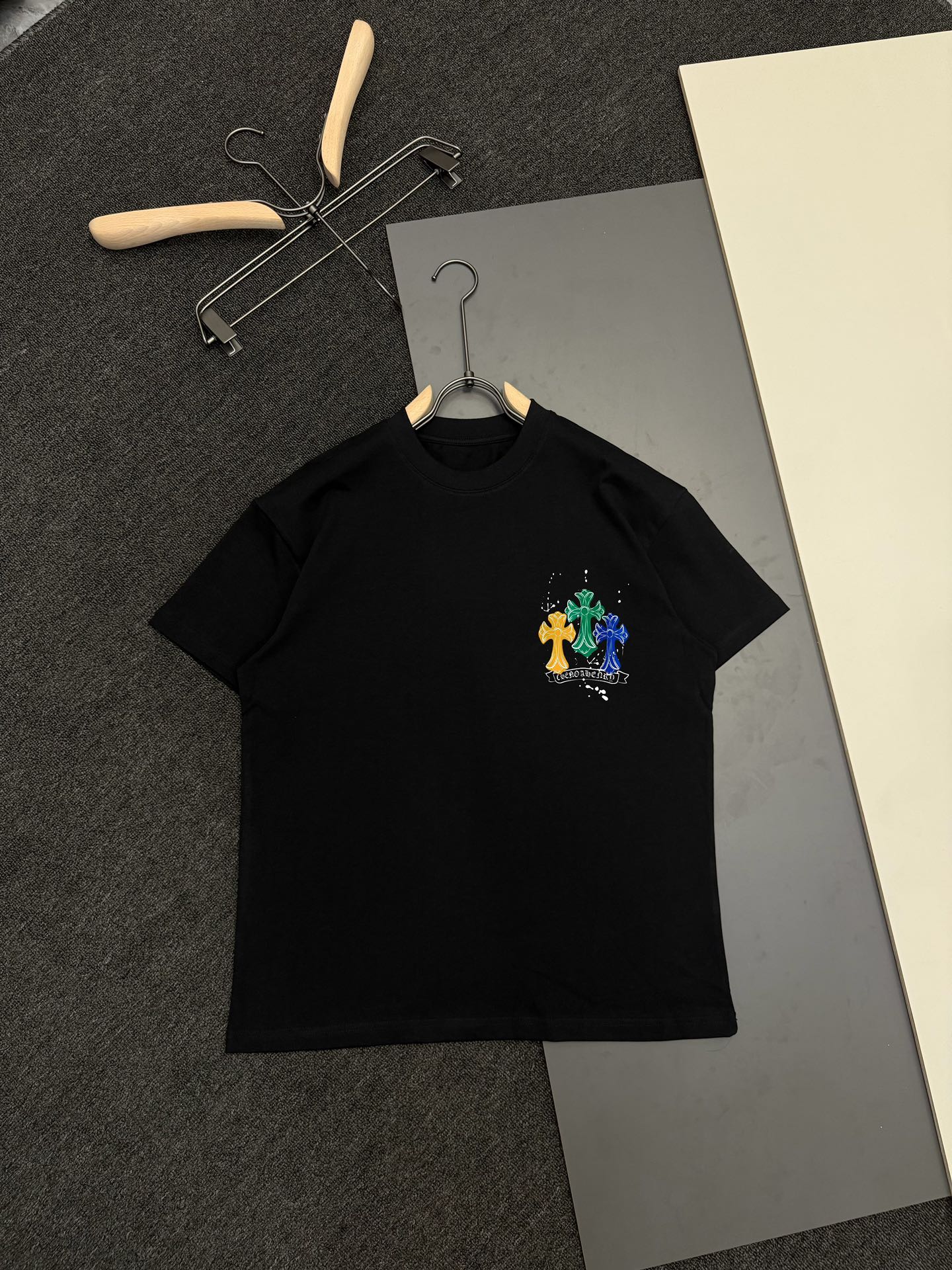 这款衣服是AAAAA 1:1 质量 (非常棒). 使用了和原版一模一样的材料. 商标部分也保持了和克罗心/Chrome Hearts一样. 图片拍摄是实物衣服拍摄, 您所收到的实物保证和我们图片一模一样.