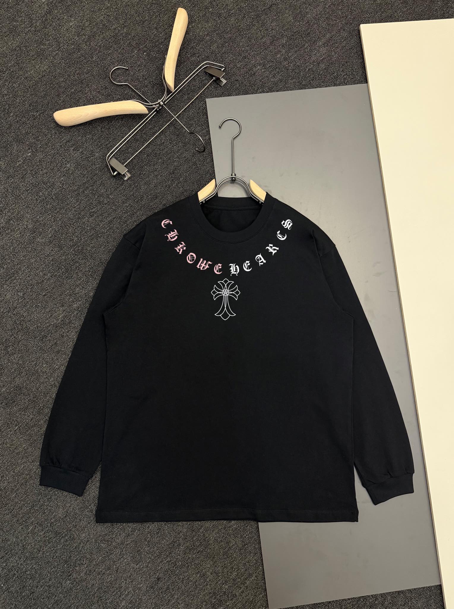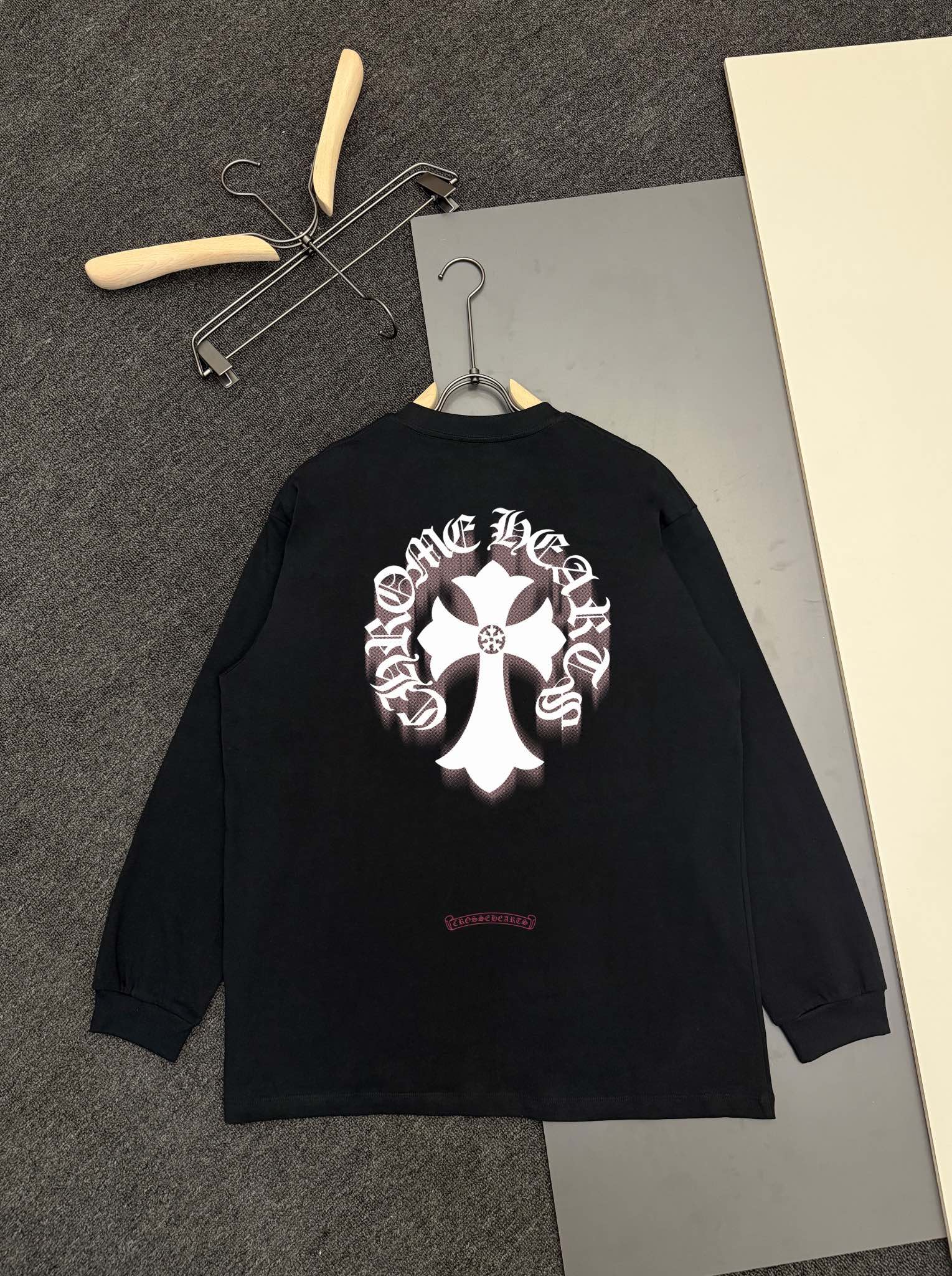 这款衣服是AAAAA 1:1 质量 (非常棒). 使用了和原版一模一样的材料. 商标部分也保持了和克罗心/Chrome Hearts一样. 图片拍摄是实物衣服拍摄, 您所收到的实物保证和我们图片一模一样.