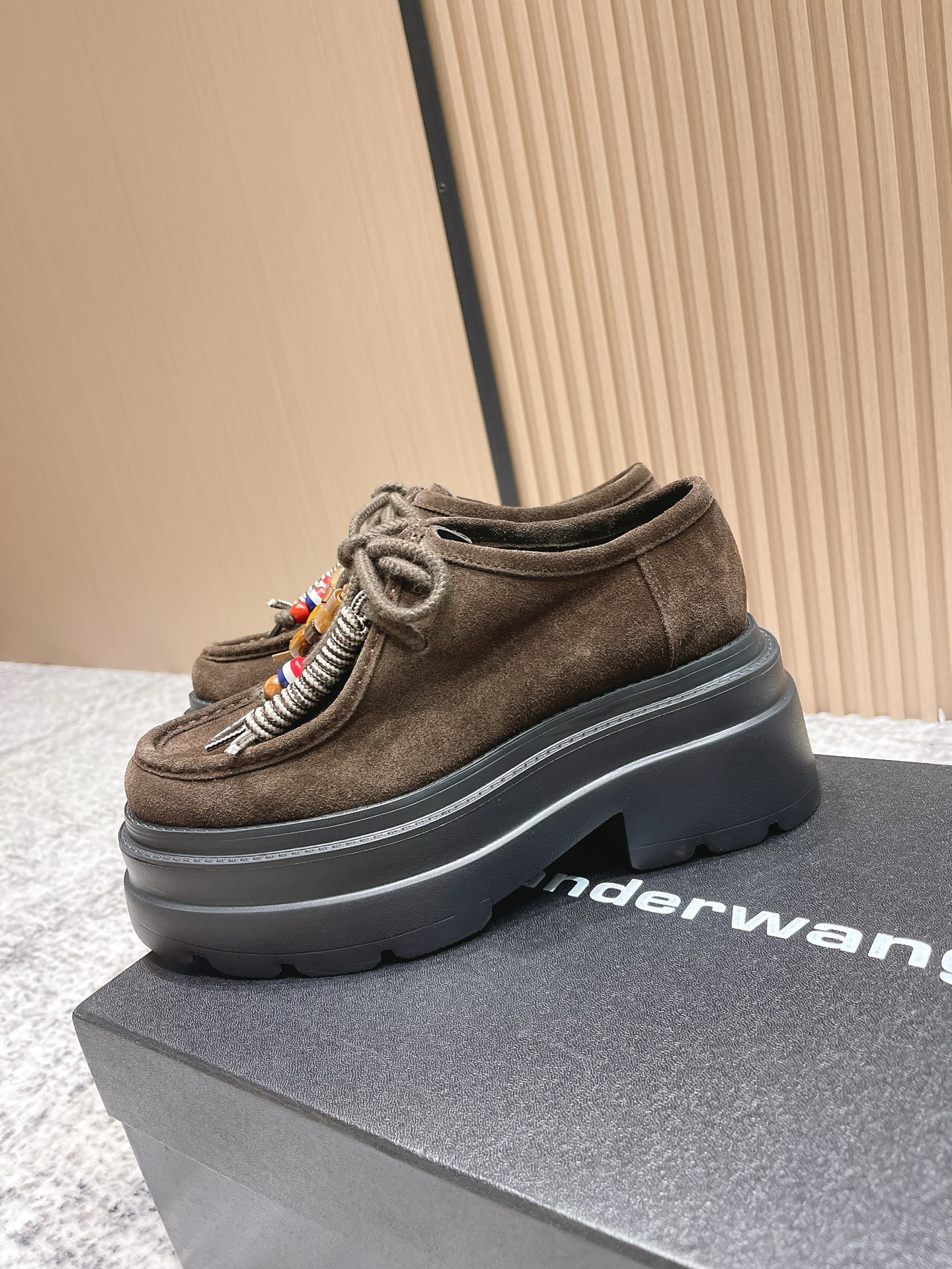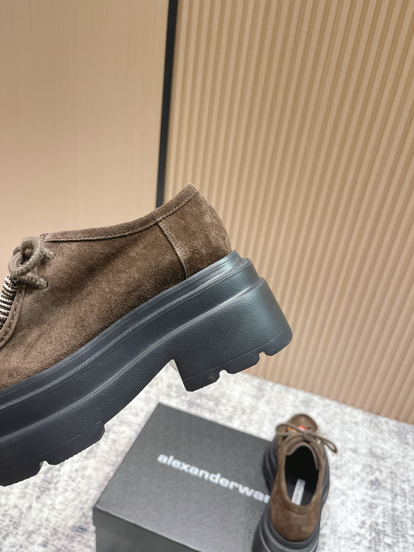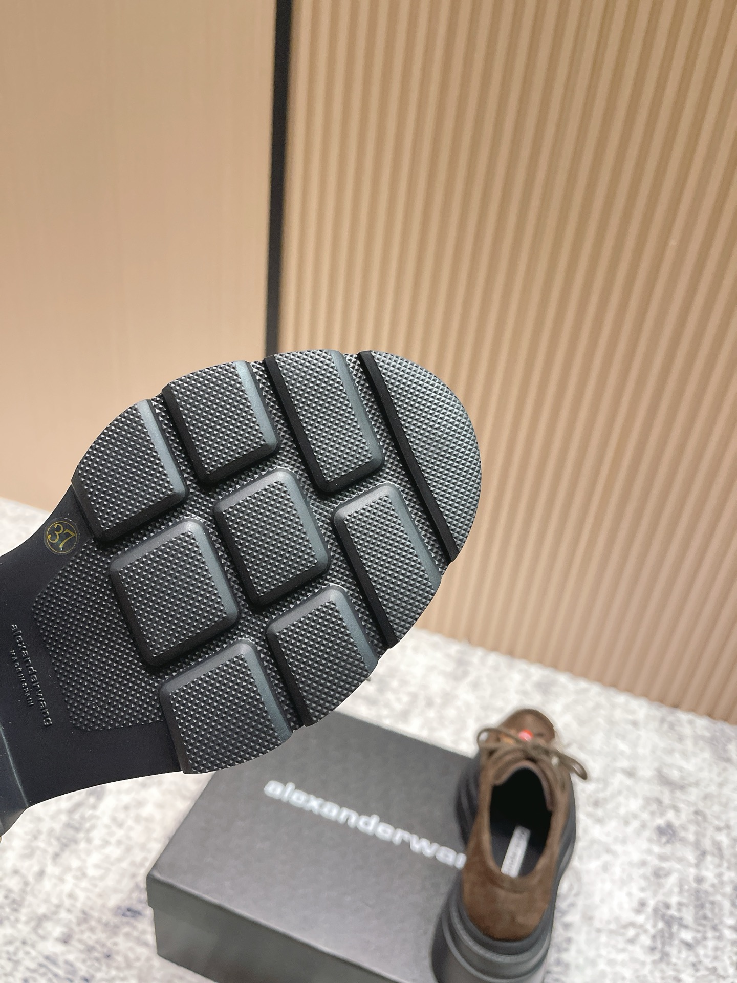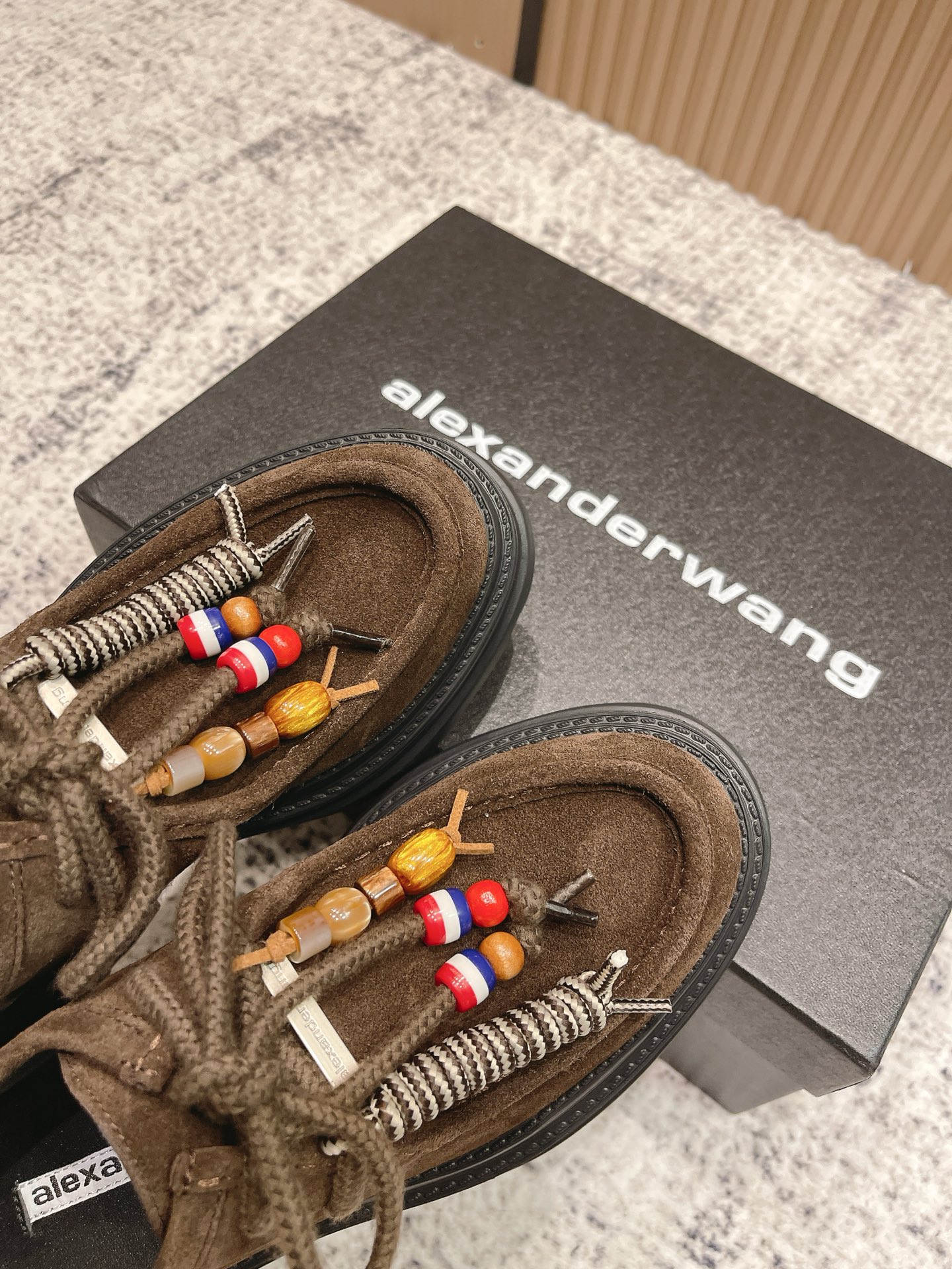 这款鞋子是AAAAA 1:1 质量 (非常棒). 使用了和原版一模一样的材料. 商标部分也保持了和亚历山大王/Alexander Wang一样. 图片拍摄是实物鞋子拍摄, 您所收到的实物保证和我们图片一模一样.