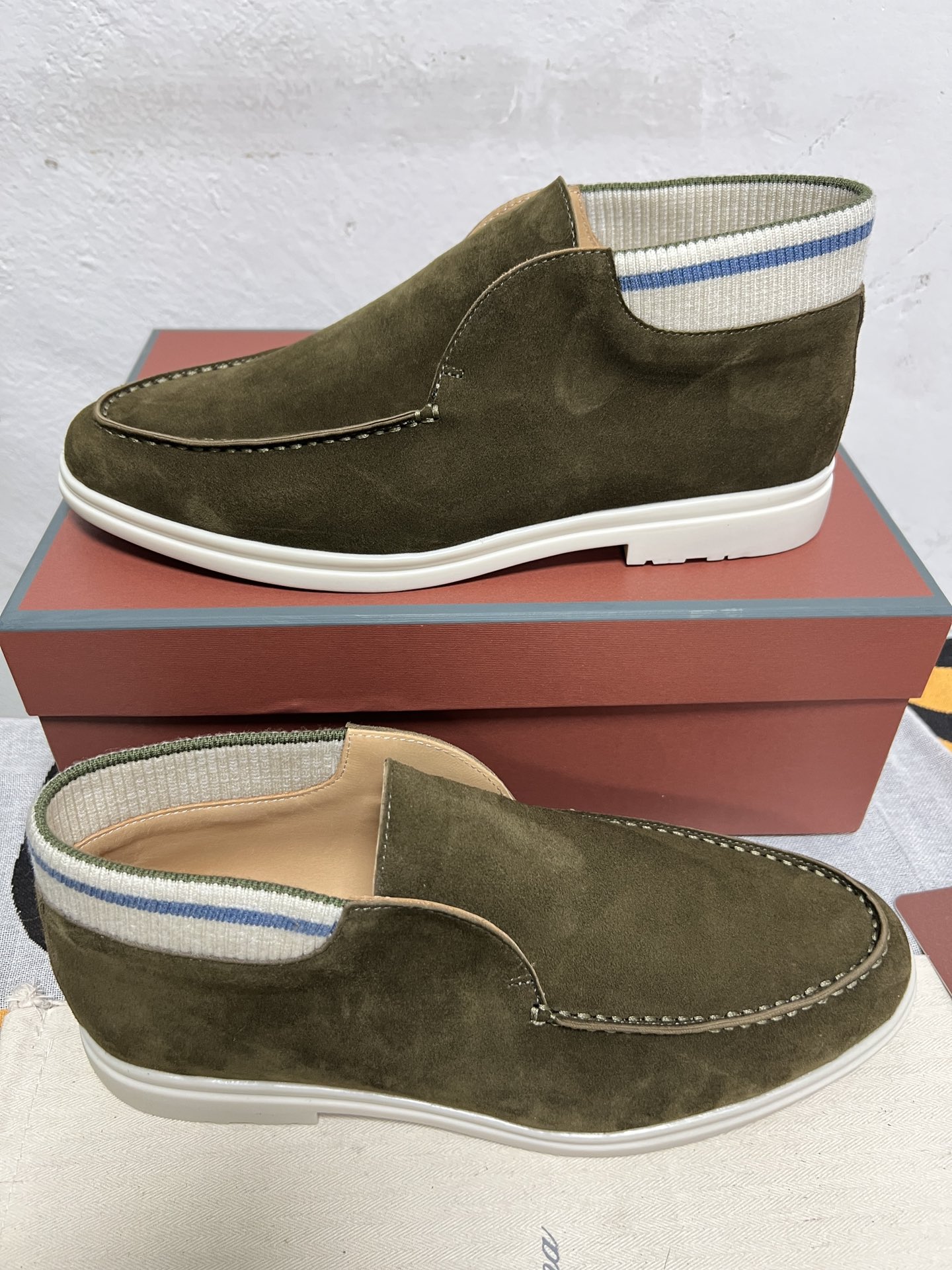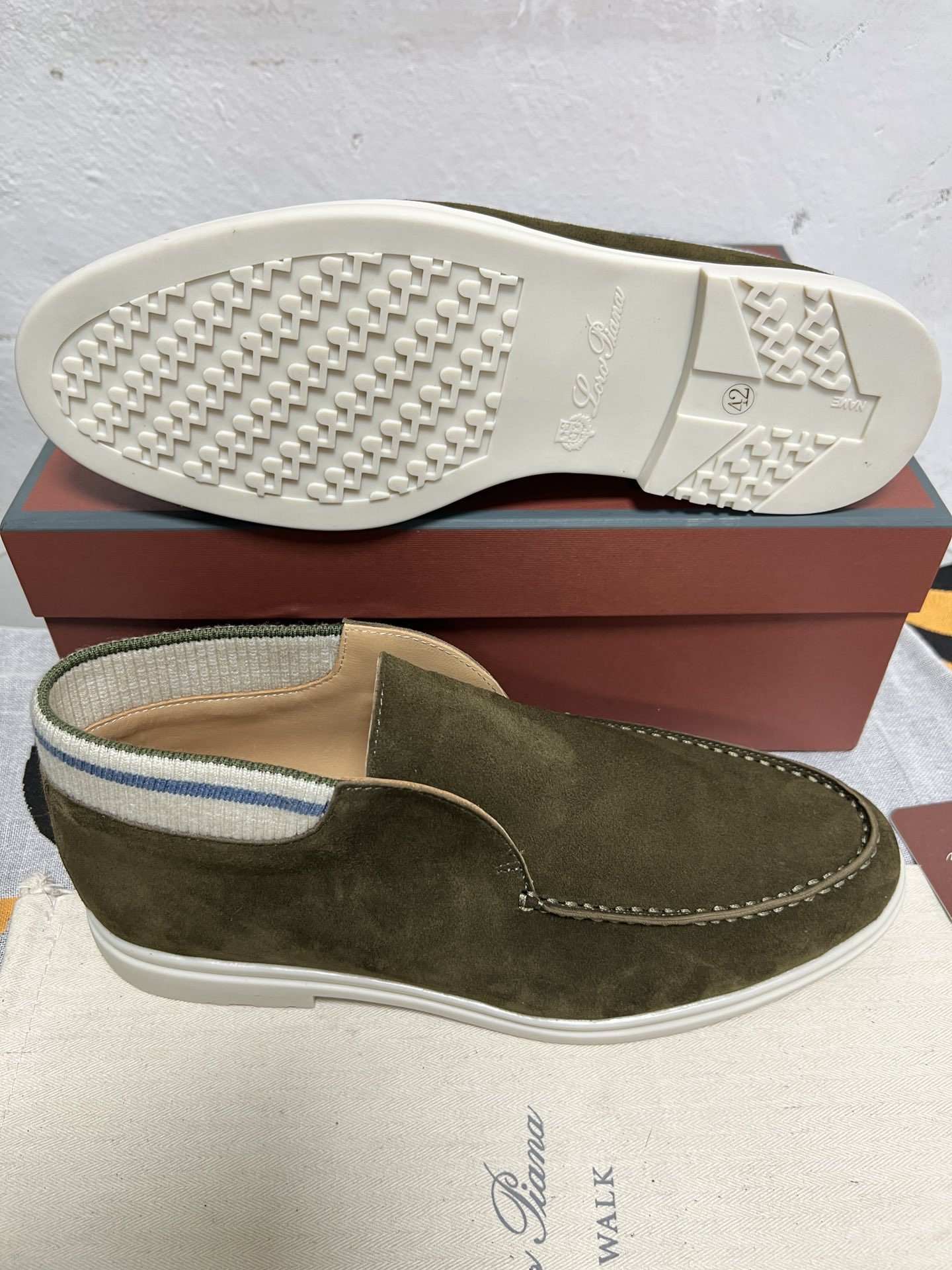 这款鞋子是AAAAA 1:1 质量 (非常棒). 使用了和原版一模一样的材料. 商标部分也保持了和洛罗皮亚纳/Loro Piana一样. 图片拍摄是实物鞋子拍摄, 您所收到的实物保证和我们图片一模一样.