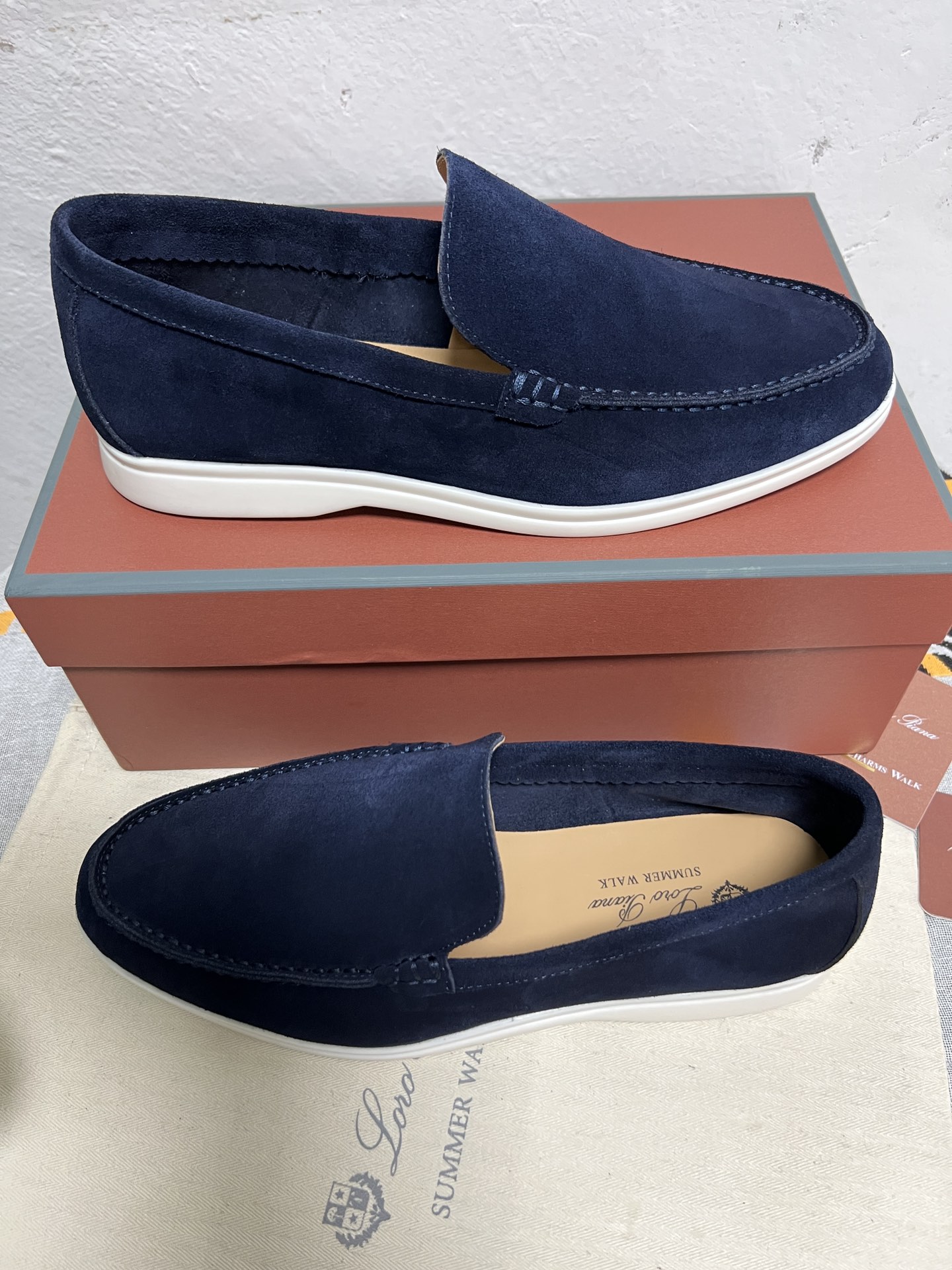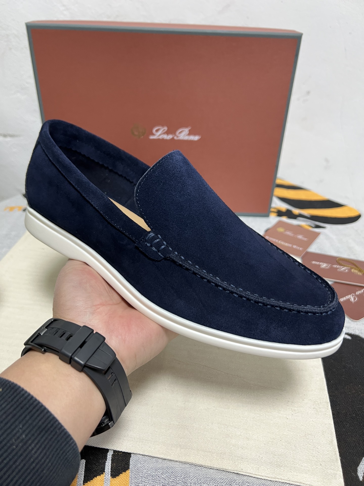 这款鞋子是AAAAA 1:1 质量 (非常棒). 使用了和原版一模一样的材料. 商标部分也保持了和洛罗皮亚纳/Loro Piana一样. 图片拍摄是实物鞋子拍摄, 您所收到的实物保证和我们图片一模一样.