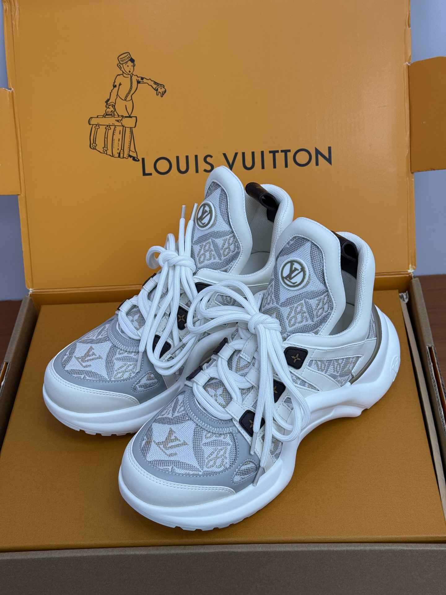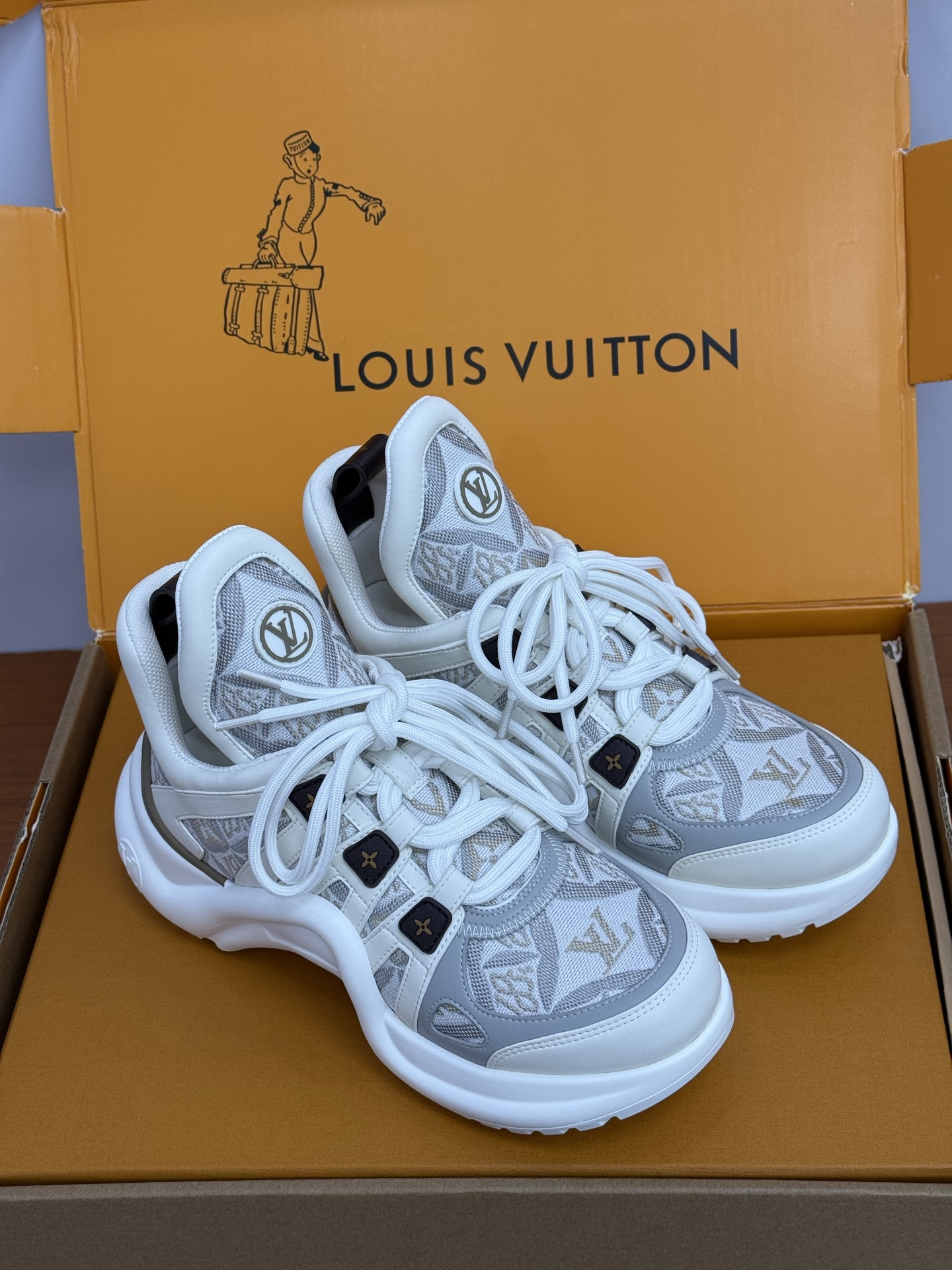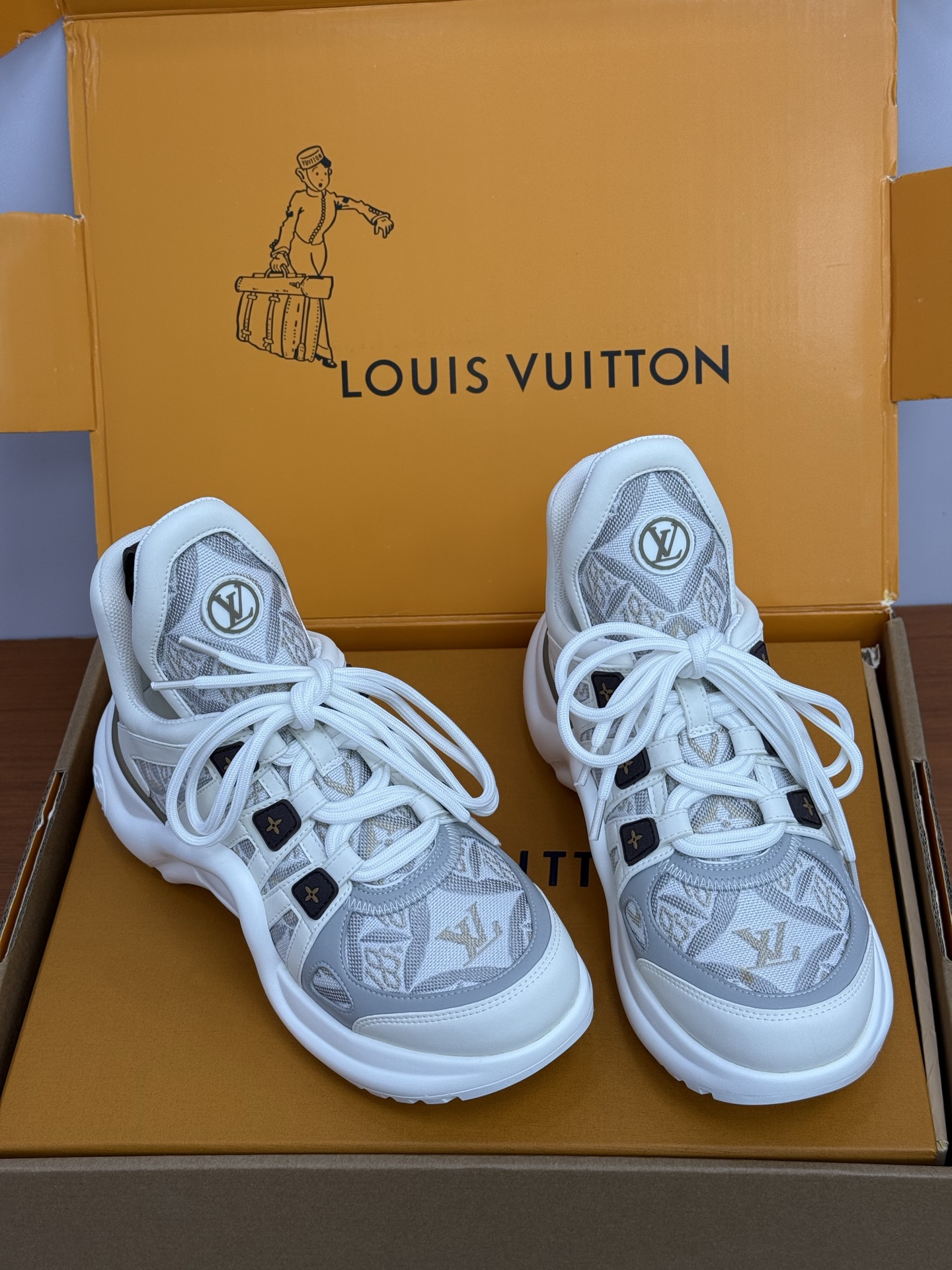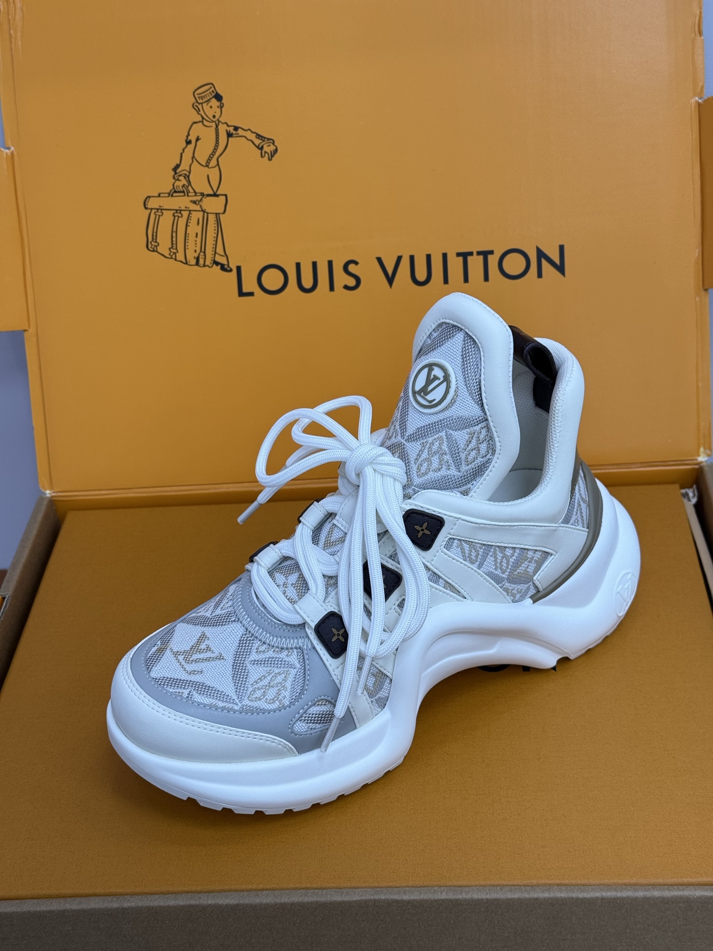 这款鞋子是AAAAA 1:1 质量 (非常棒). 使用了和原版一模一样的材料. 商标部分也保持了和路易威登/Louis Vuitton一样. 图片拍摄是实物鞋子拍摄, 您所收到的实物保证和我们图片一模一样.