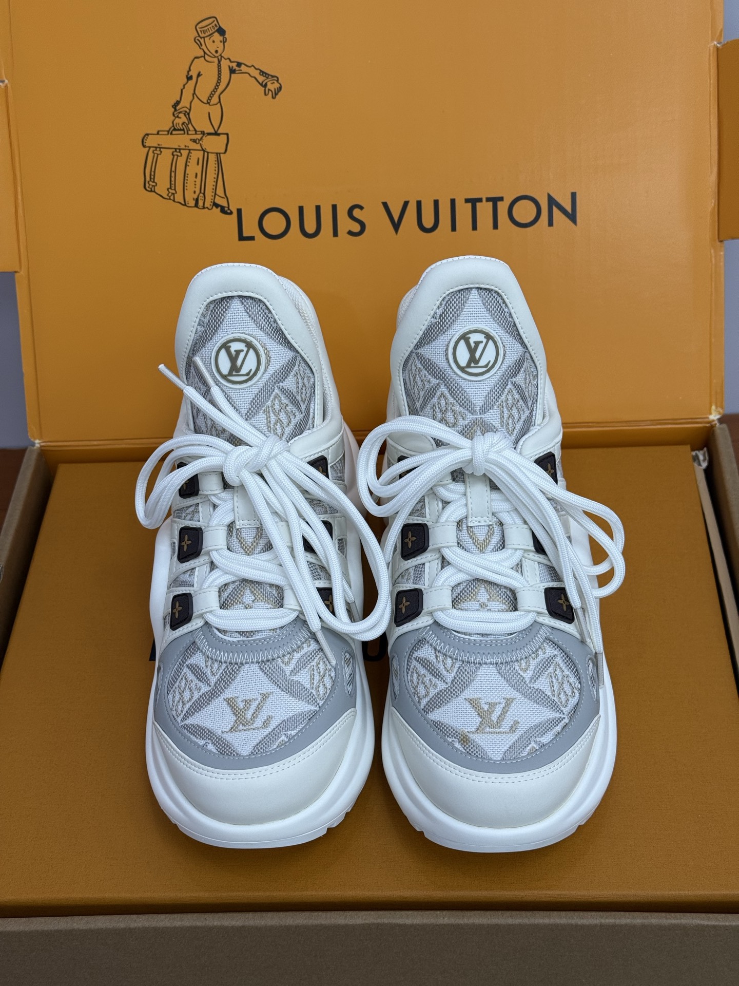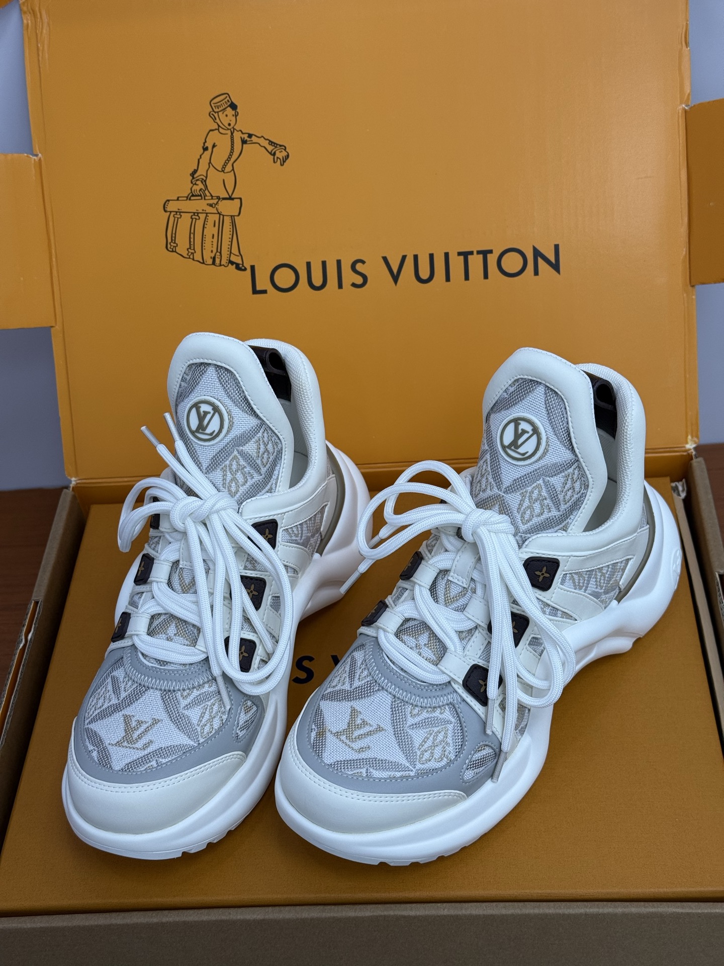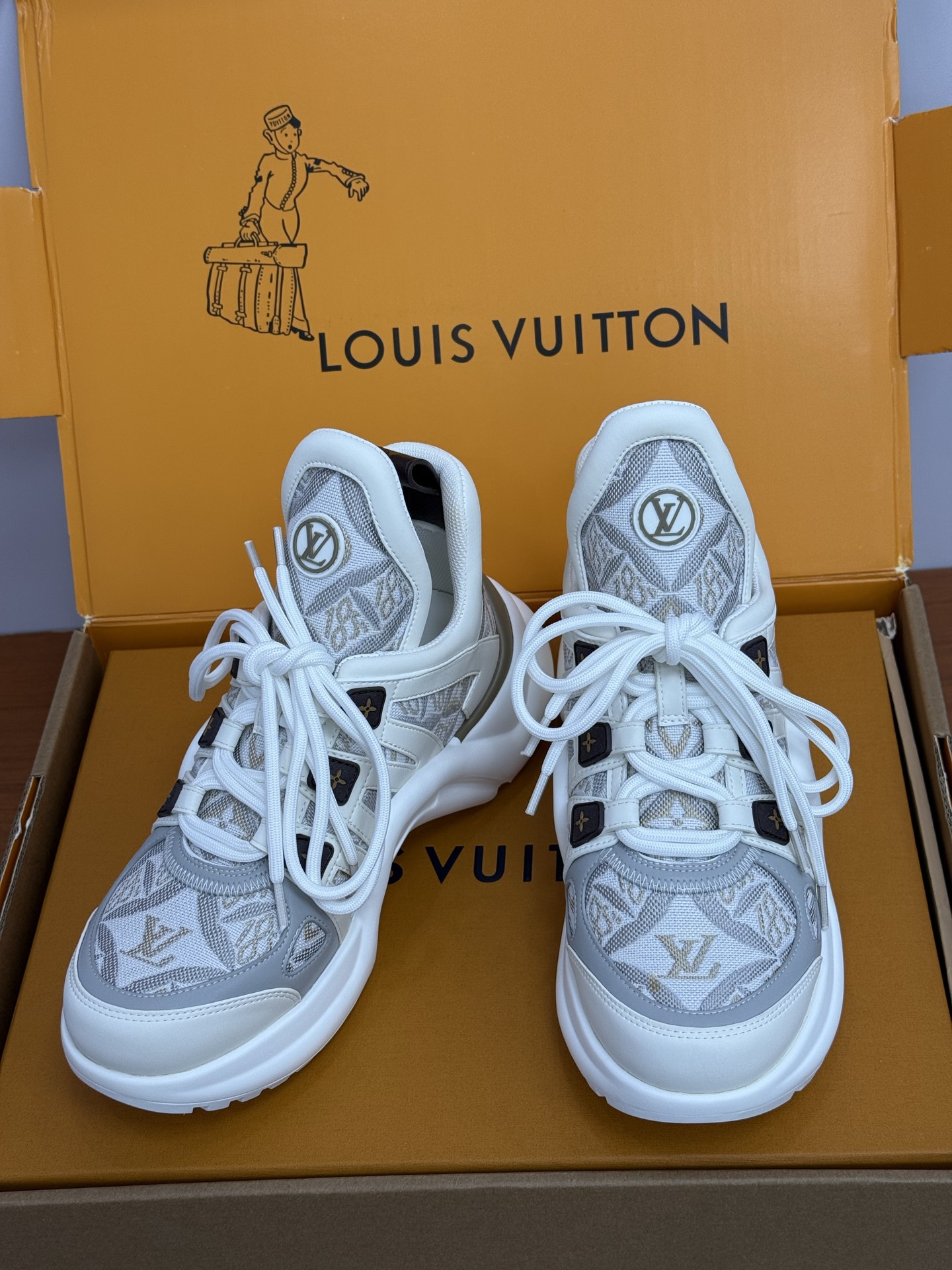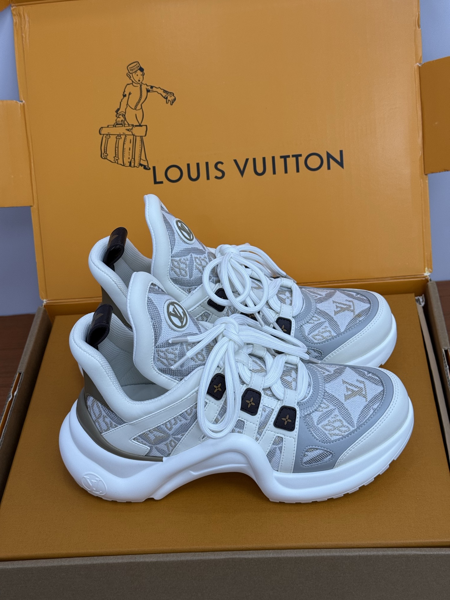 这款鞋子是AAAAA 1:1 质量 (非常棒). 使用了和原版一模一样的材料. 商标部分也保持了和路易威登/Louis Vuitton一样. 图片拍摄是实物鞋子拍摄, 您所收到的实物保证和我们图片一模一样.