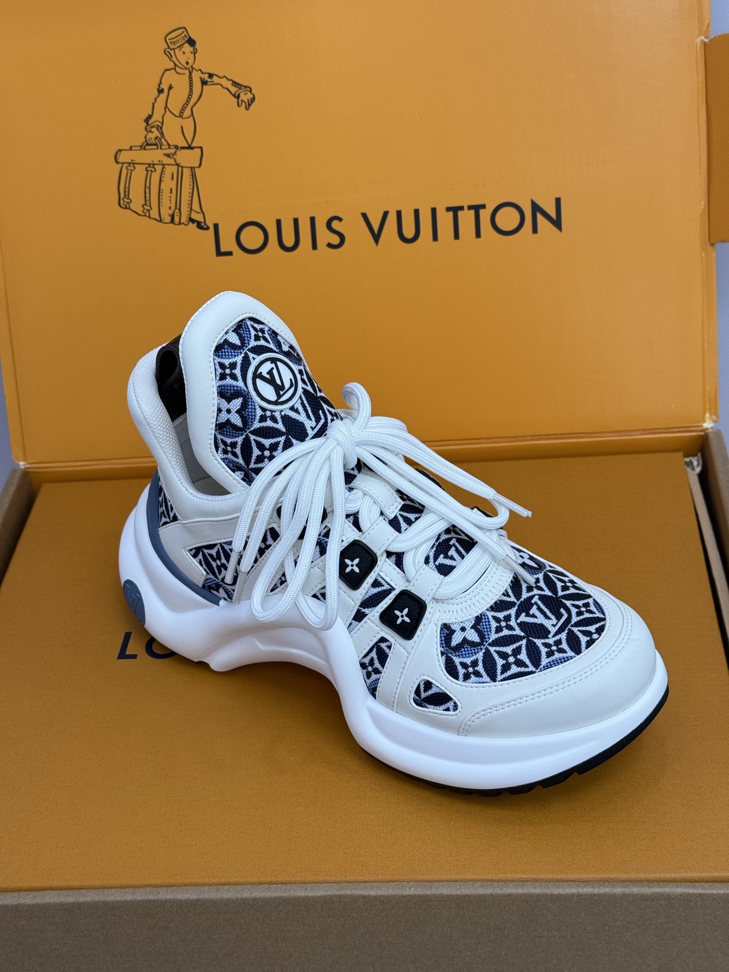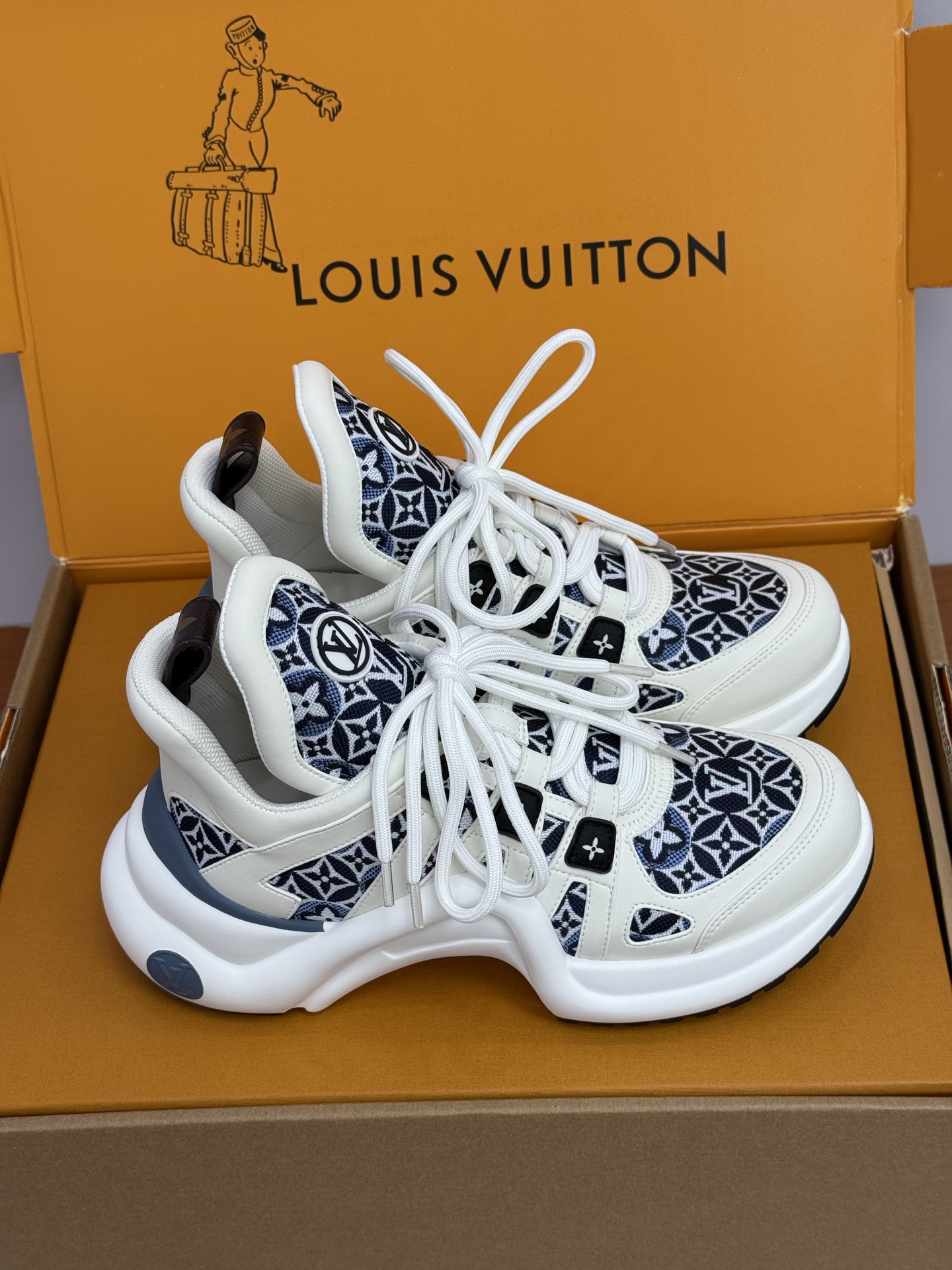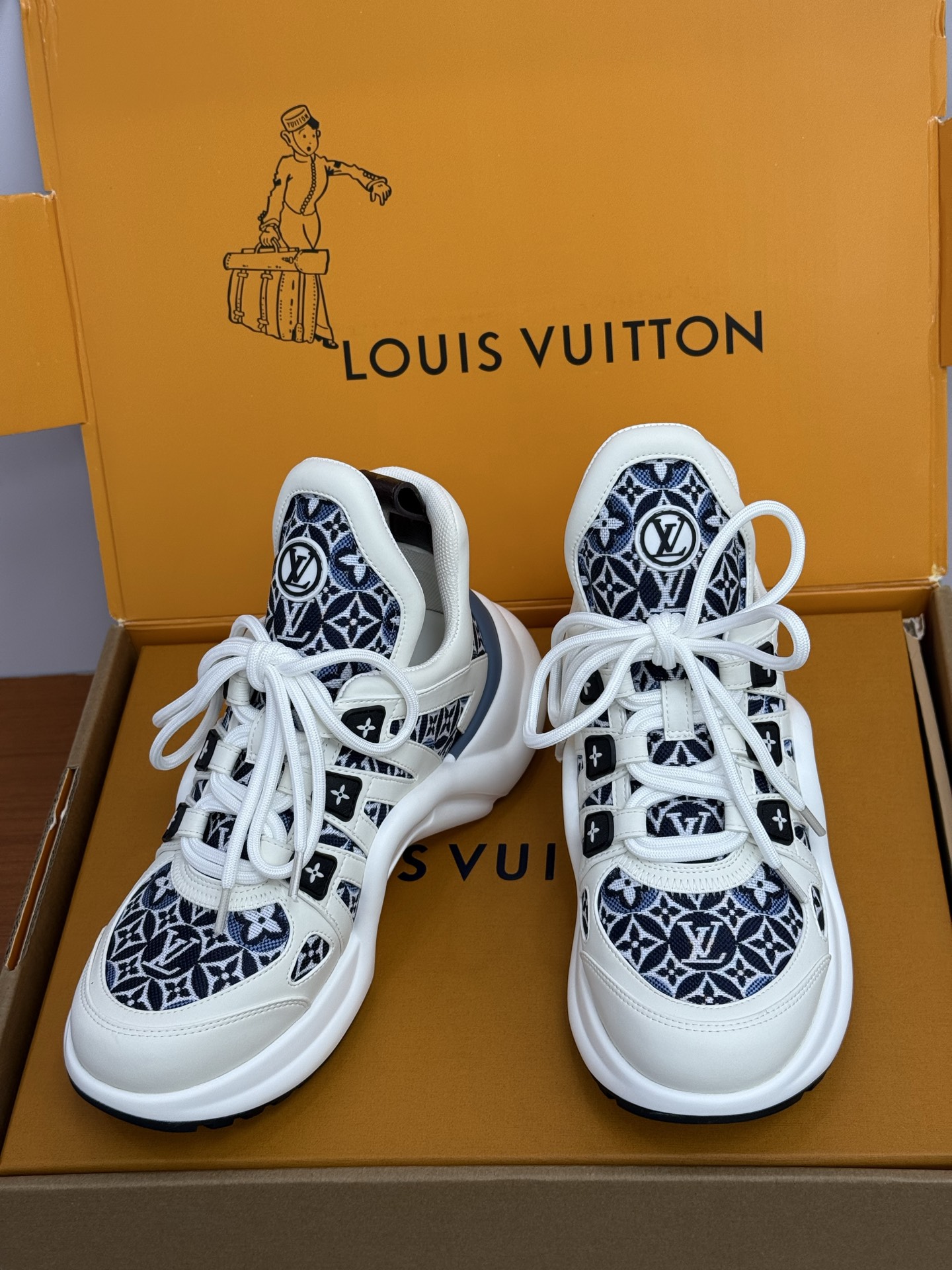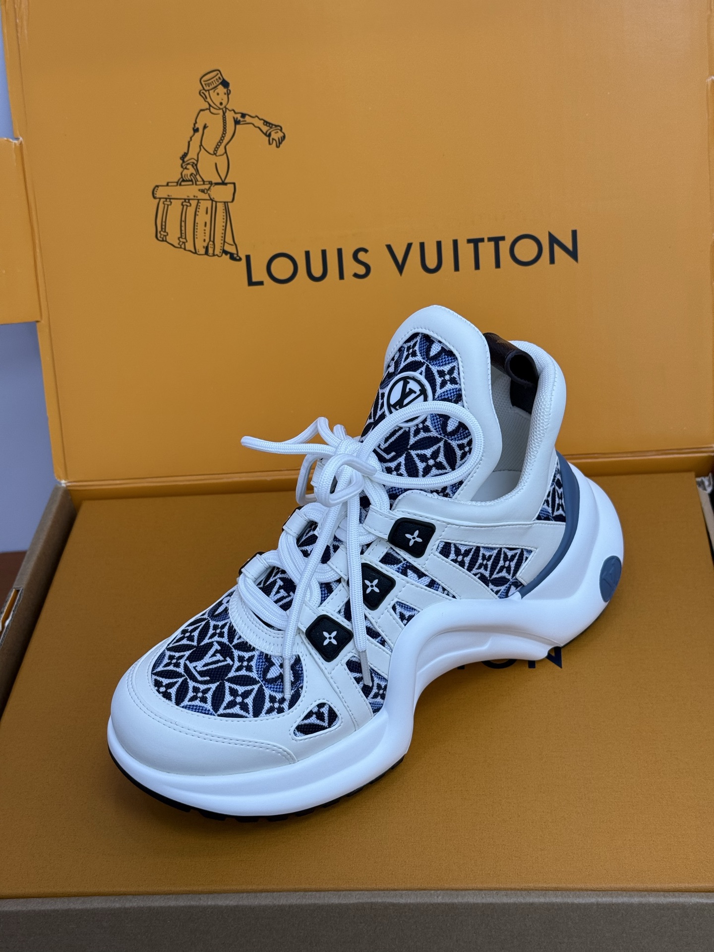 这款鞋子是AAAAA 1:1 质量 (非常棒). 使用了和原版一模一样的材料. 商标部分也保持了和路易威登/Louis Vuitton一样. 图片拍摄是实物鞋子拍摄, 您所收到的实物保证和我们图片一模一样.
