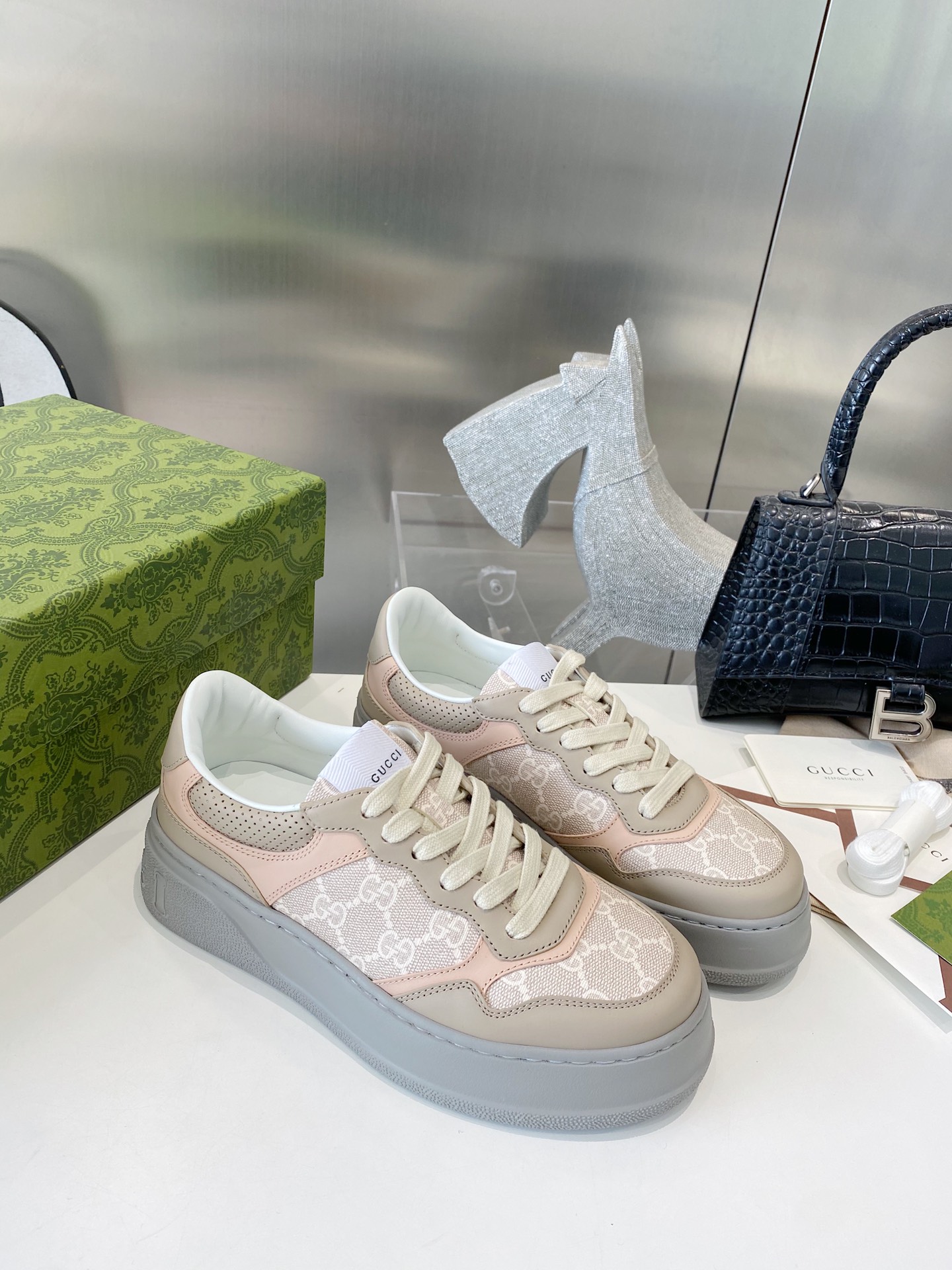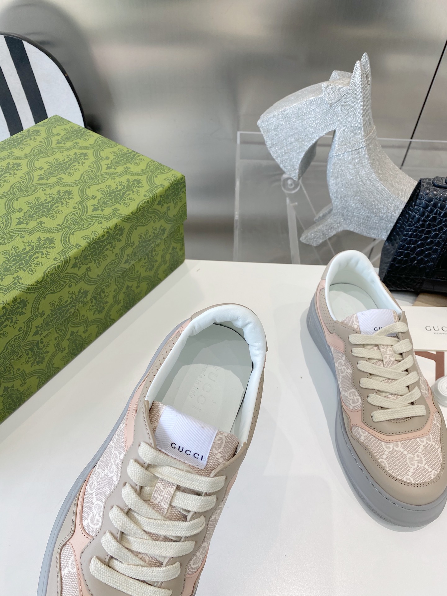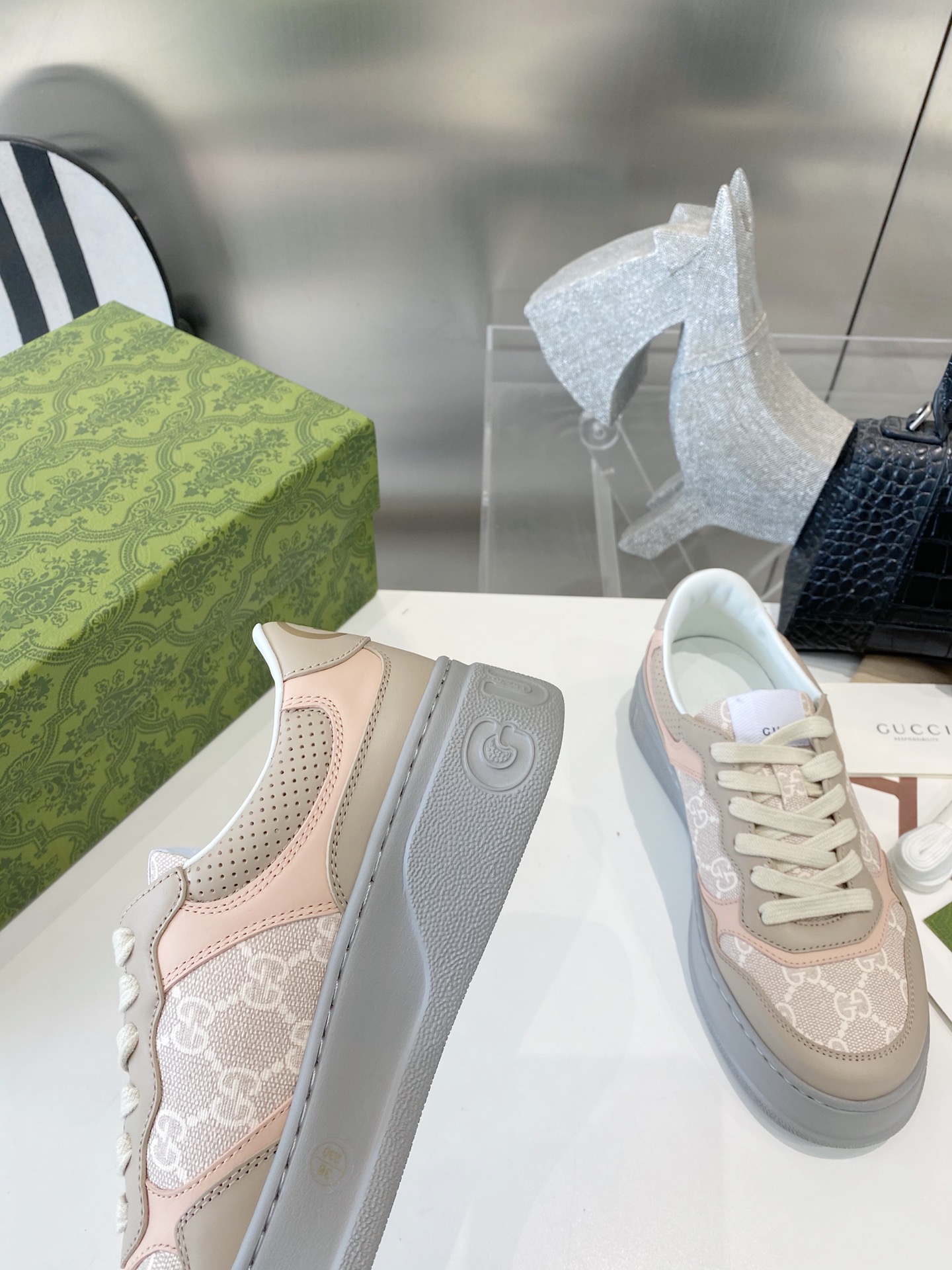 这款鞋子是AAAAA 1:1 质量 (非常棒). 使用了和原版一模一样的材料. 商标部分也保持了和古奇/Gucci一样. 图片拍摄是实物鞋子拍摄, 您所收到的实物保证和我们图片一模一样.