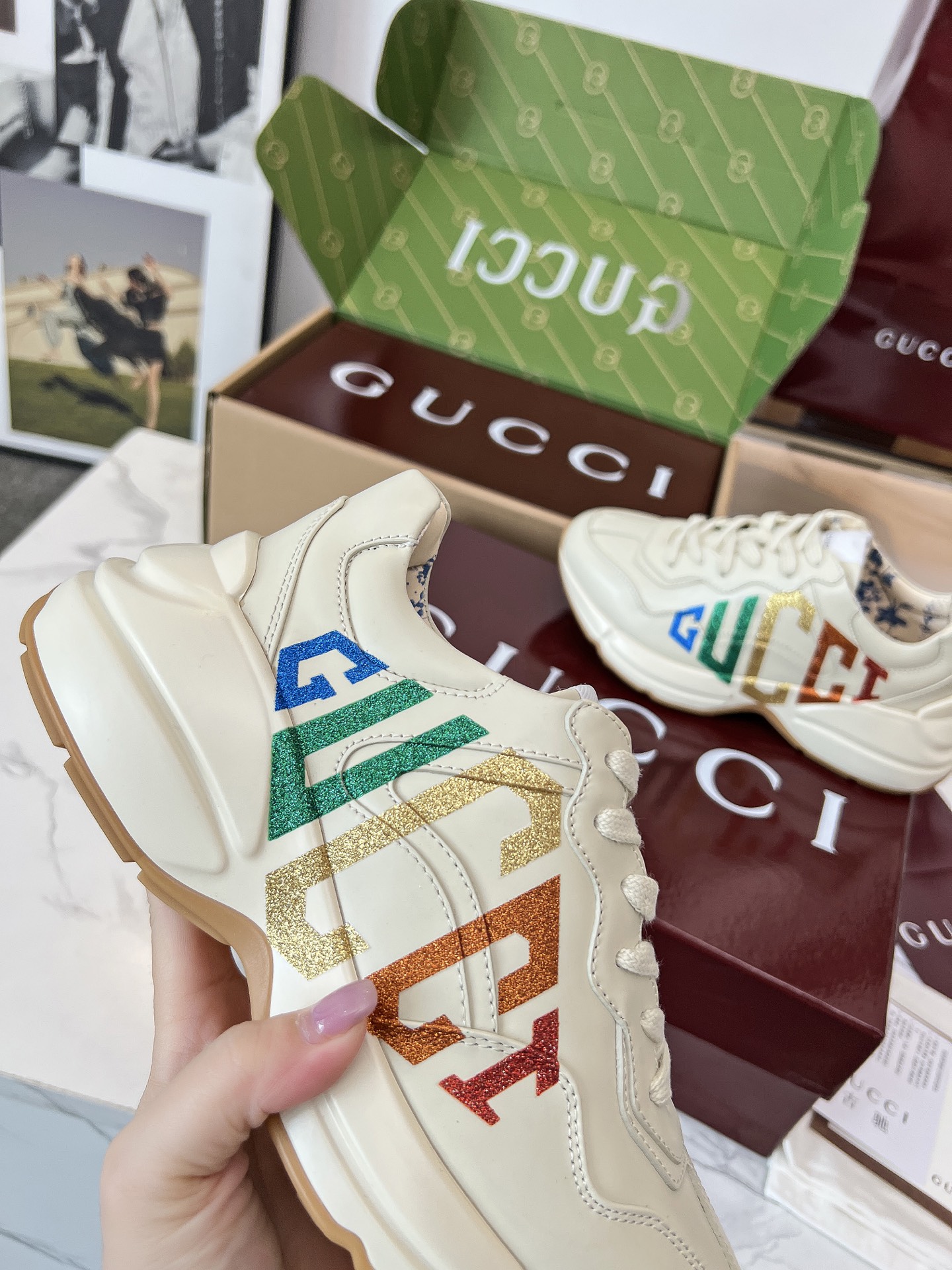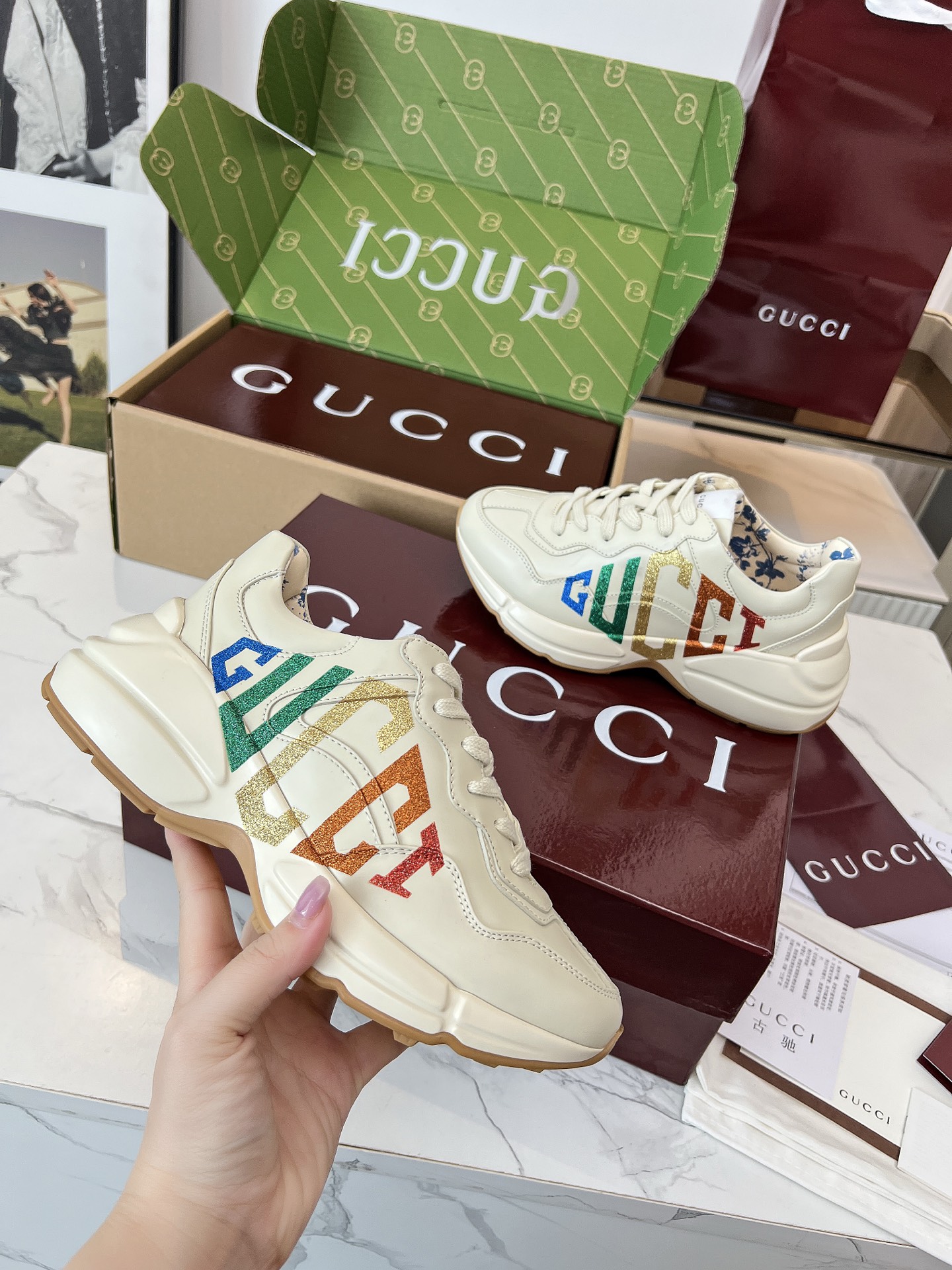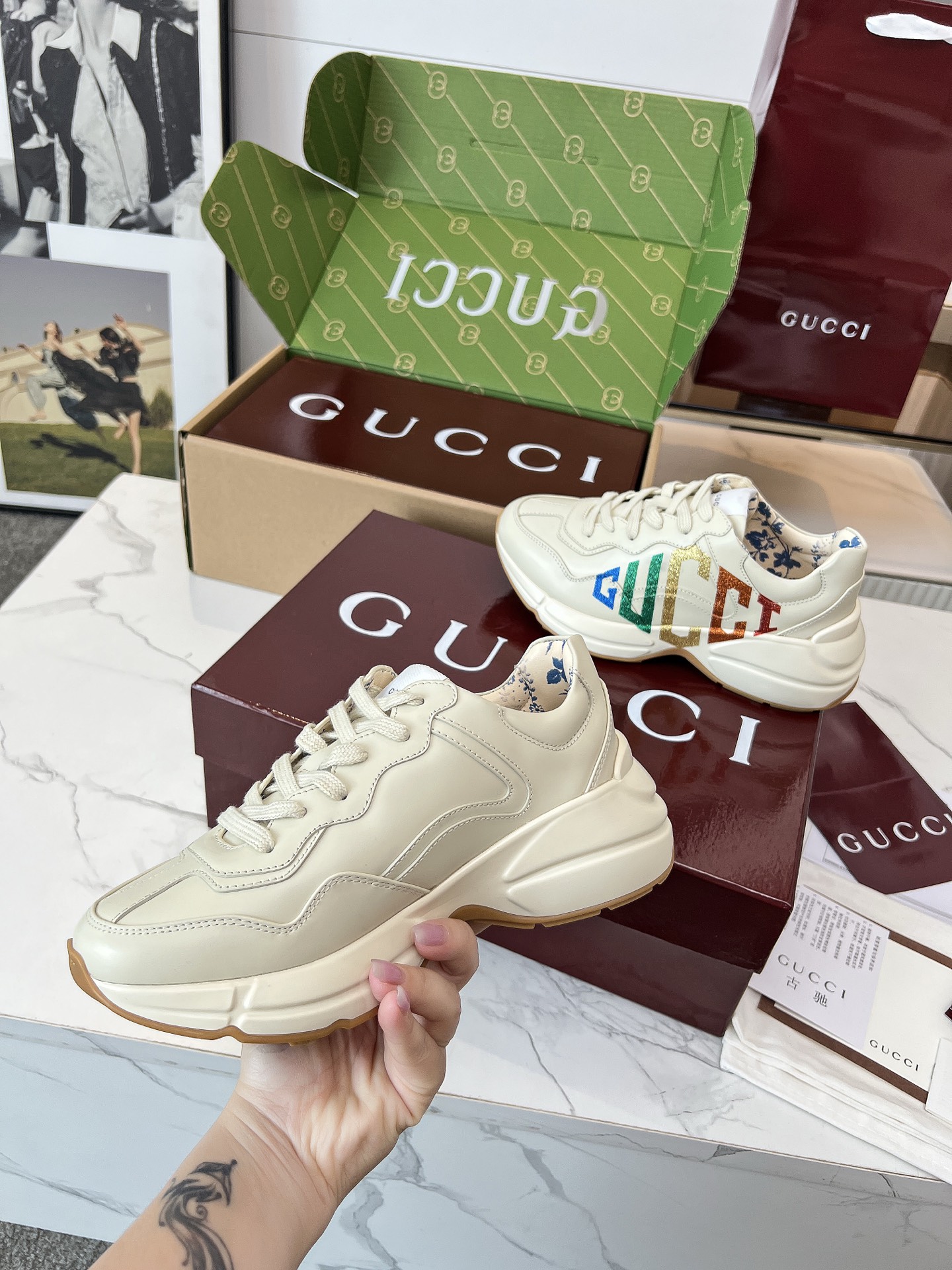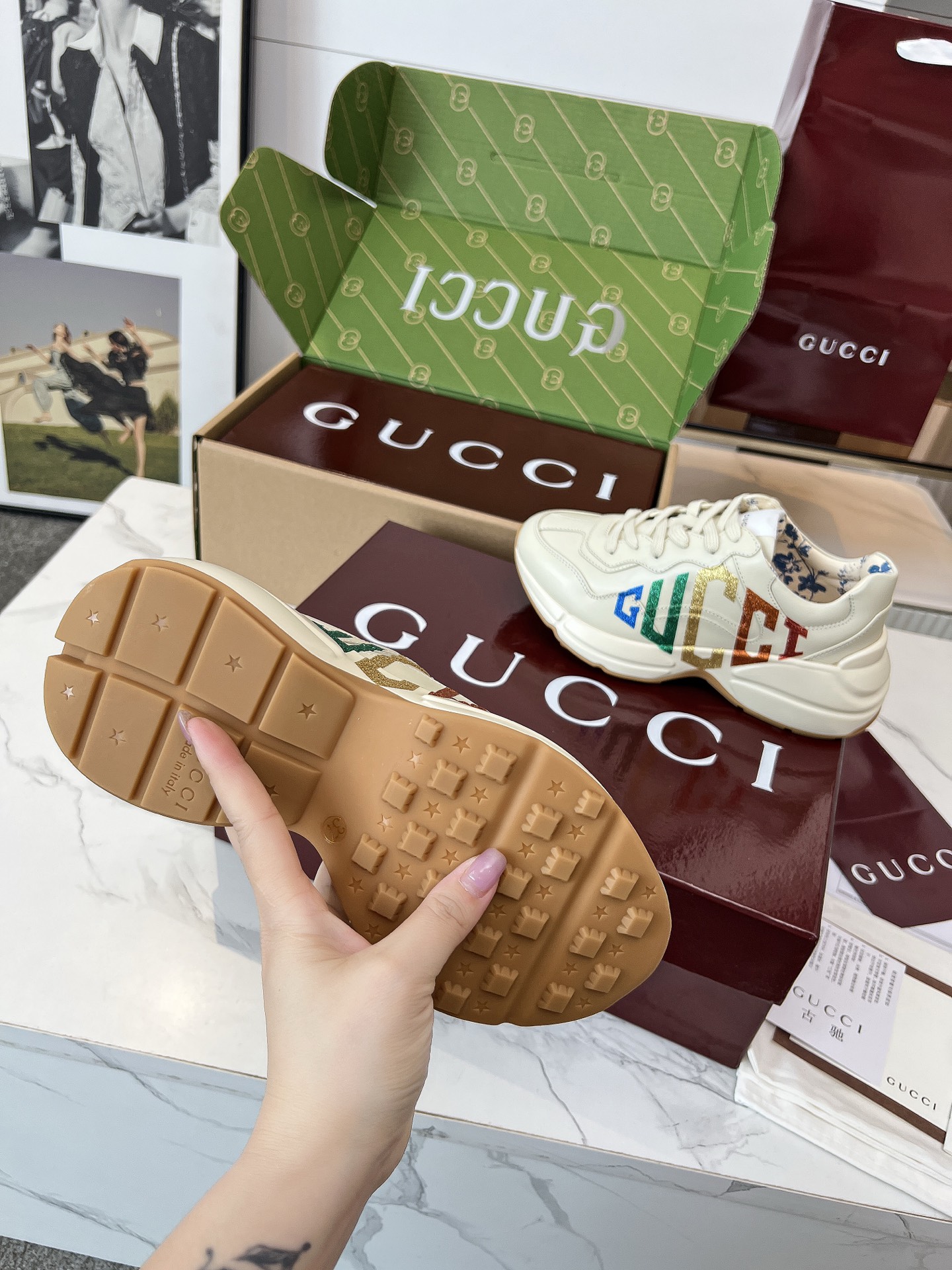 这款鞋子是AAAAA 1:1 质量 (非常棒). 使用了和原版一模一样的材料. 商标部分也保持了和古奇/Gucci一样. 图片拍摄是实物鞋子拍摄, 您所收到的实物保证和我们图片一模一样.