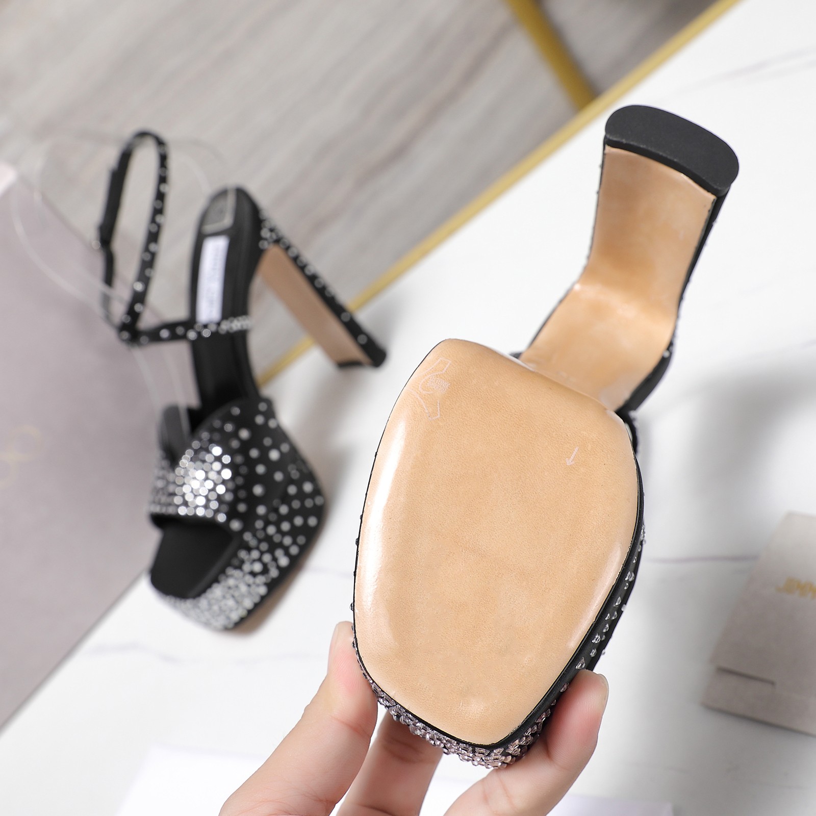 这款鞋子是AAAAA 1:1 质量 (非常棒). 使用了和原版一模一样的材料. 商标部分也保持了和吉米乔/JIMMY CHOO一样. 图片拍摄是实物鞋子拍摄, 您所收到的实物保证和我们图片一模一样.