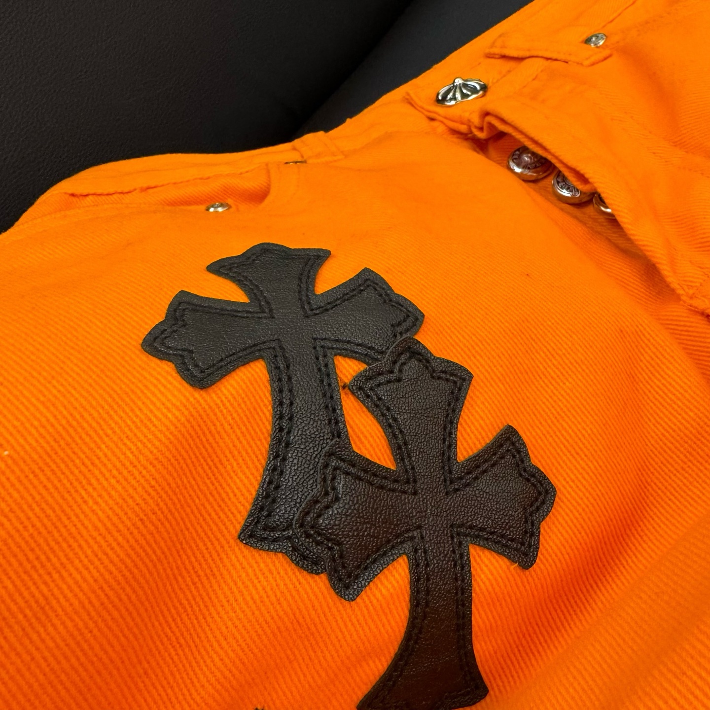 这款衣服是AAAAA 1:1 质量 (非常棒). 使用了和原版一模一样的材料. 商标部分也保持了和克罗心/Chrome Hearts一样. 图片拍摄是实物衣服拍摄, 您所收到的实物保证和我们图片一模一样.