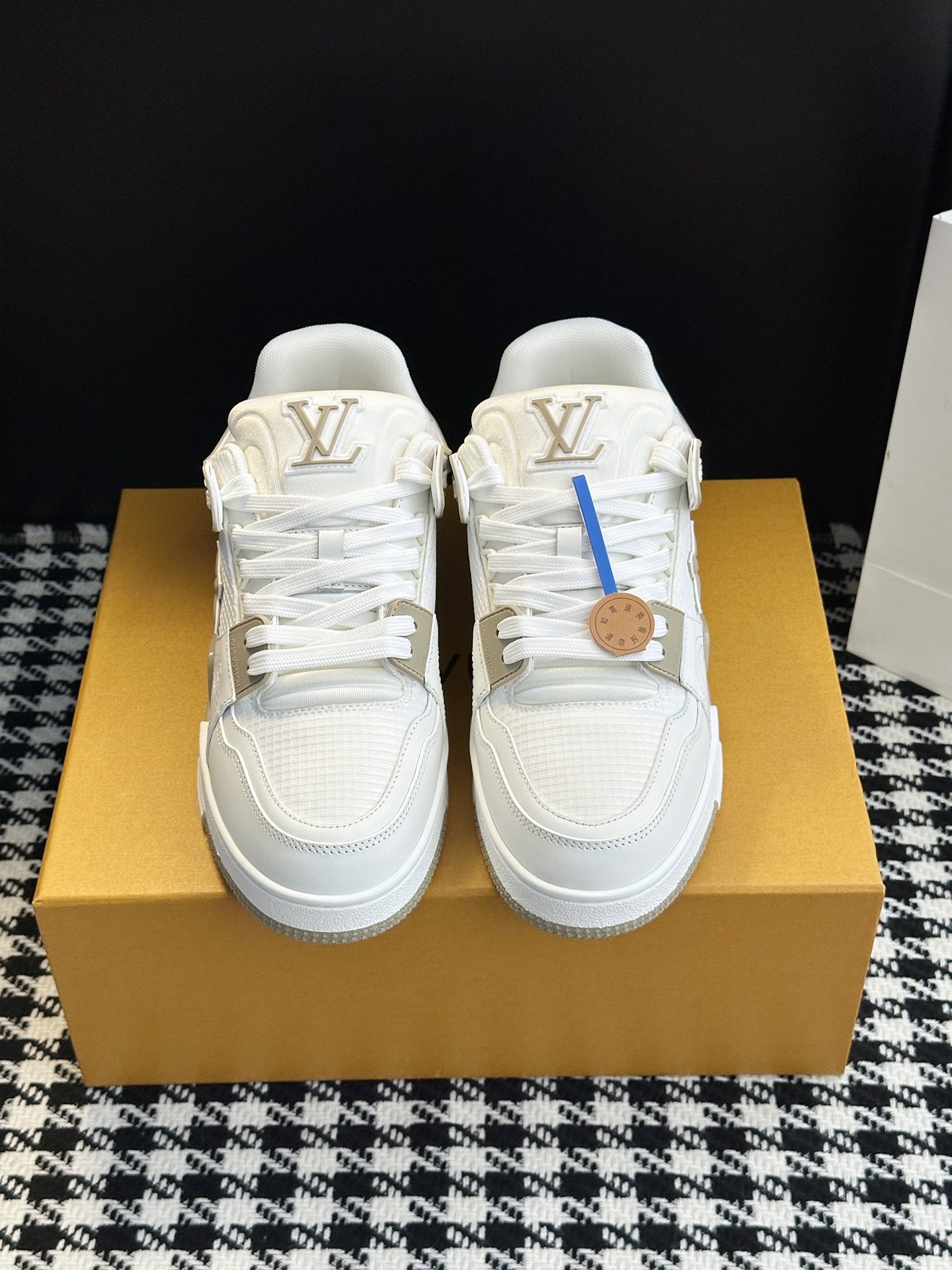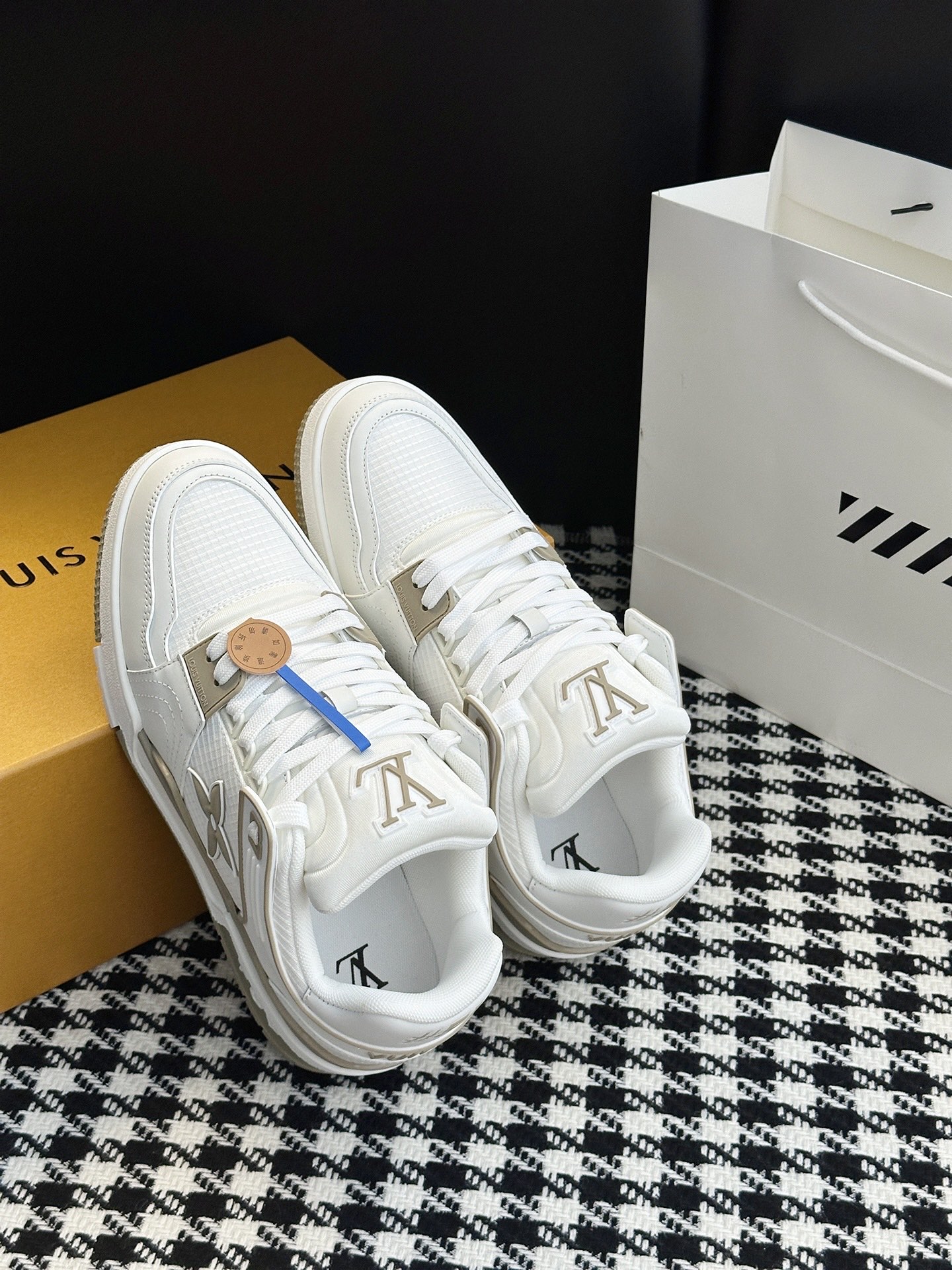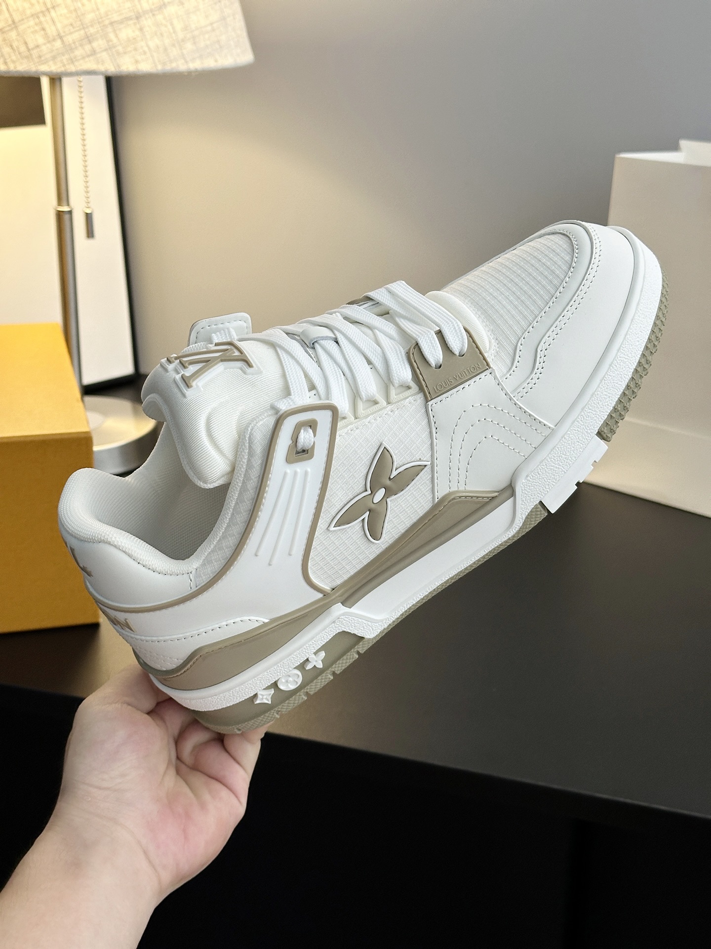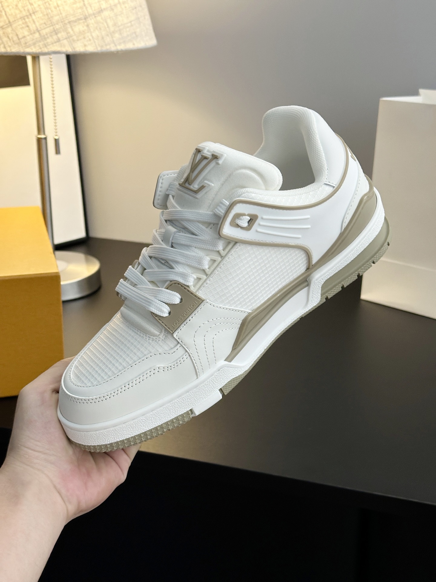 这款鞋子是AAAAA 1:1 质量 (非常棒). 使用了和原版一模一样的材料. 商标部分也保持了和路易威登/Louis Vuitton一样. 图片拍摄是实物鞋子拍摄, 您所收到的实物保证和我们图片一模一样.