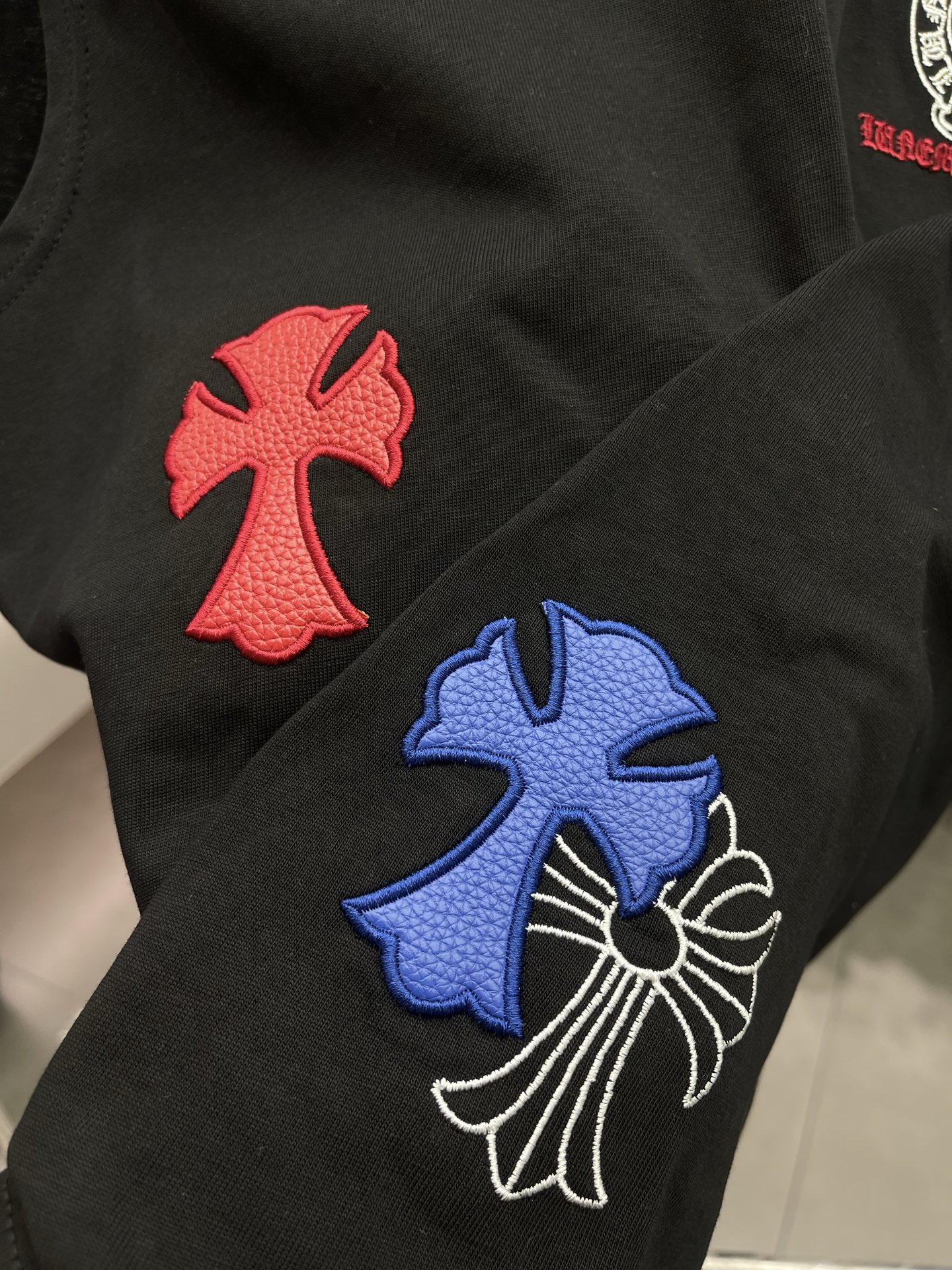 这款衣服是AAAAA 1:1 质量 (非常棒). 使用了和原版一模一样的材料. 商标部分也保持了和克罗心/Chrome Hearts一样. 图片拍摄是实物衣服拍摄, 您所收到的实物保证和我们图片一模一样.