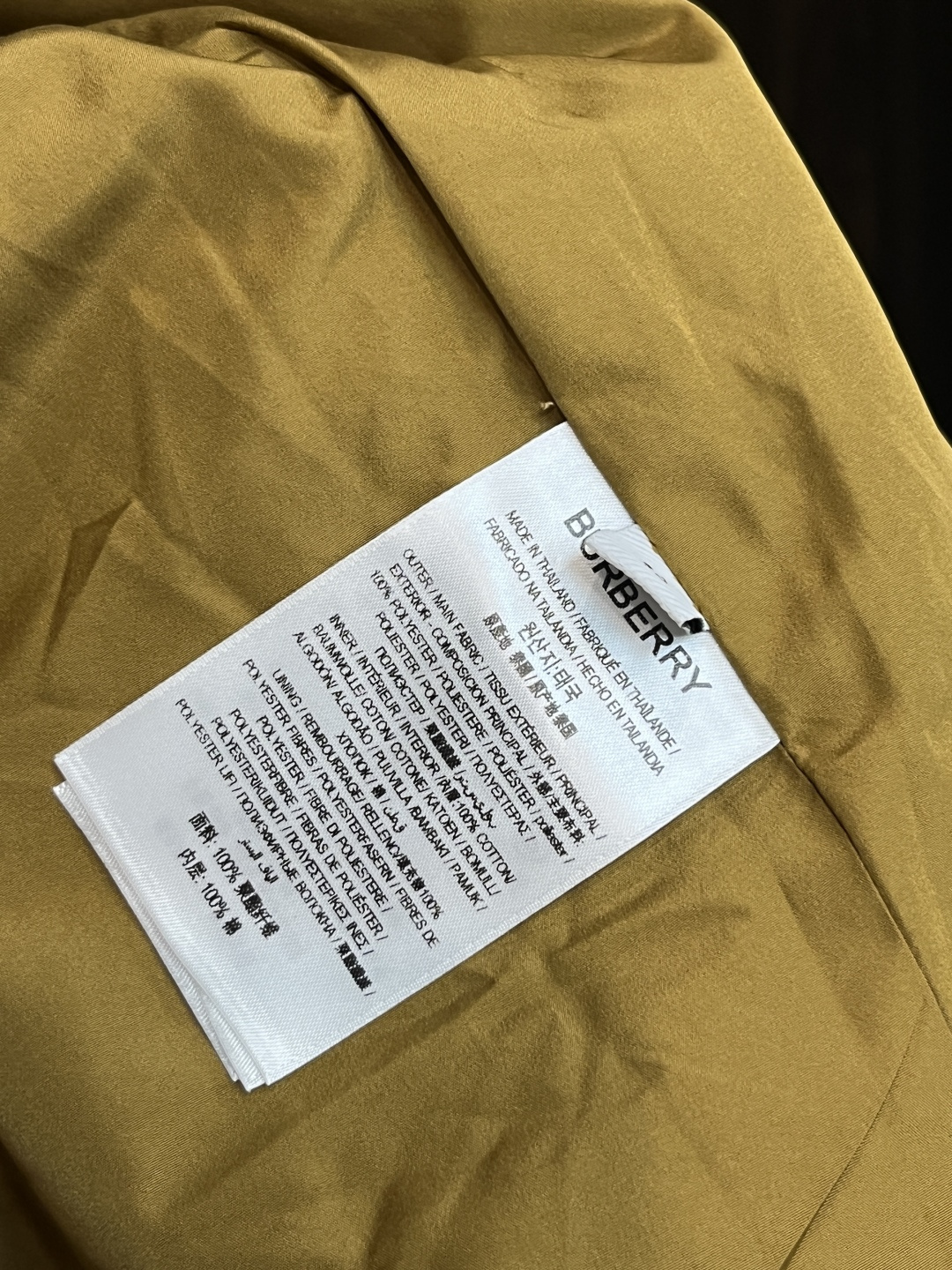 这款衣服是AAAAA 1:1 质量 (非常棒). 使用了和原版一模一样的材料. 商标部分也保持了和巴宝莉/Burberry一样. 图片拍摄是实物衣服拍摄, 您所收到的实物保证和我们图片一模一样.