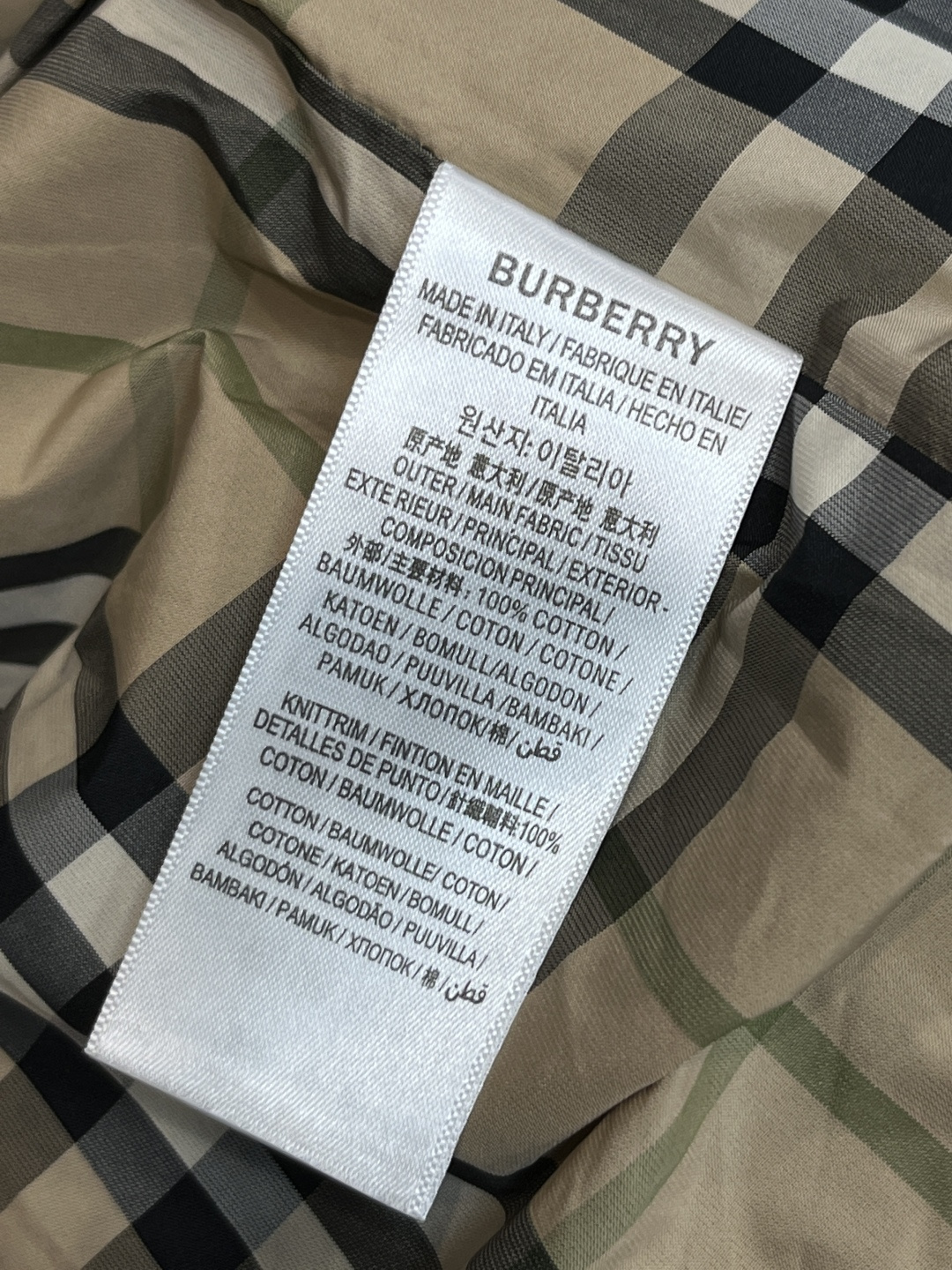这款衣服是AAAAA 1:1 质量 (非常棒). 使用了和原版一模一样的材料. 商标部分也保持了和巴宝莉/Burberry一样. 图片拍摄是实物衣服拍摄, 您所收到的实物保证和我们图片一模一样.