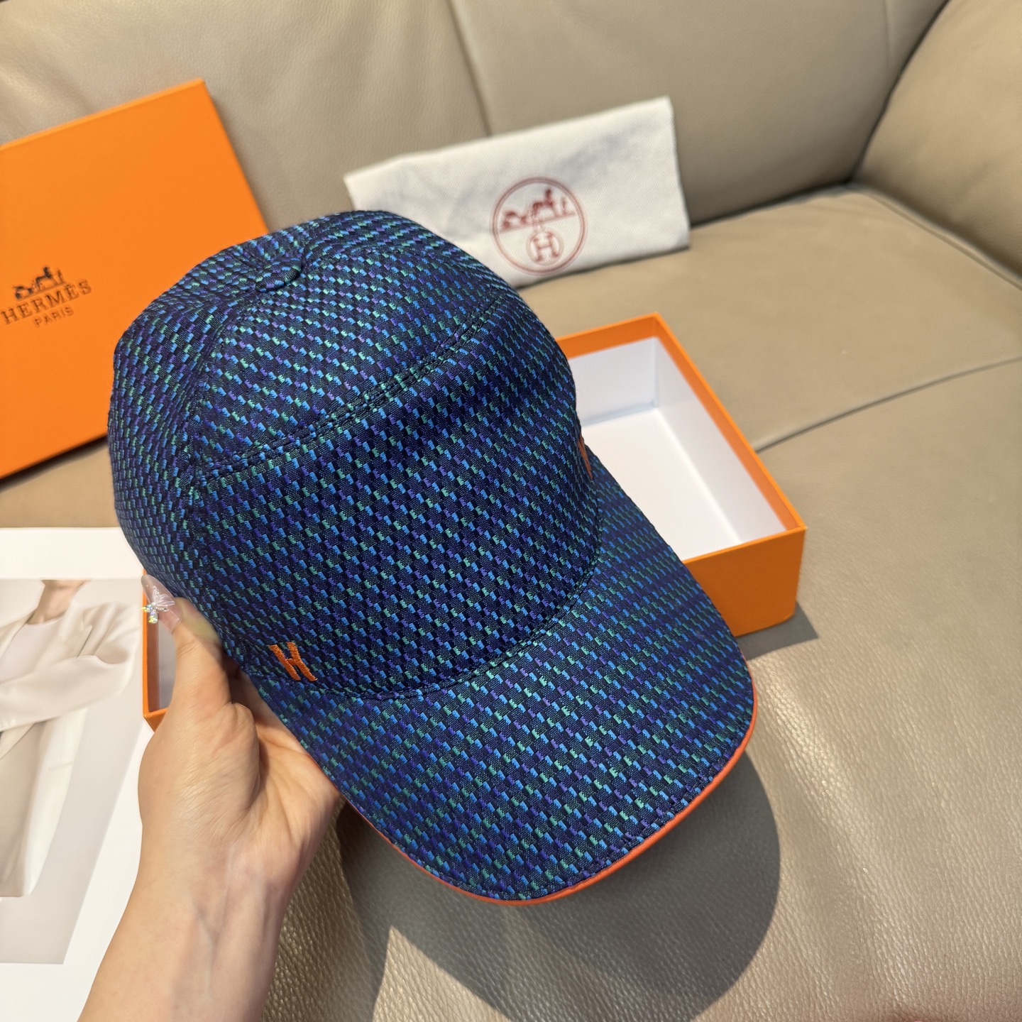 这款帽子是AAAAA 1:1 质量 (非常棒). 使用了和原版一模一样的材料. 商标部分也保持了和爱马仕/Hermes一样. 图片拍摄是实物帽子拍摄, 您所收到的实物保证和我们图片一模一样.