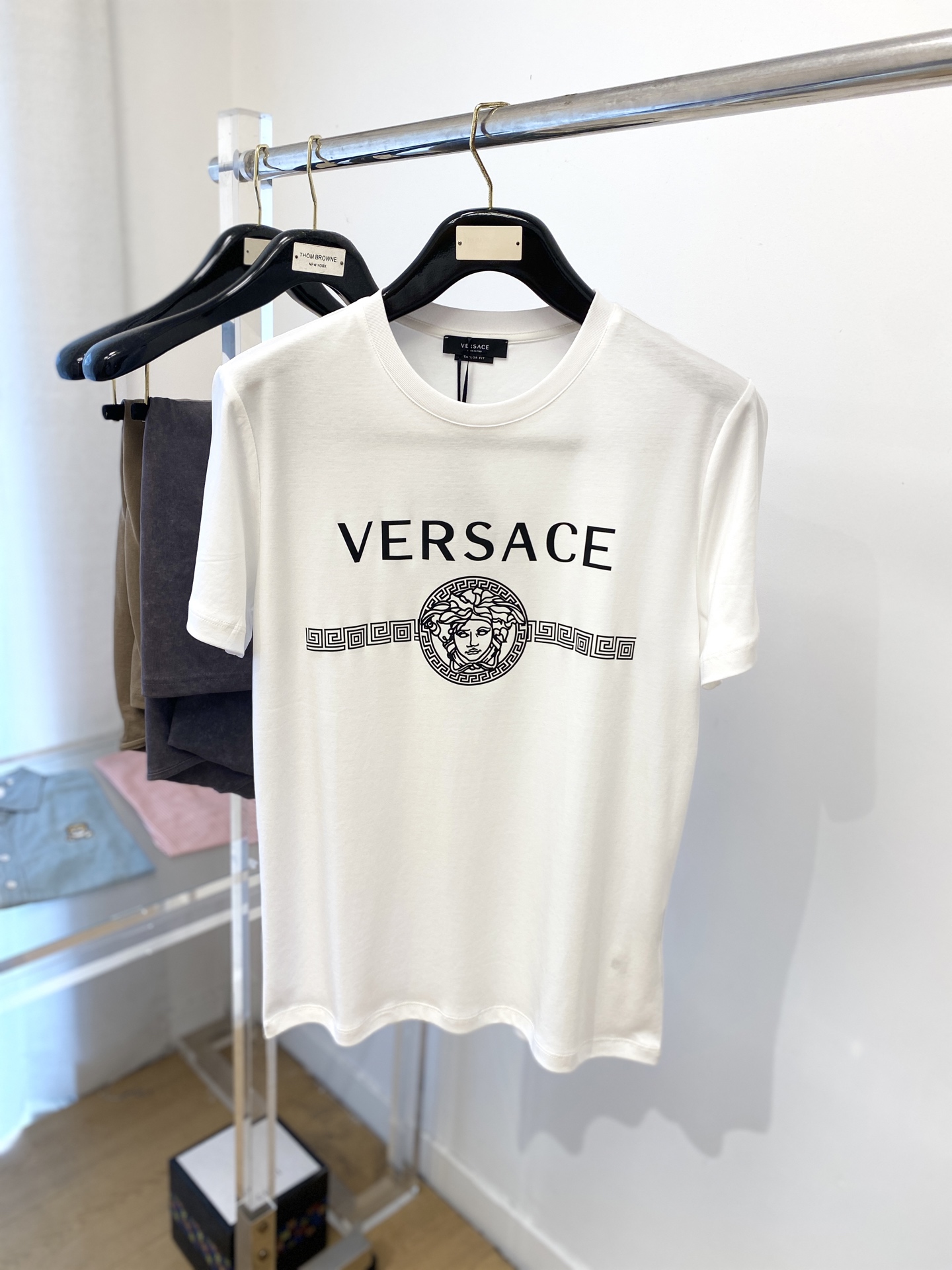 这款衣服是AAAAA 1:1 质量 (非常棒). 使用了和原版一模一样的材料. 商标部分也保持了和范思哲/Versace一样. 图片拍摄是实物衣服拍摄, 您所收到的实物保证和我们图片一模一样.