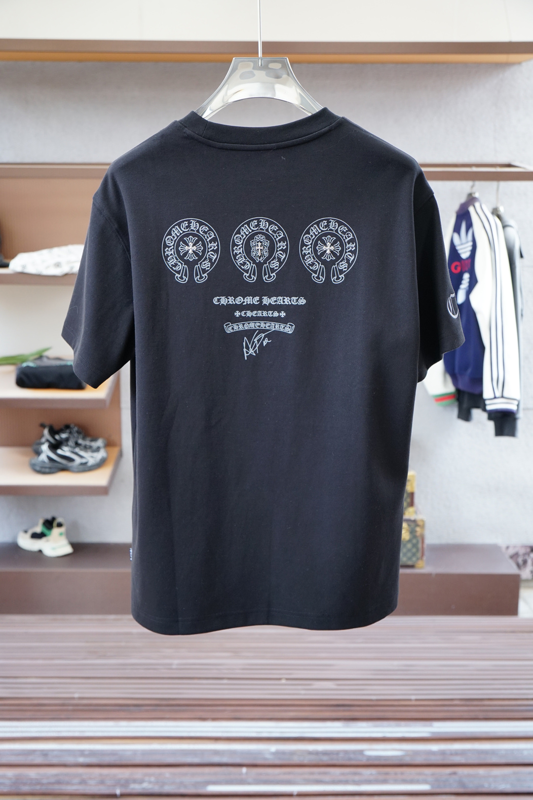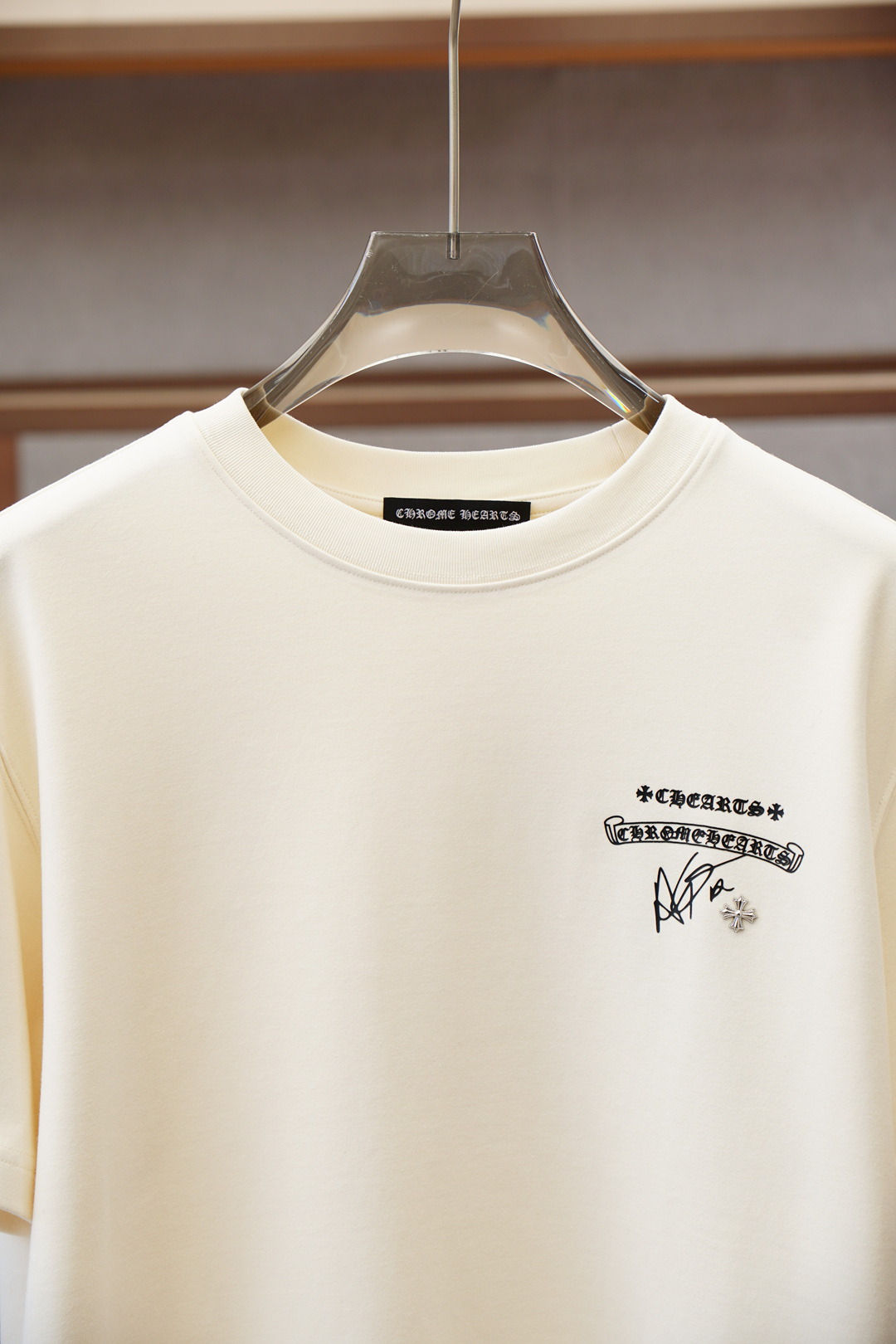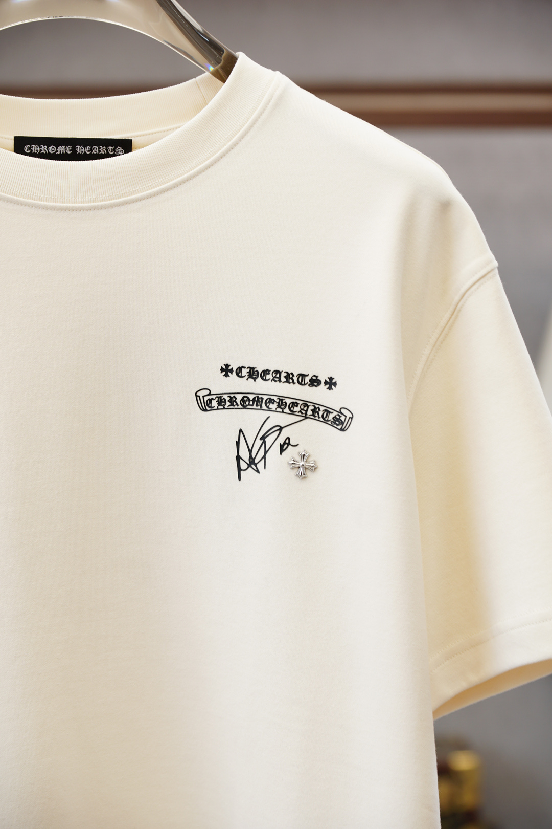 这款衣服是AAAAA 1:1 质量 (非常棒). 使用了和原版一模一样的材料. 商标部分也保持了和克罗心/Chrome Hearts一样. 图片拍摄是实物衣服拍摄, 您所收到的实物保证和我们图片一模一样.