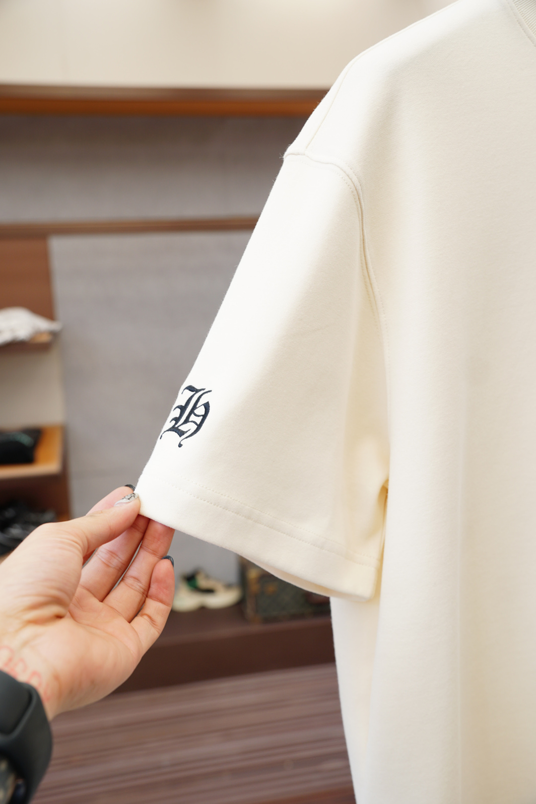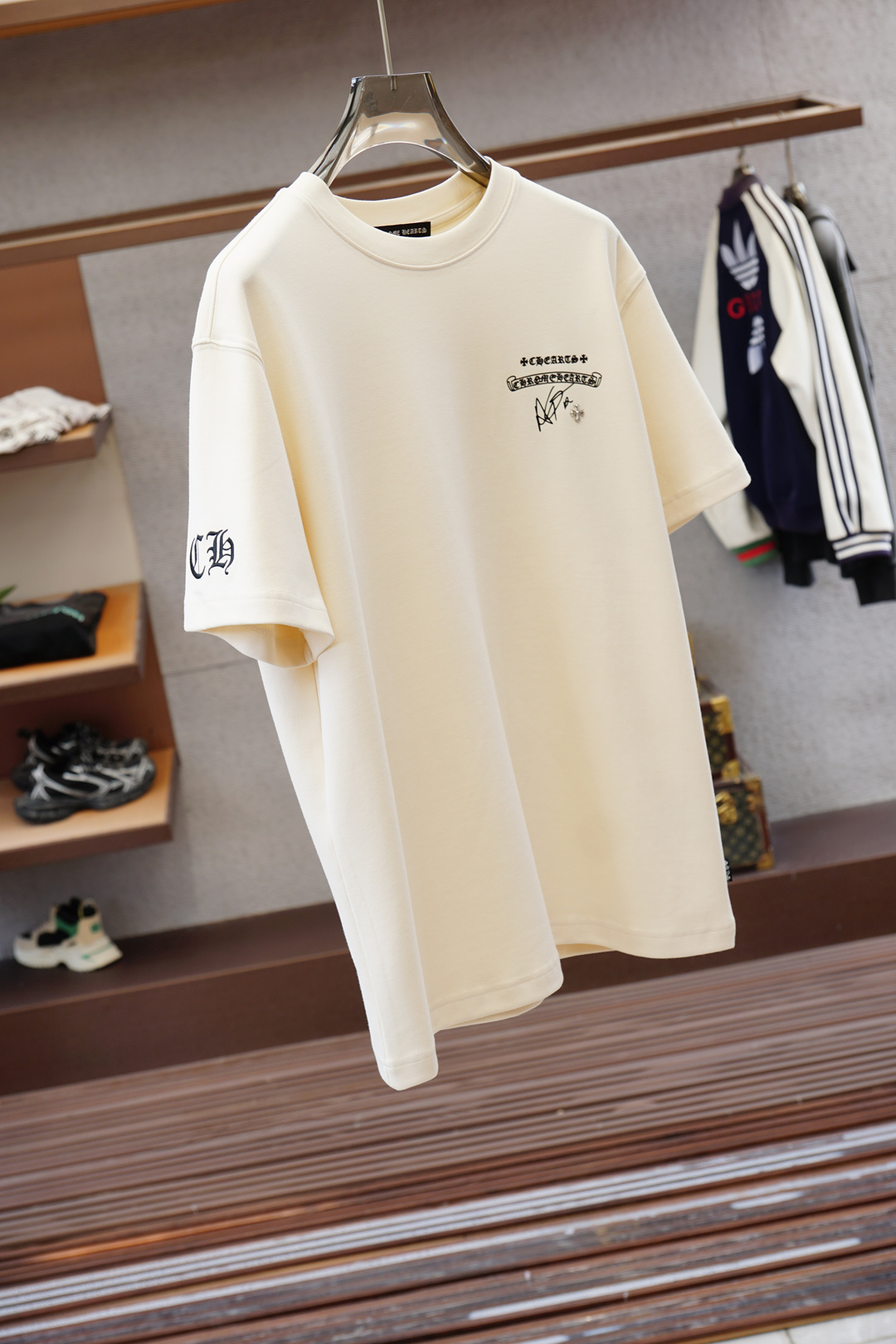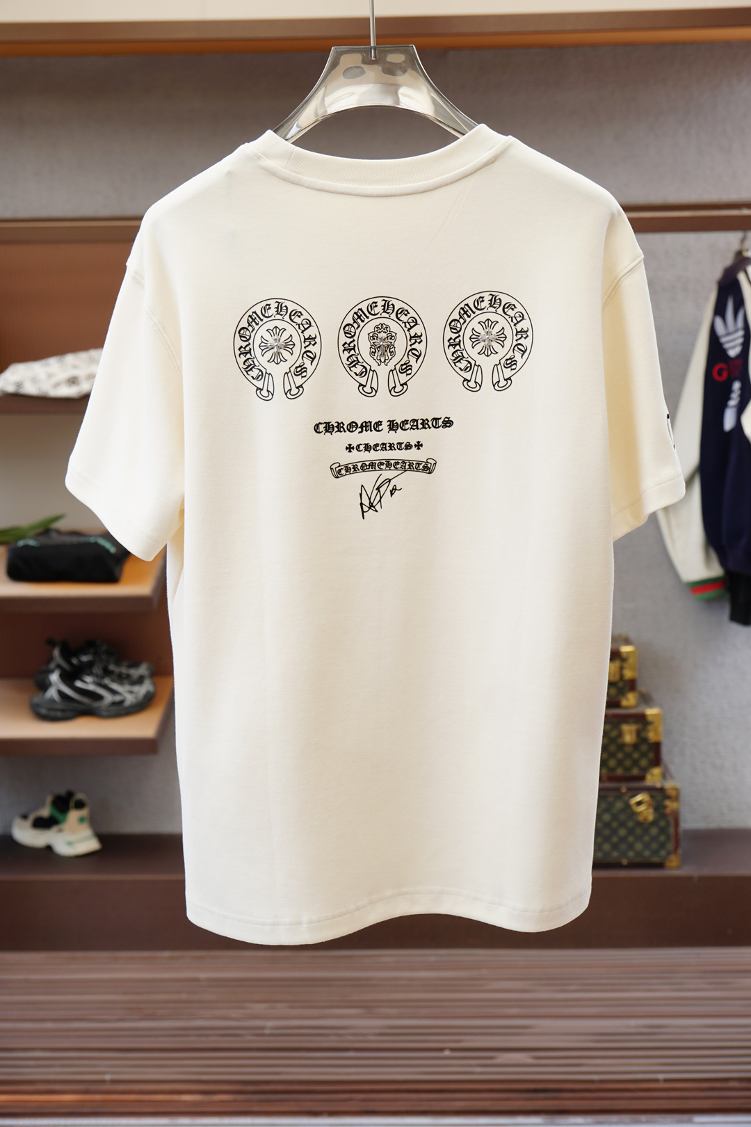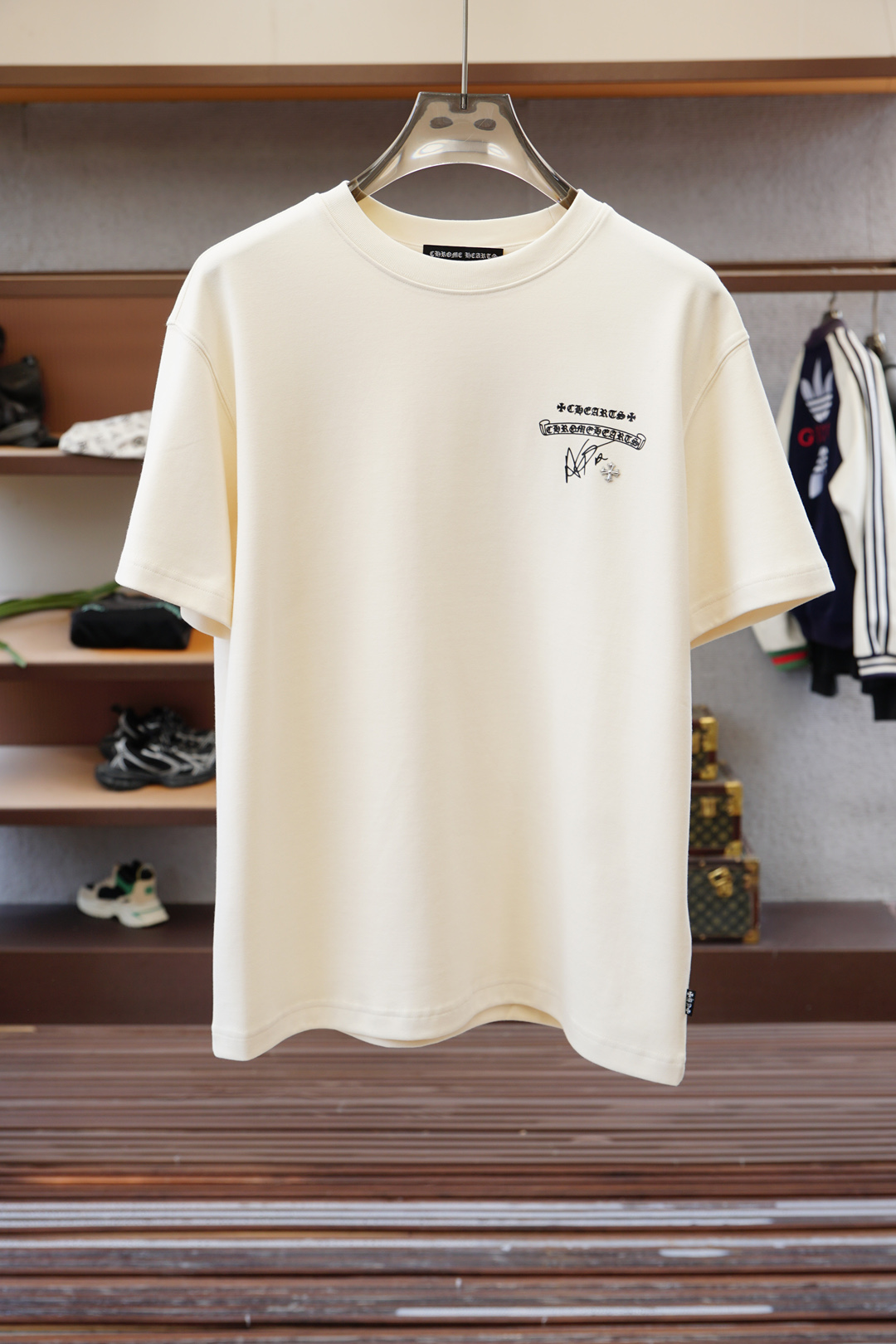 这款衣服是AAAAA 1:1 质量 (非常棒). 使用了和原版一模一样的材料. 商标部分也保持了和克罗心/Chrome Hearts一样. 图片拍摄是实物衣服拍摄, 您所收到的实物保证和我们图片一模一样.