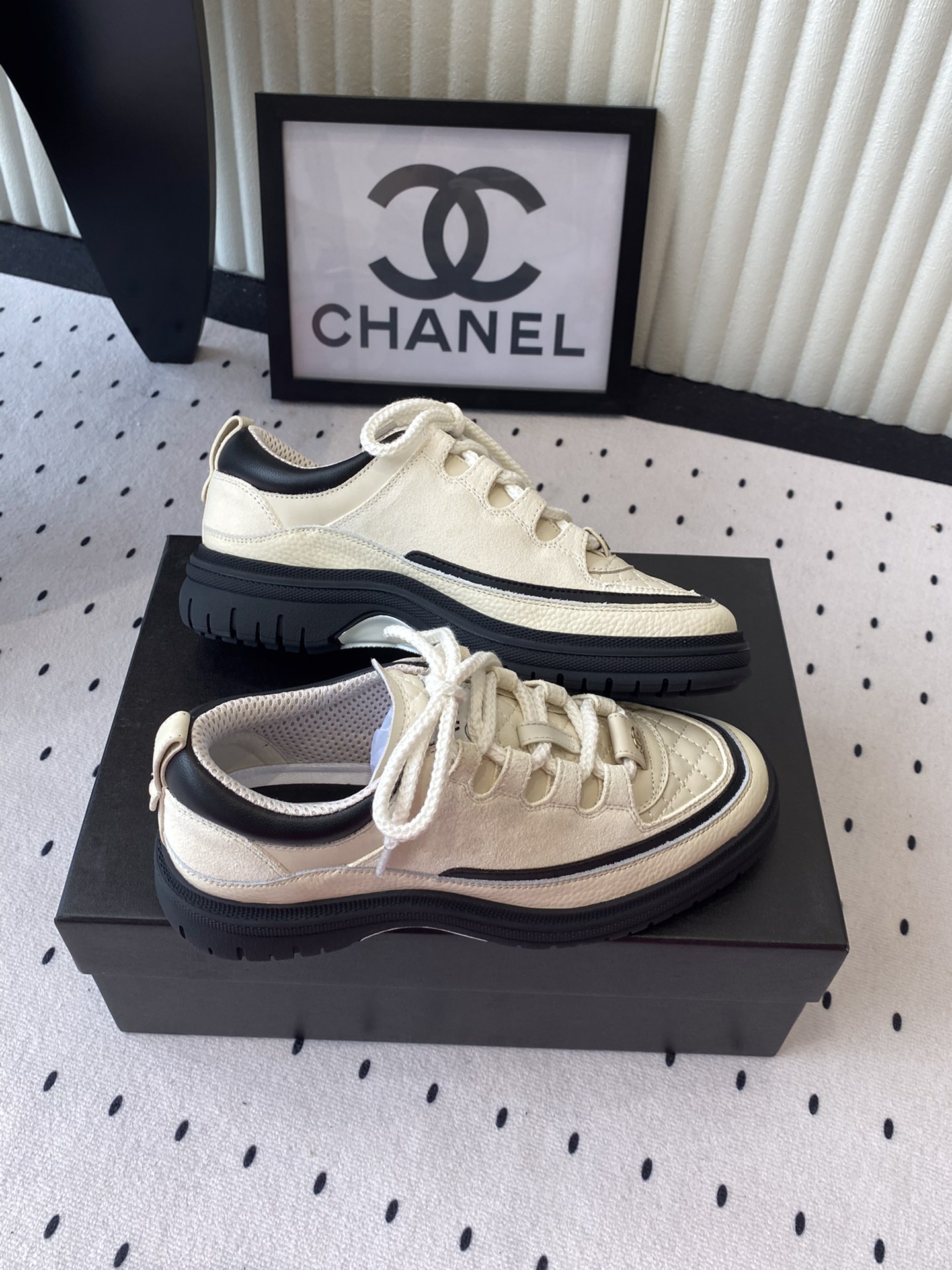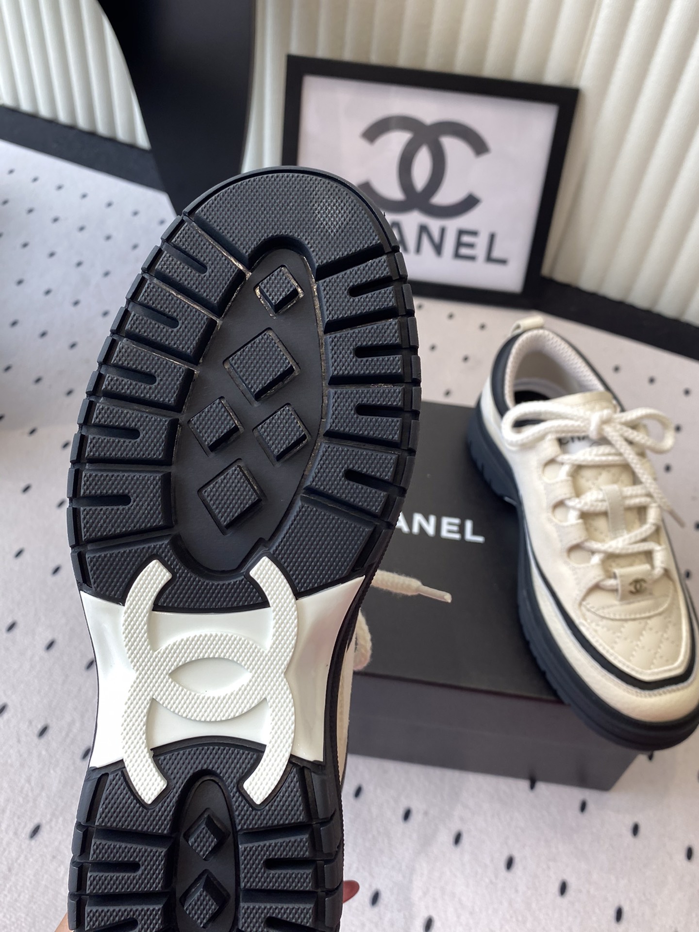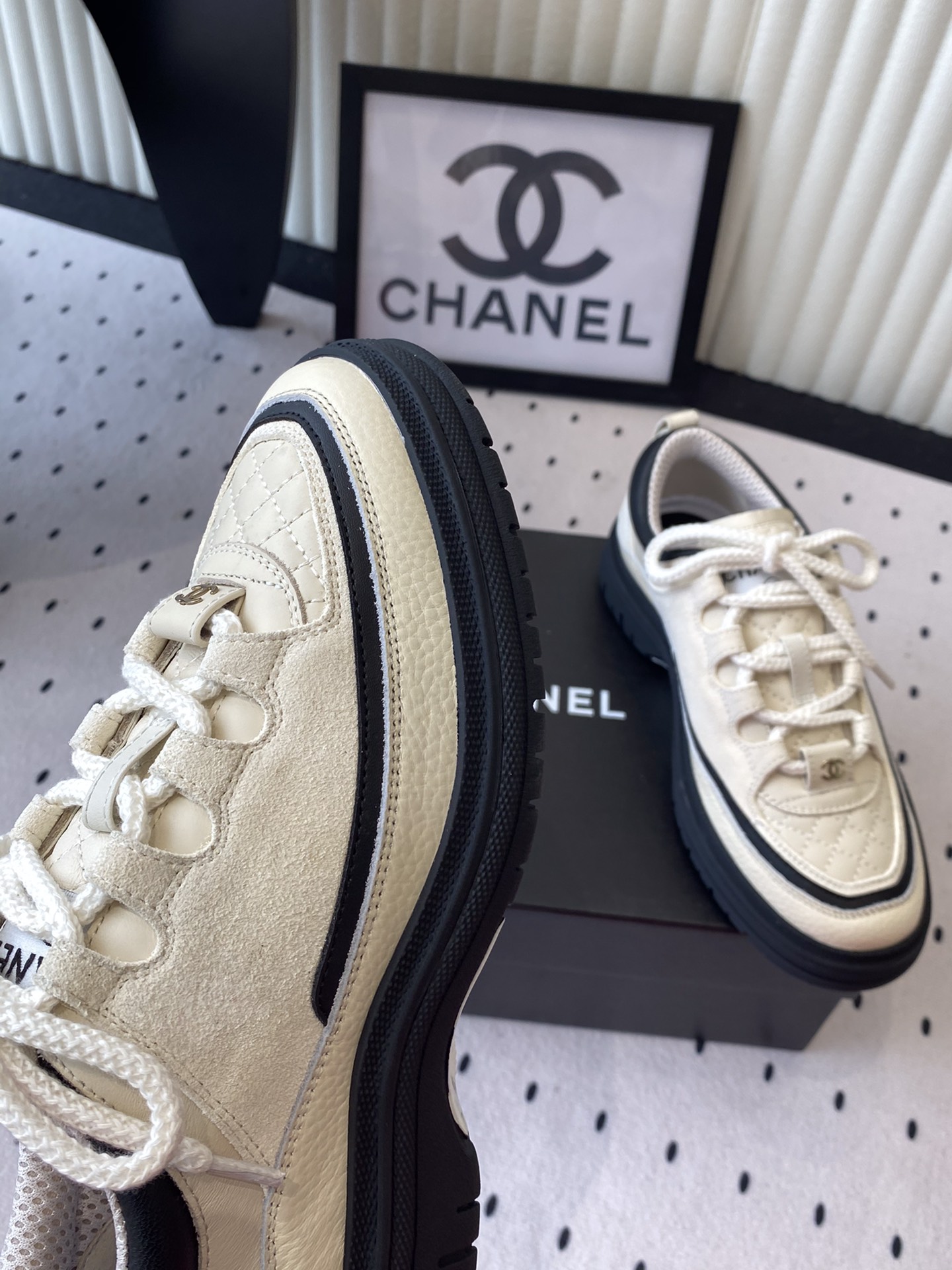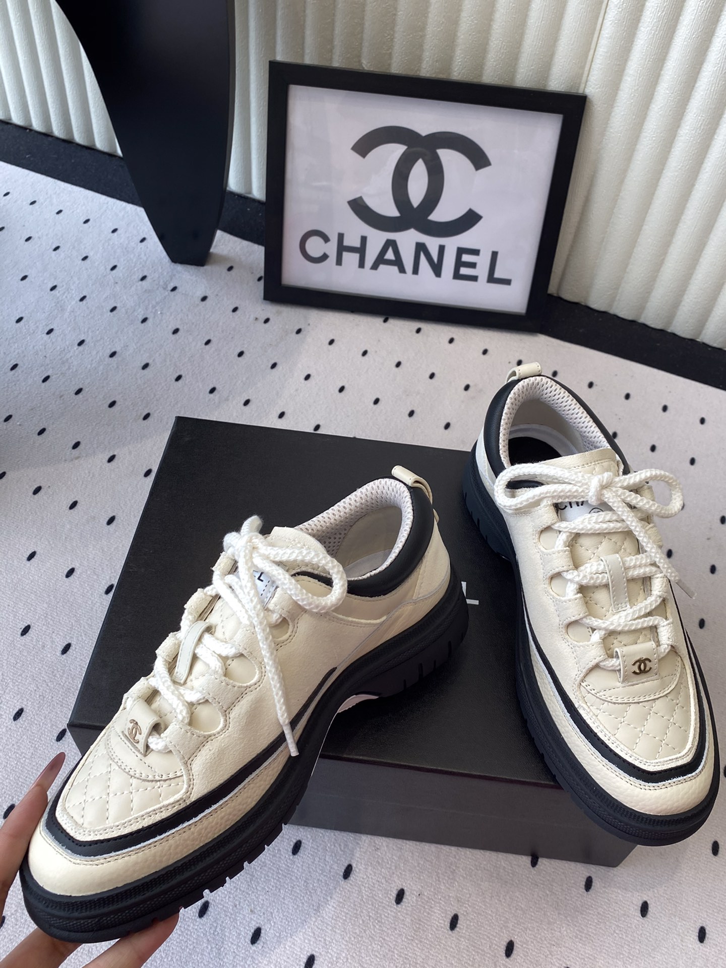 这款鞋子是AAAAA 1:1 质量 (非常棒). 使用了和原版一模一样的材料. 商标部分也保持了和香奈儿/Chanel一样. 图片拍摄是实物鞋子拍摄, 您所收到的实物保证和我们图片一模一样.