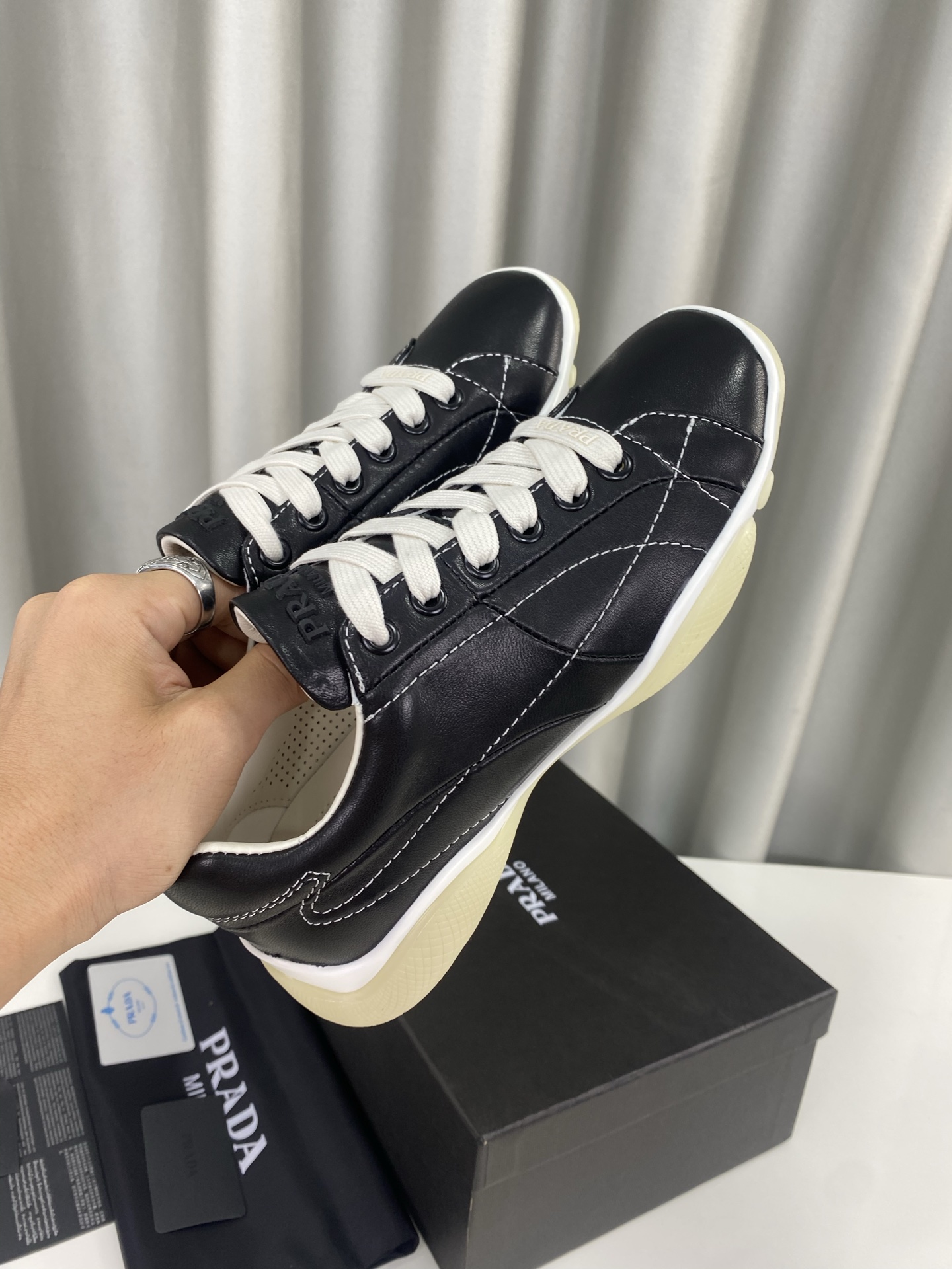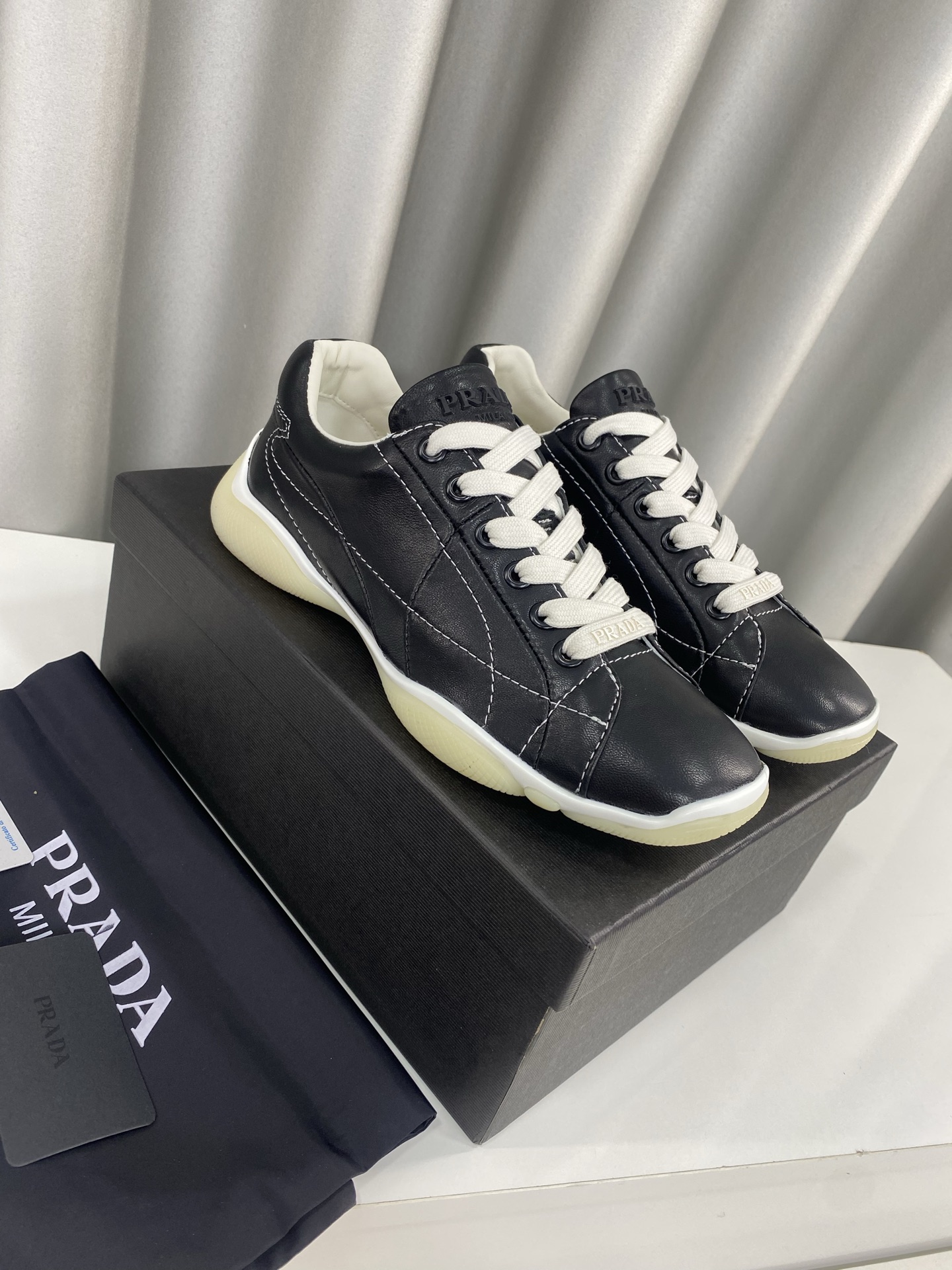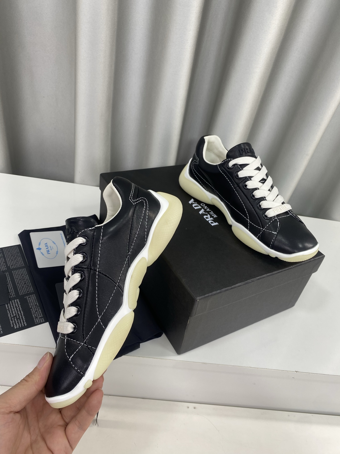 这款鞋子是AAAAA 1:1 质量 (非常棒). 使用了和原版一模一样的材料. 商标部分也保持了和普拉达/Prada一样. 图片拍摄是实物鞋子拍摄, 您所收到的实物保证和我们图片一模一样.