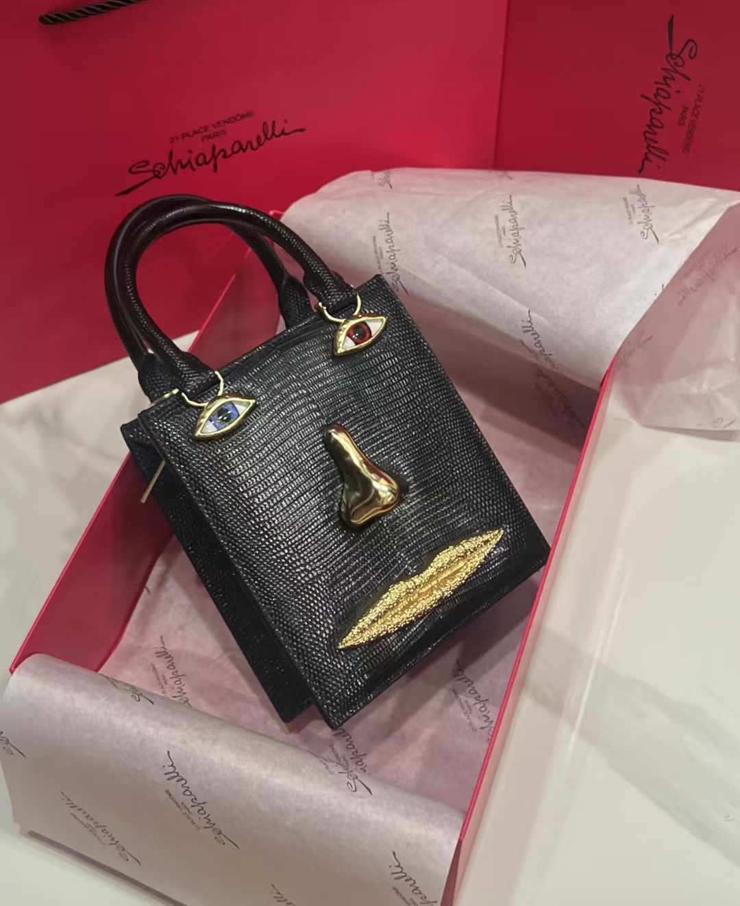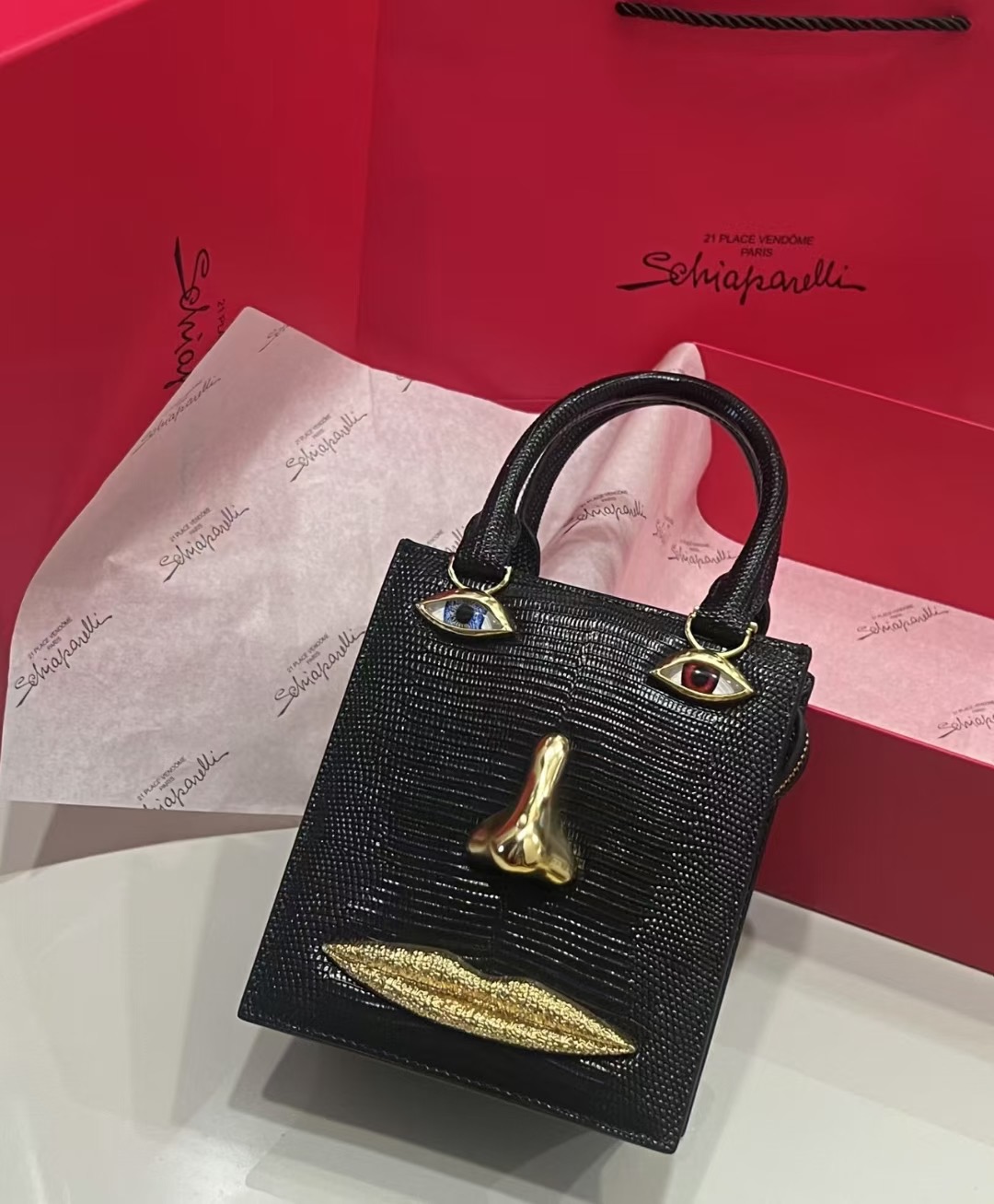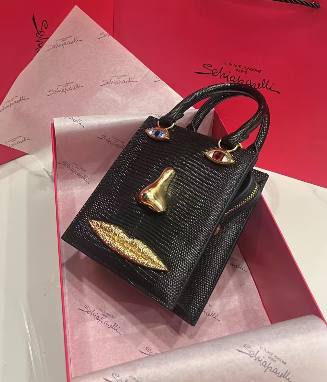 这款包包是AAAAA 1:1 质量 (非常棒). 使用了和原版一模一样的材料. 商标部分也保持了和Schiaparelli一样. 图片拍摄是实物包包拍摄, 您所收到的实物保证和我们图片一模一样.