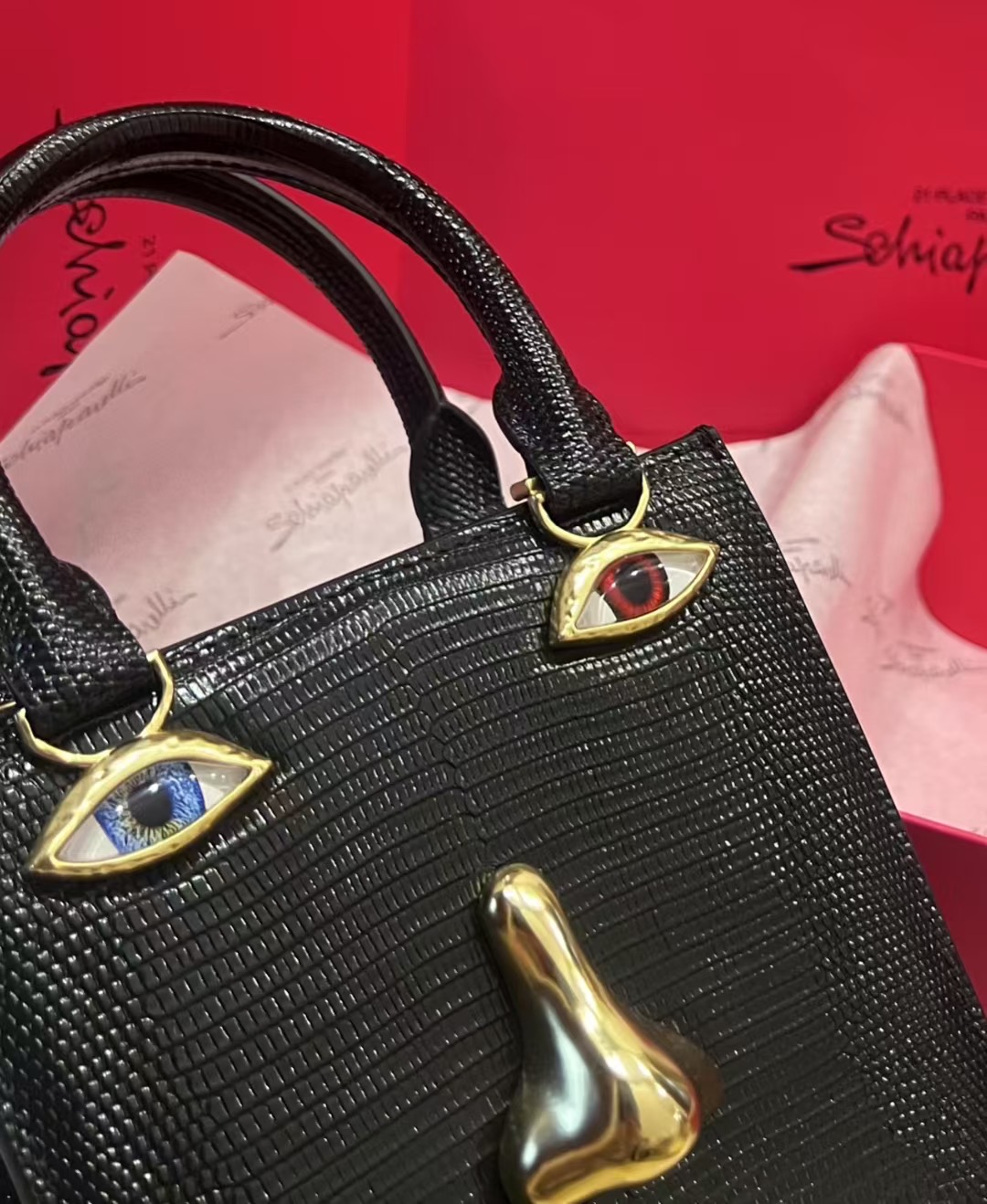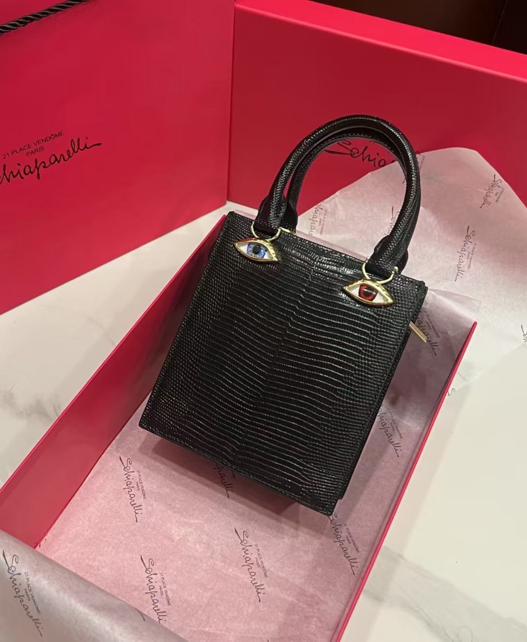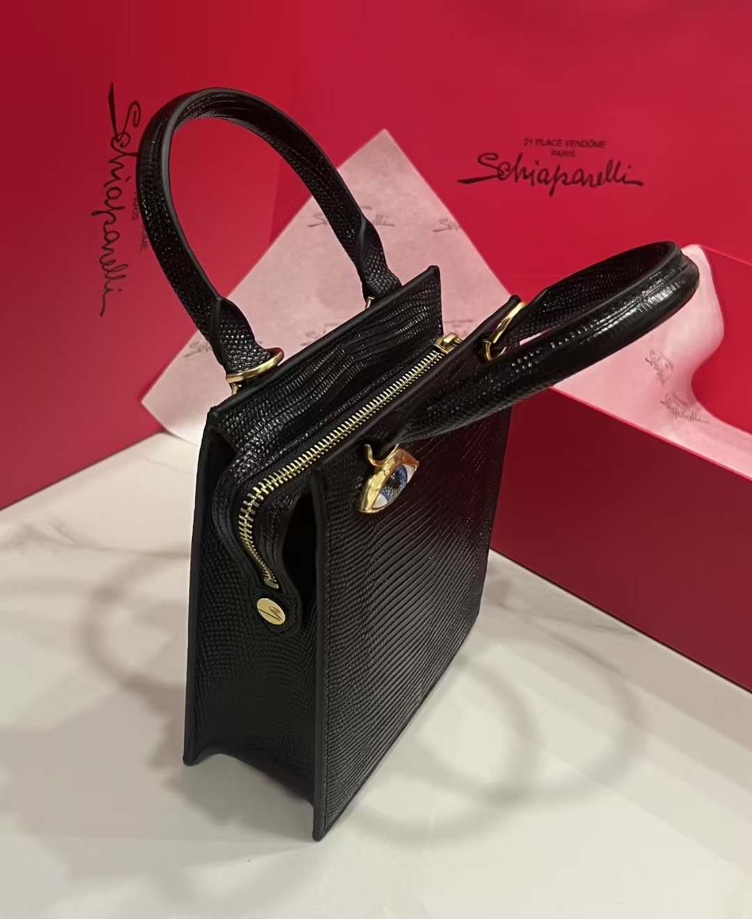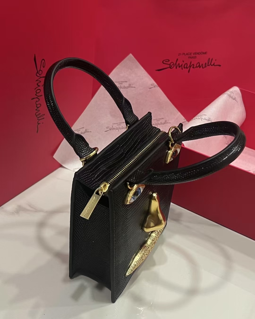 这款包包是AAAAA 1:1 质量 (非常棒). 使用了和原版一模一样的材料. 商标部分也保持了和Schiaparelli一样. 图片拍摄是实物包包拍摄, 您所收到的实物保证和我们图片一模一样.