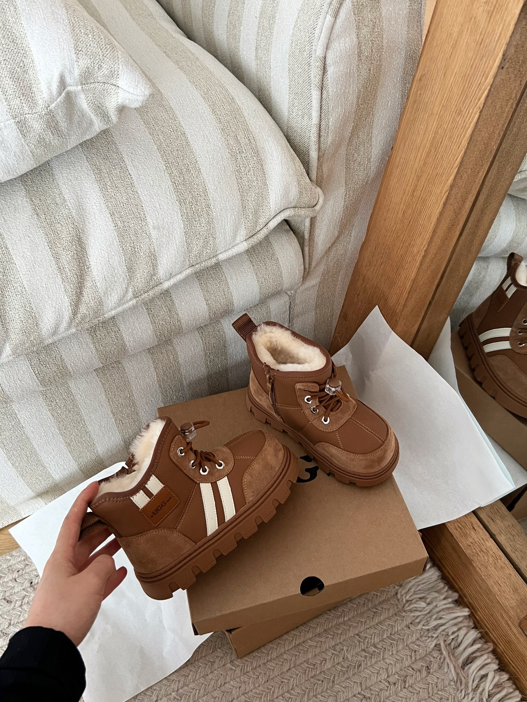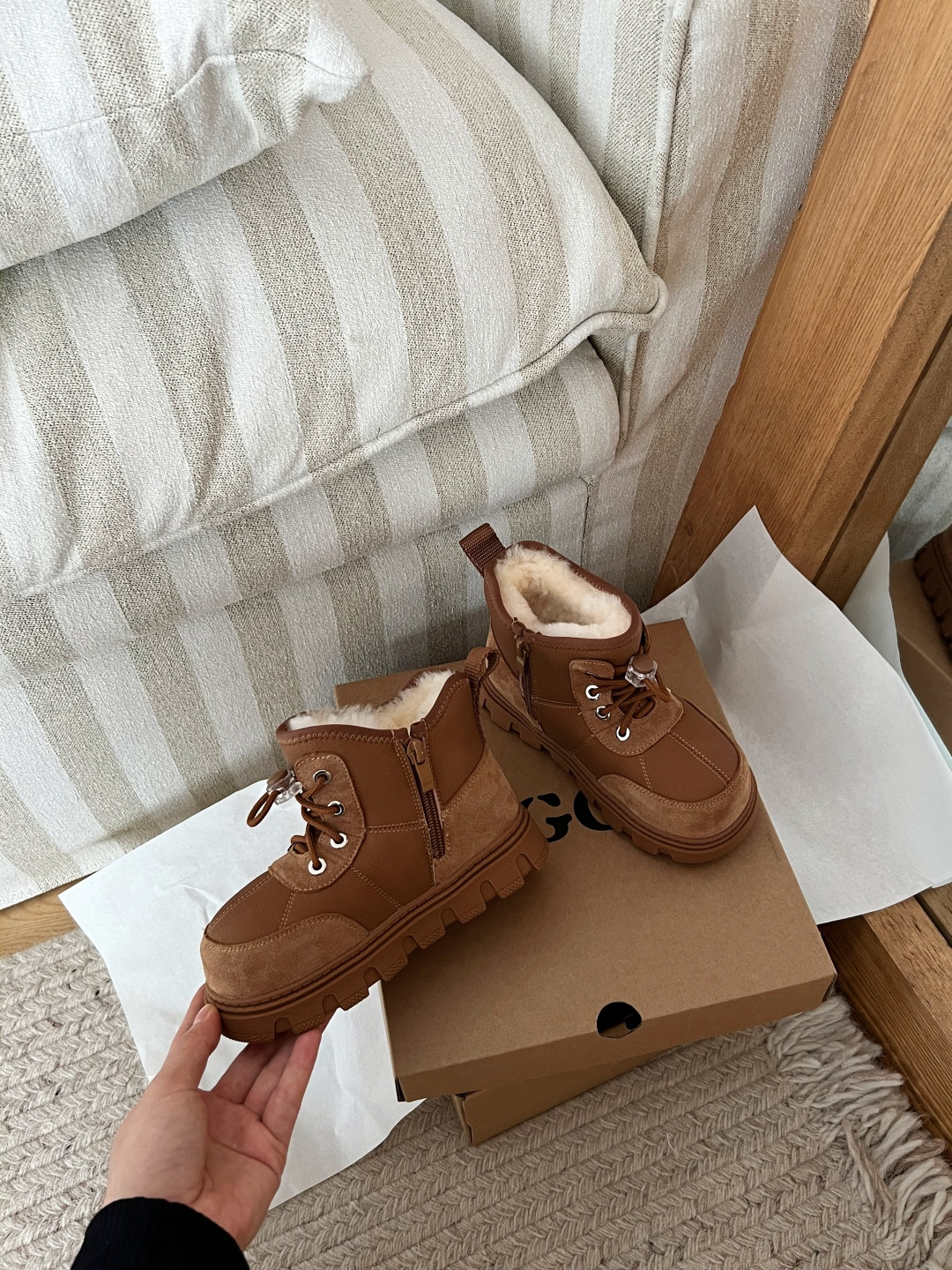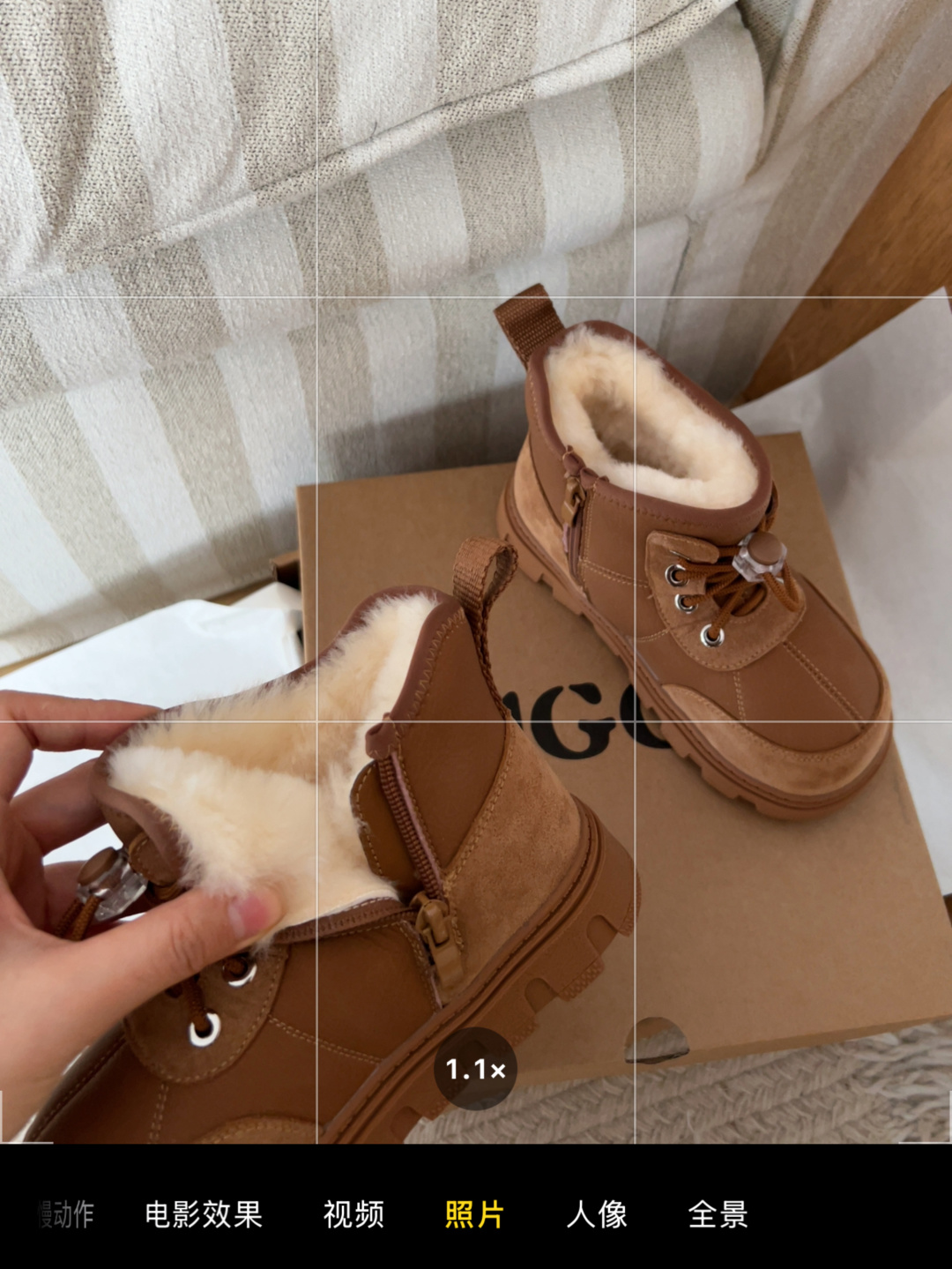 这款兒童鞋是AAAAA 1:1 质量 (非常棒). 使用了和原版一模一样的材料. 商标部分也保持了和UGG雪地靴一样. 图片拍摄是实物兒童鞋拍摄, 您所收到的实物保证和我们图片一模一样.