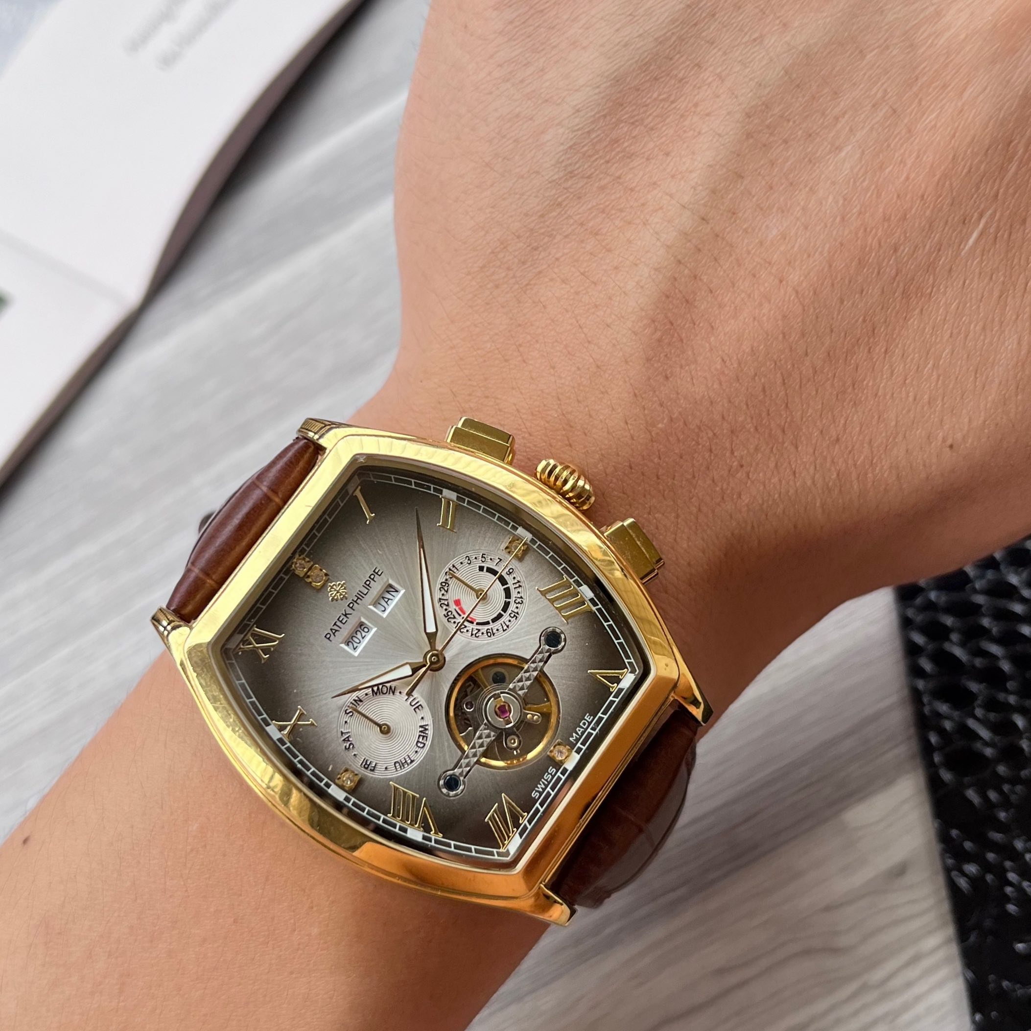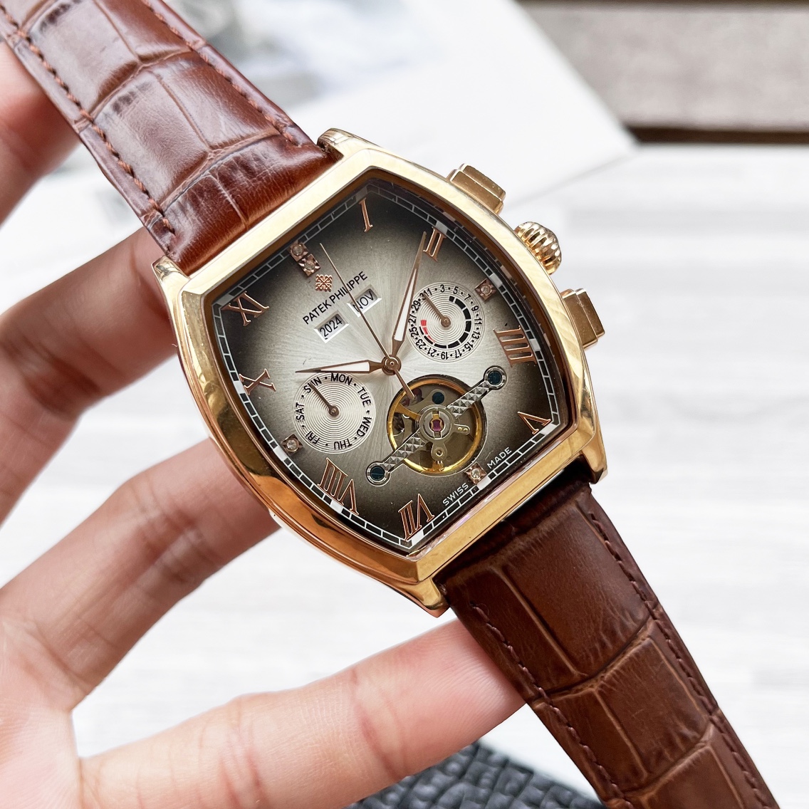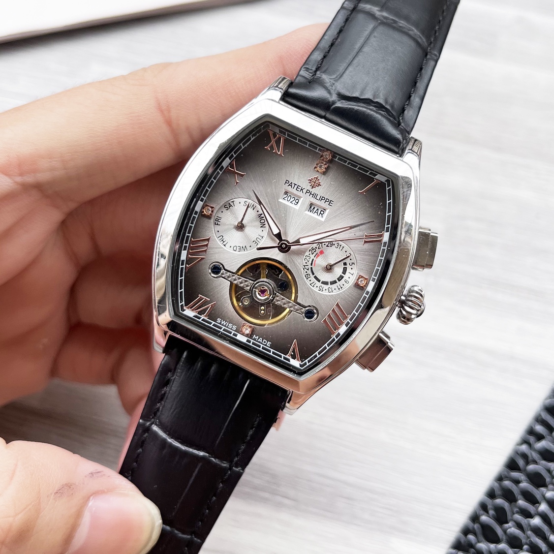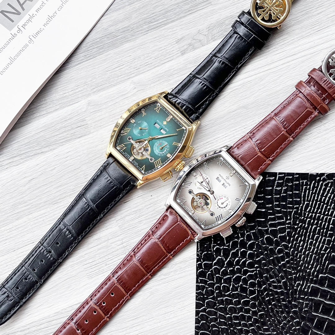 这款手表是AAAAA 1:1 质量 (非常棒). 使用了和原版一模一样的材料. 商标部分也保持了和百达翡丽/Patek Philippe一样. 图片拍摄是实物手表拍摄, 您所收到的实物保证和我们图片一模一样.