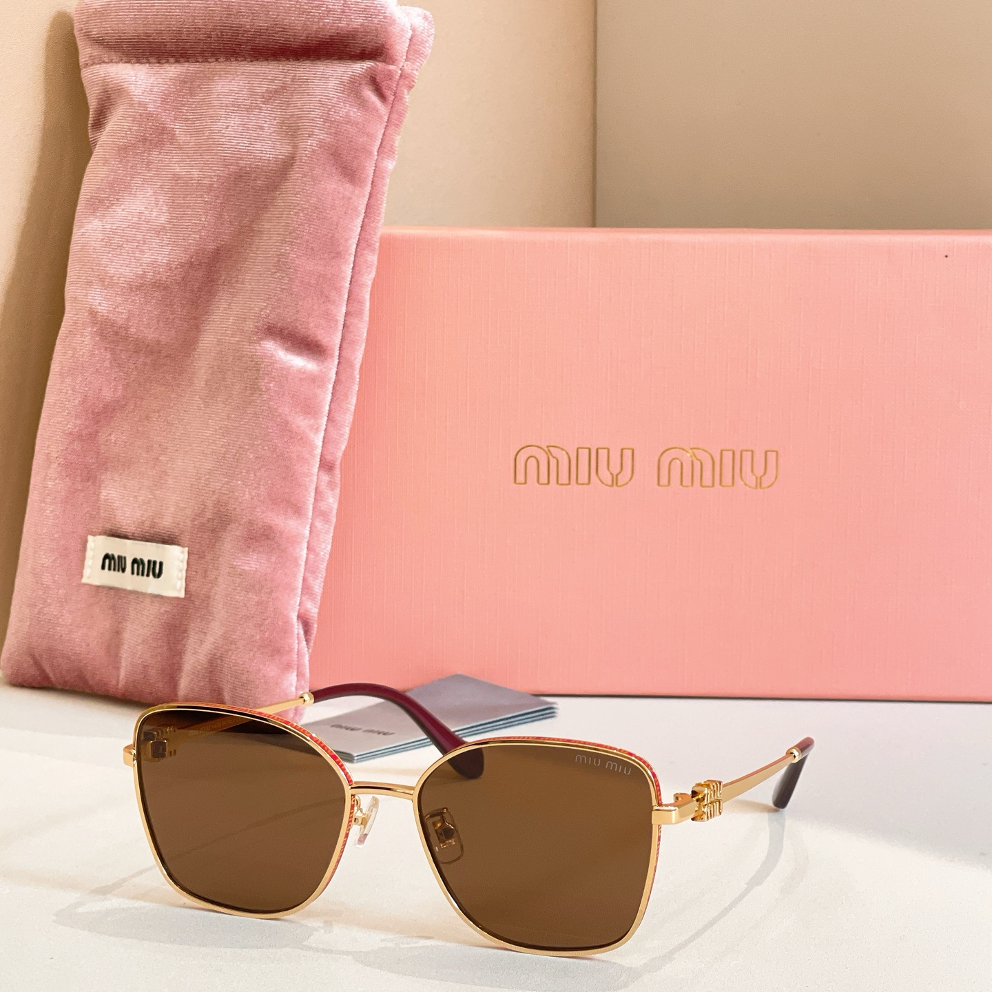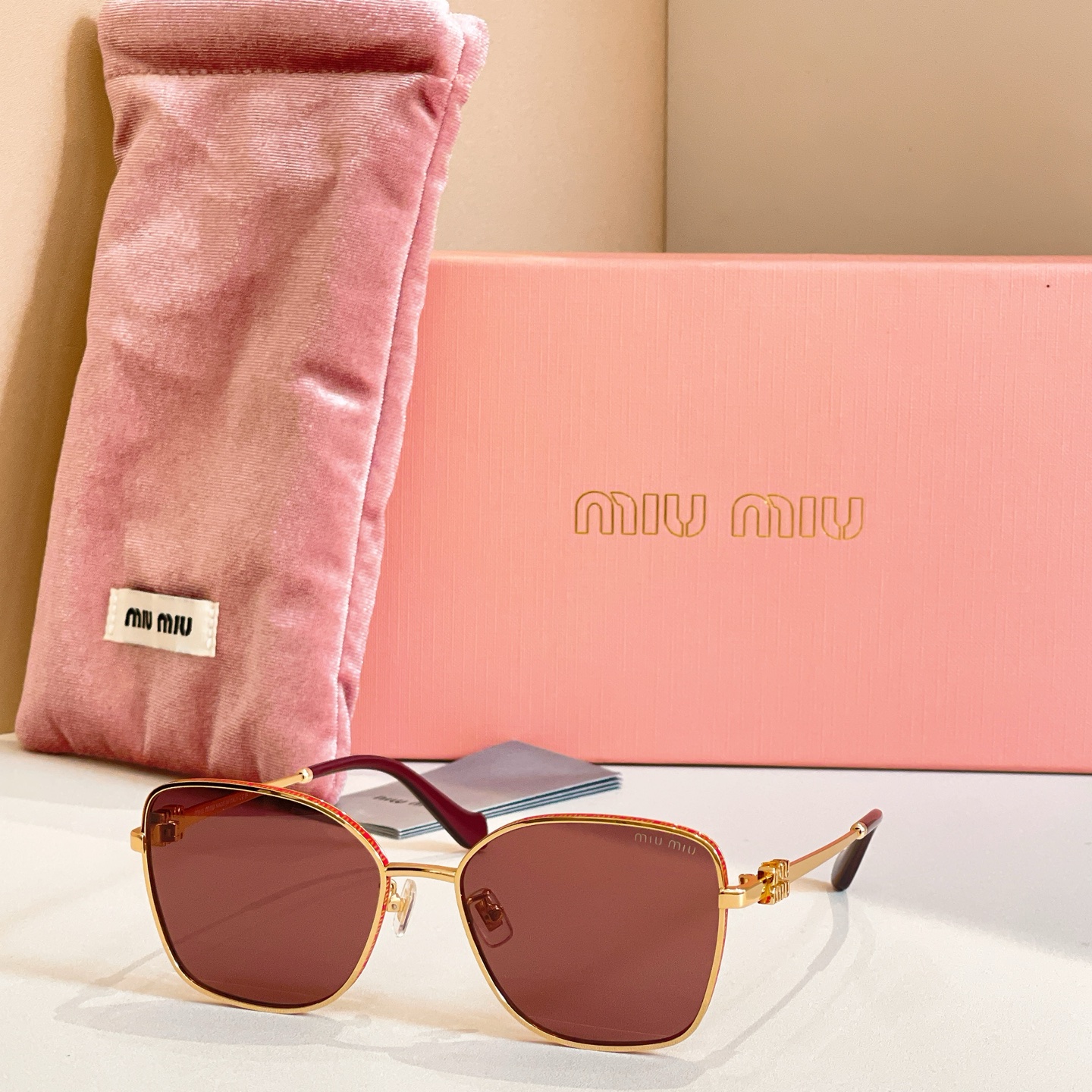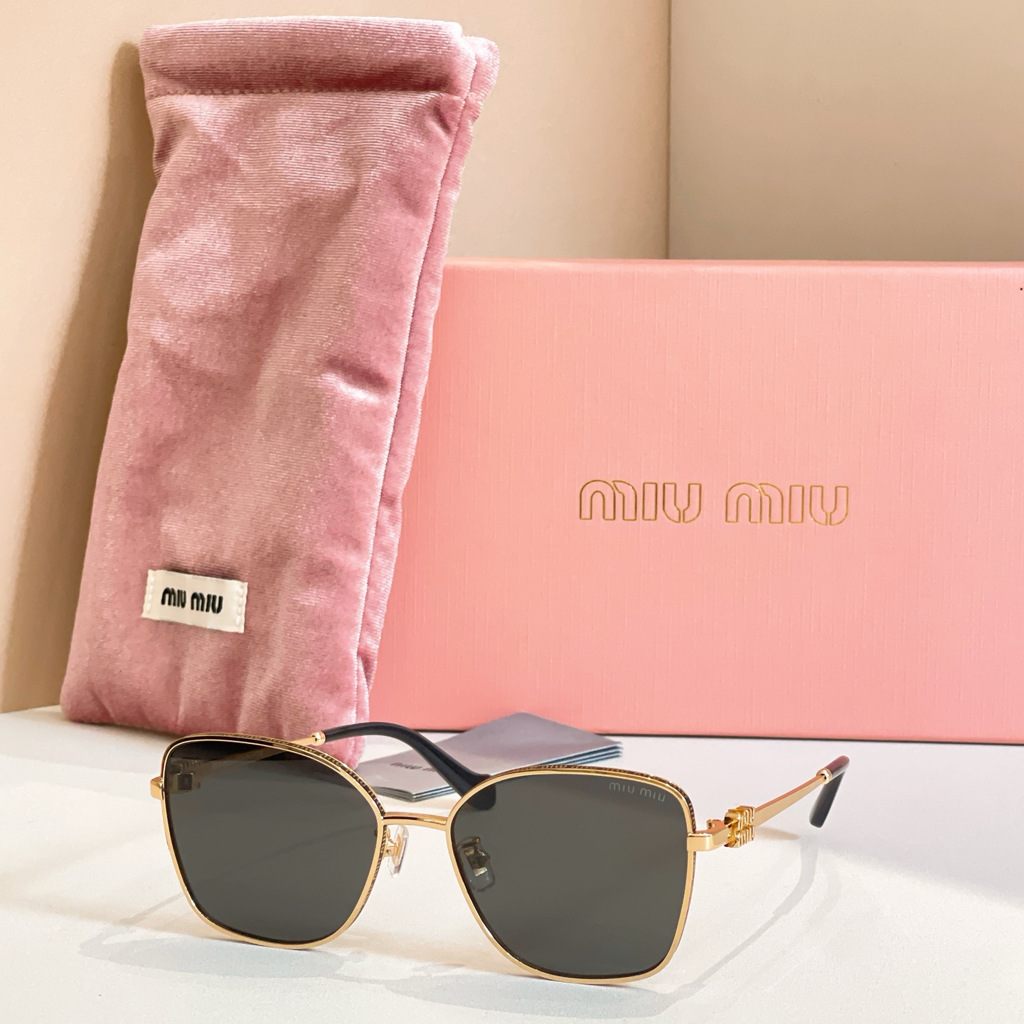 这款太阳眼镜是AAAAA 1:1 质量 (非常棒). 使用了和原版一模一样的材料. 商标部分也保持了和缪缪/Miu Miu一样. 图片拍摄是实物太阳眼镜拍摄, 您所收到的实物保证和我们图片一模一样.