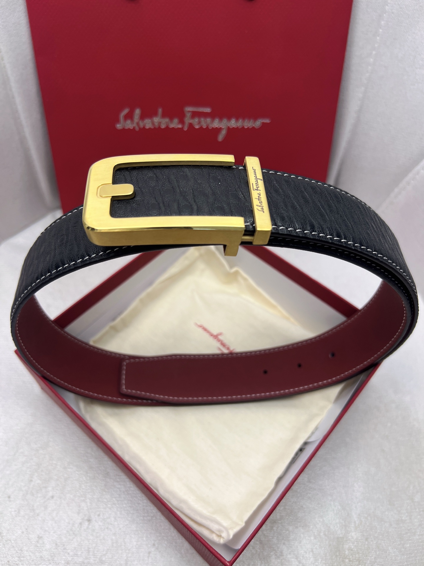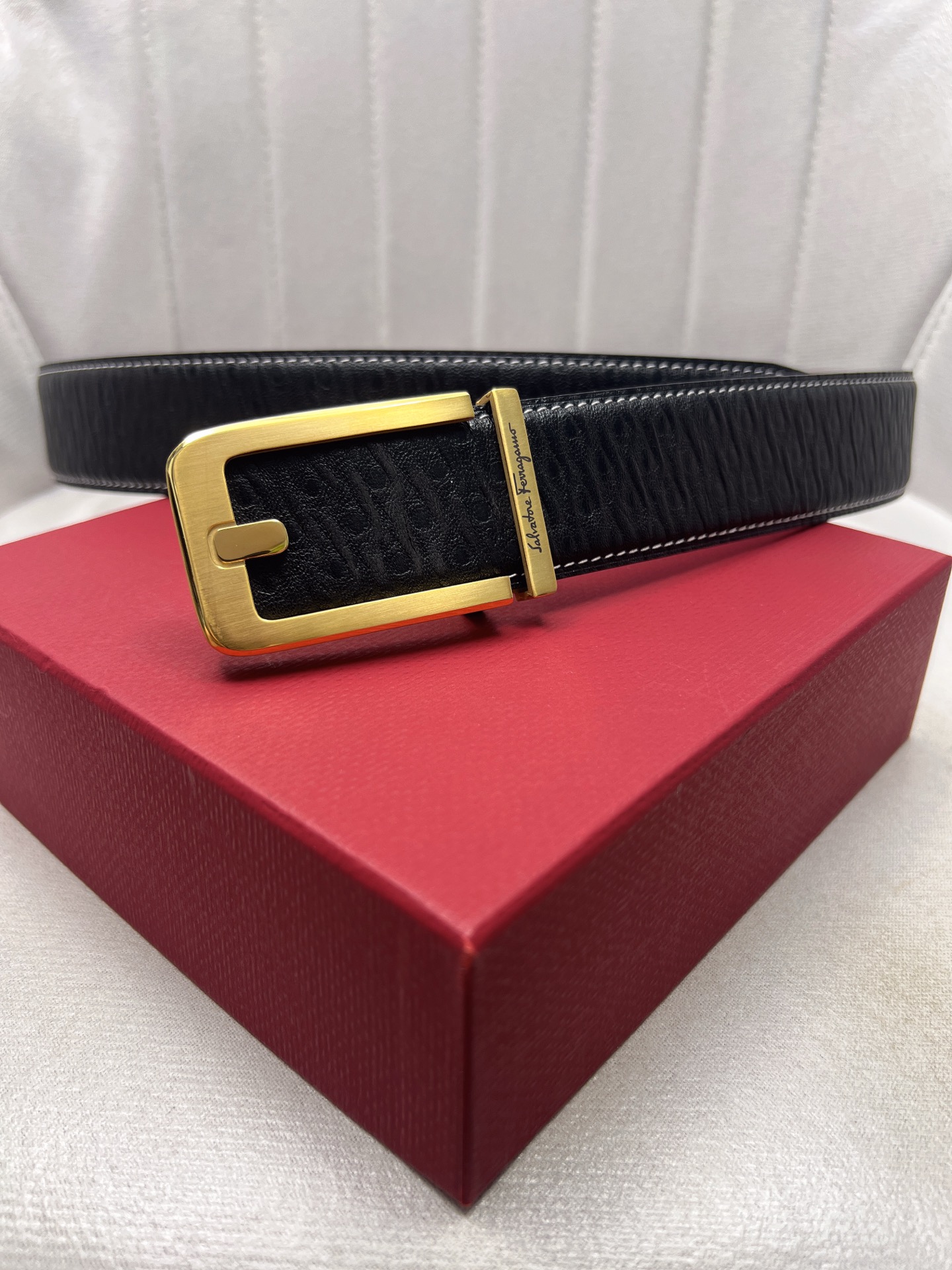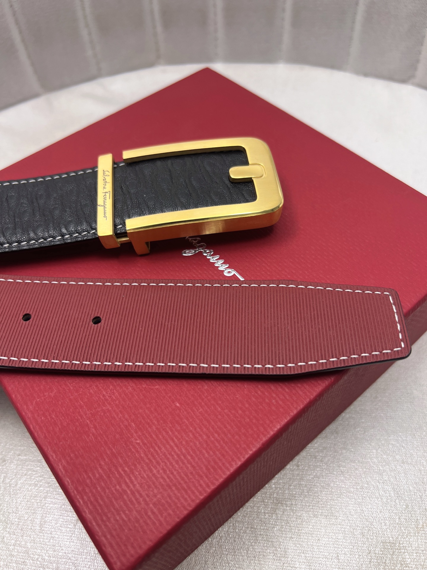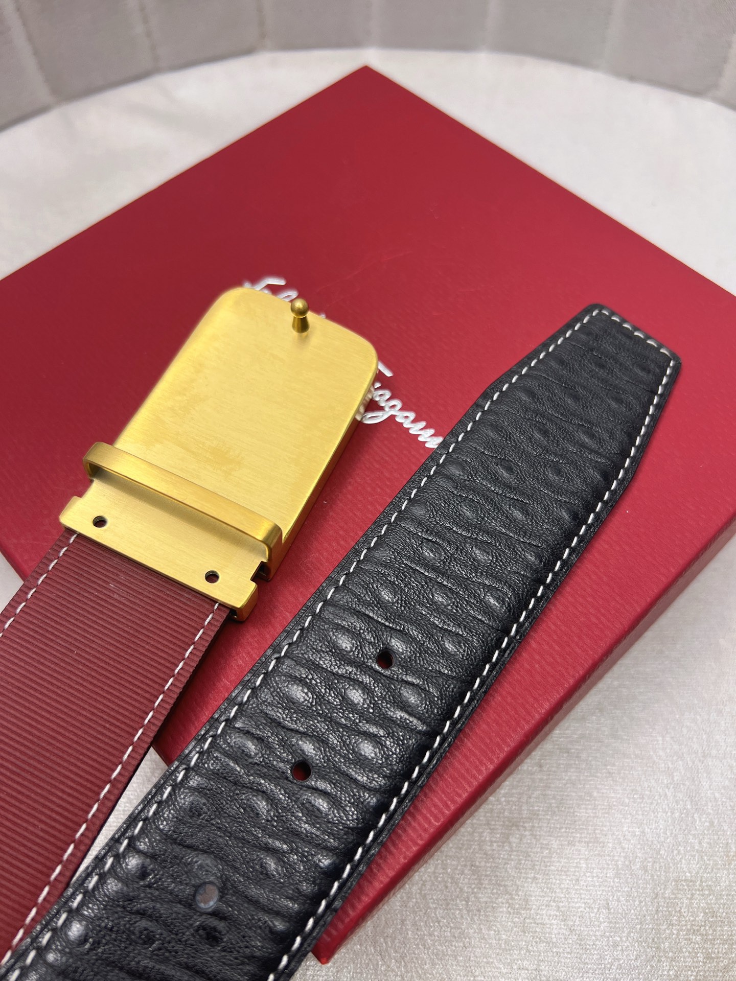 这款皮带是AAAAA 1:1 质量 (非常棒). 使用了和原版一模一样的材料. 商标部分也保持了和菲拉格慕/Salvatore Ferragamo一样. 图片拍摄是实物皮带拍摄, 您所收到的实物保证和我们图片一模一样.
