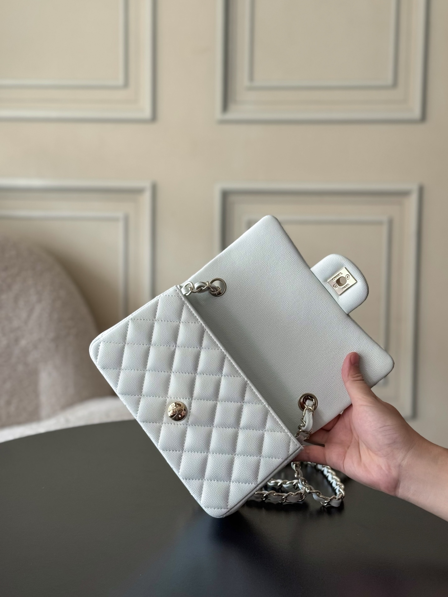 这款包包是AAAAA 1:1 质量 (非常棒). 使用了和原版一模一样的材料. 商标部分也保持了和香奈儿/Chanel一样. 图片拍摄是实物包包拍摄, 您所收到的实物保证和我们图片一模一样.