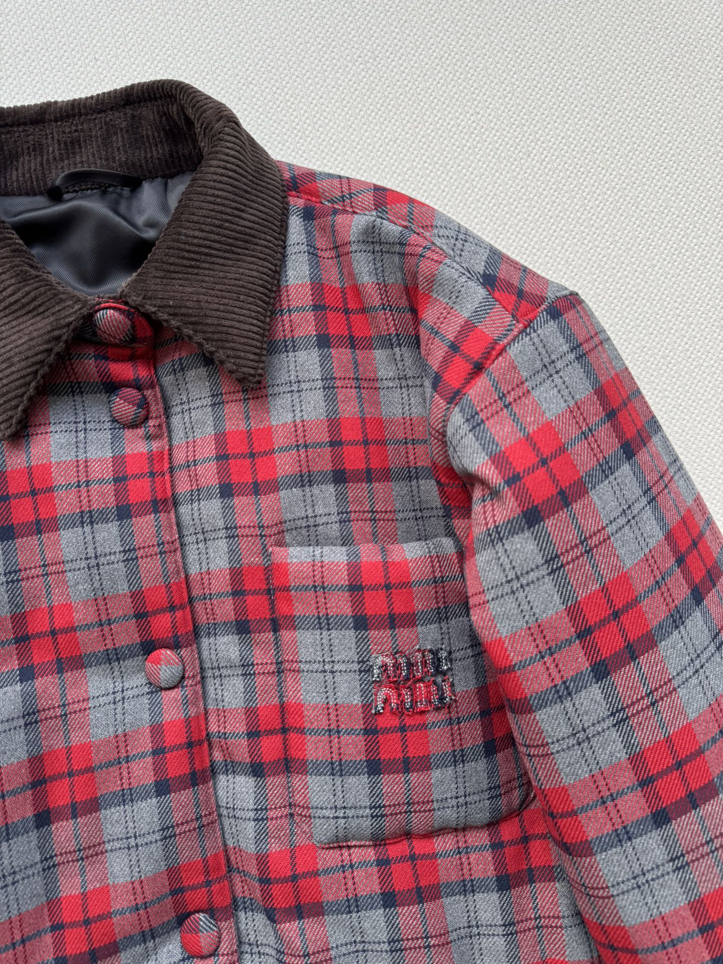 这款衣服是AAAAA 1:1 质量 (非常棒). 使用了和原版一模一样的材料. 商标部分也保持了和缪缪/Miu Miu一样. 图片拍摄是实物衣服拍摄, 您所收到的实物保证和我们图片一模一样.