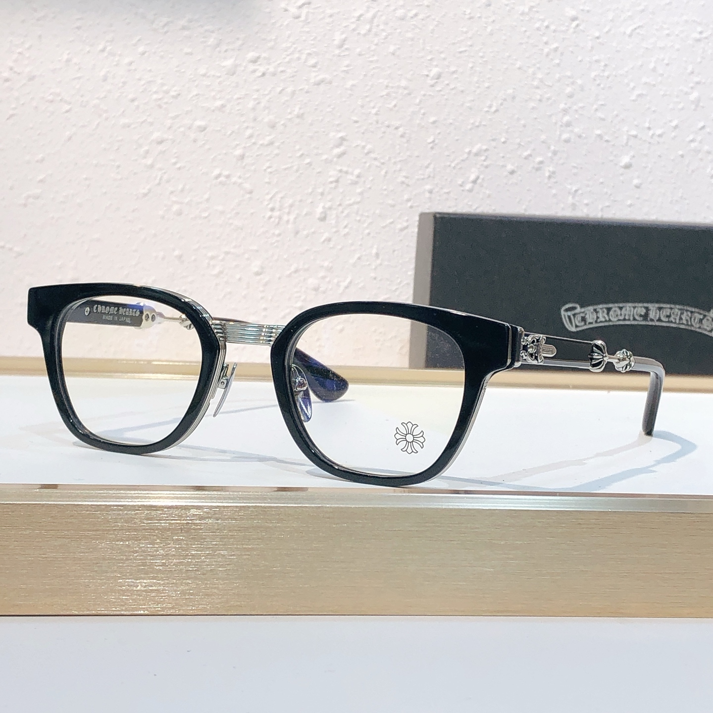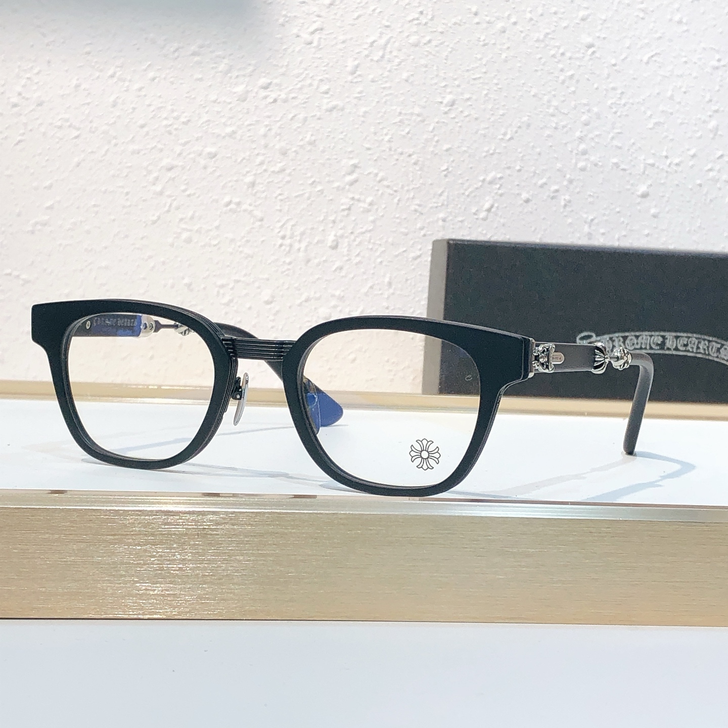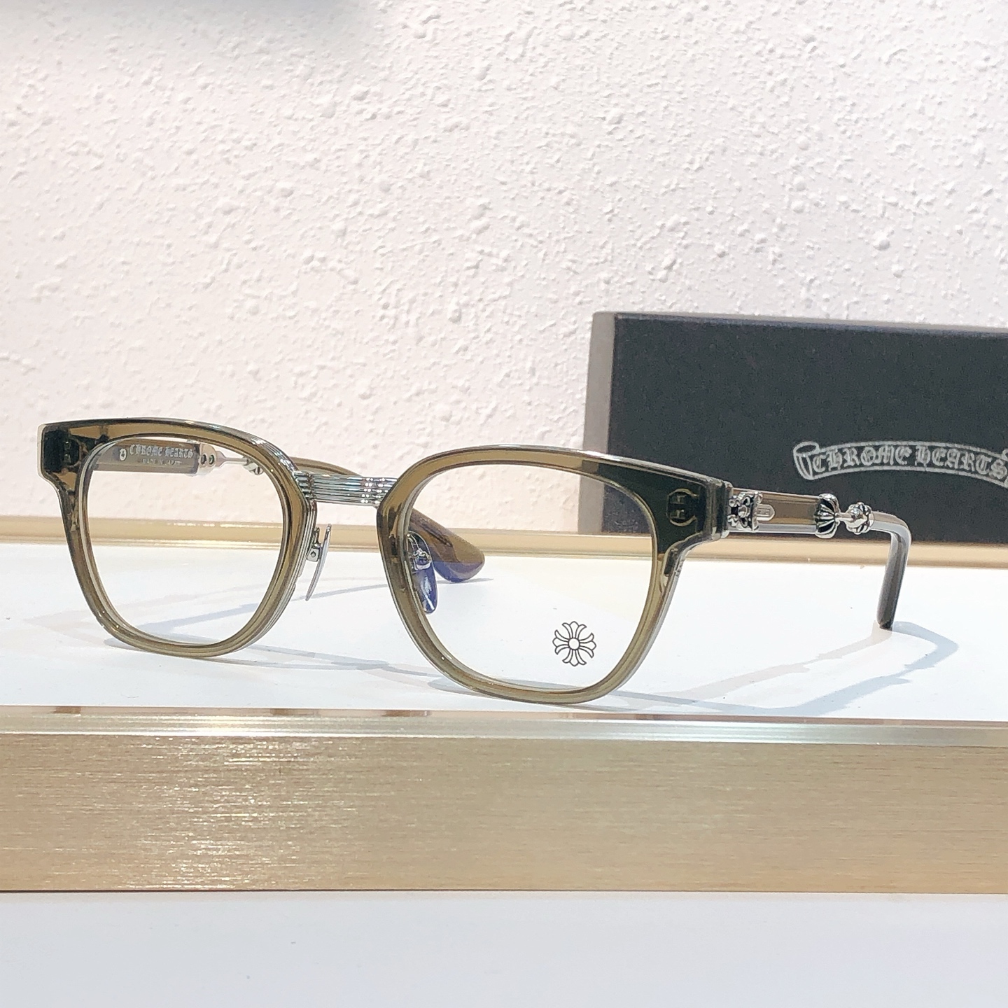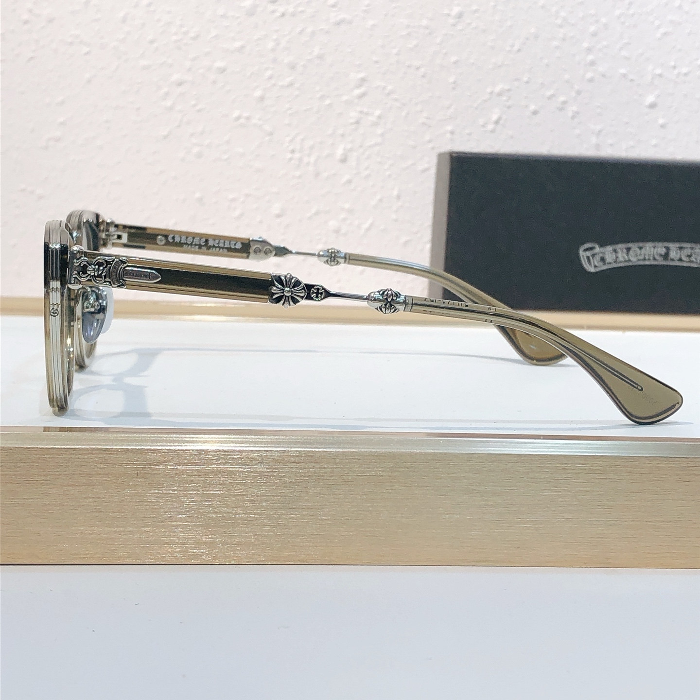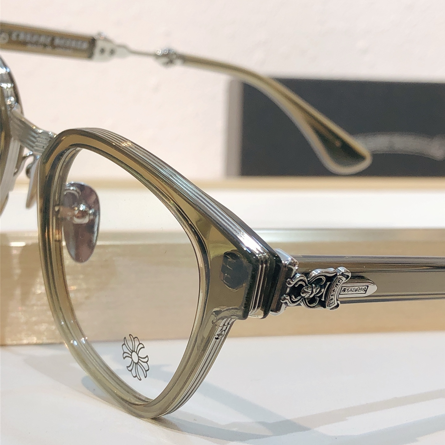 这款太阳眼镜是AAAAA 1:1 质量 (非常棒). 使用了和原版一模一样的材料. 商标部分也保持了和克罗心/Chrome Hearts一样. 图片拍摄是实物太阳眼镜拍摄, 您所收到的实物保证和我们图片一模一样.