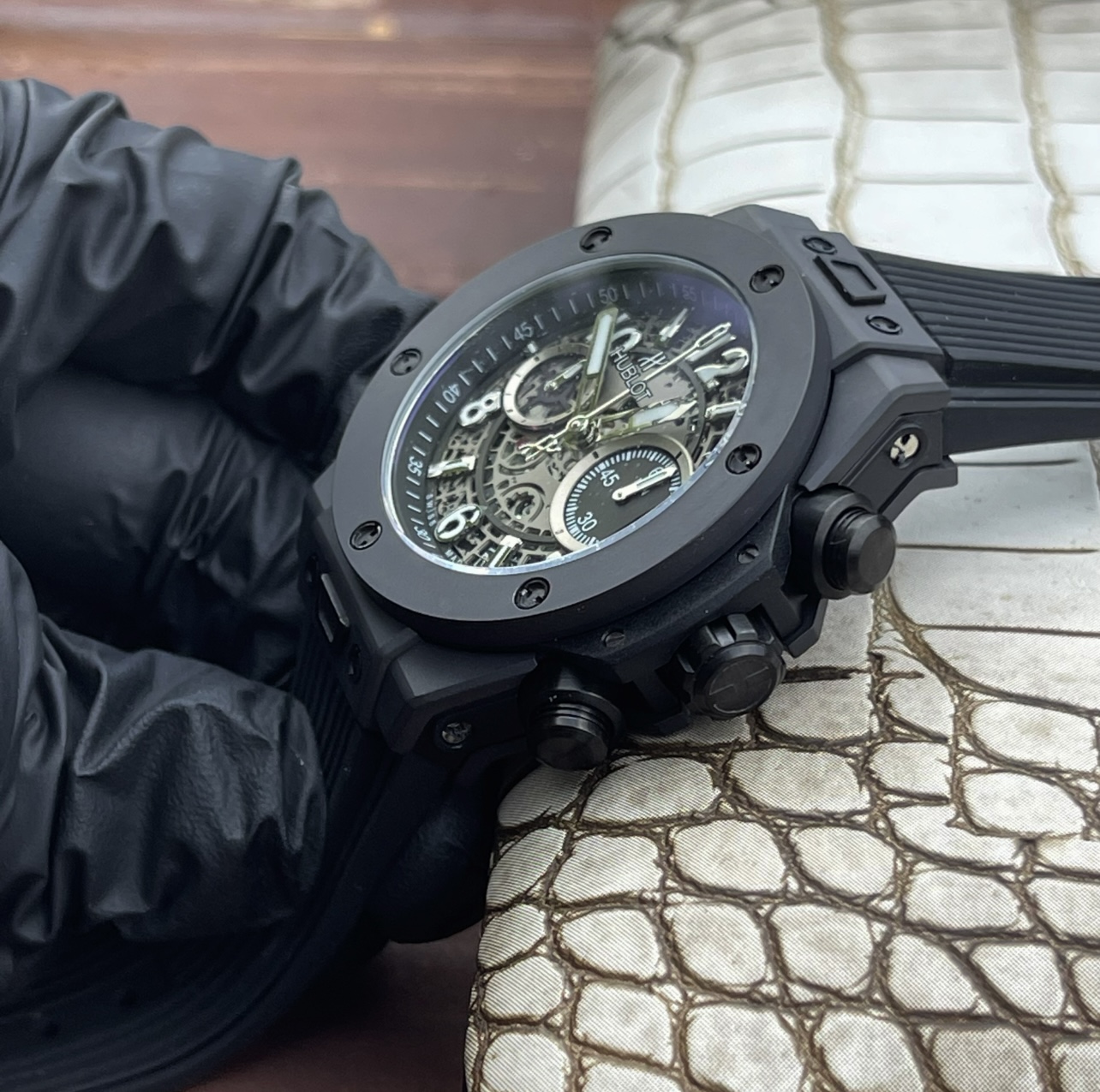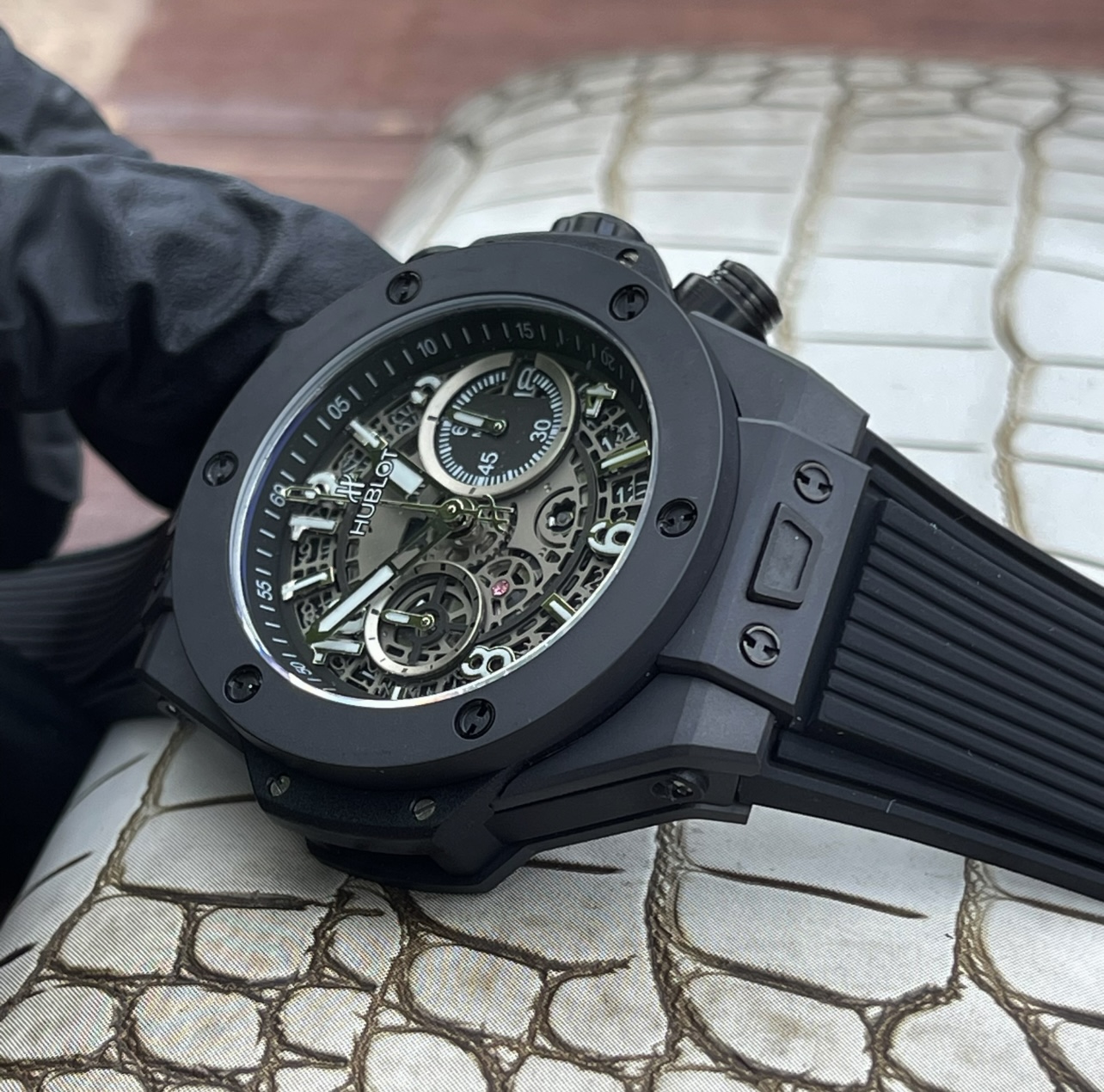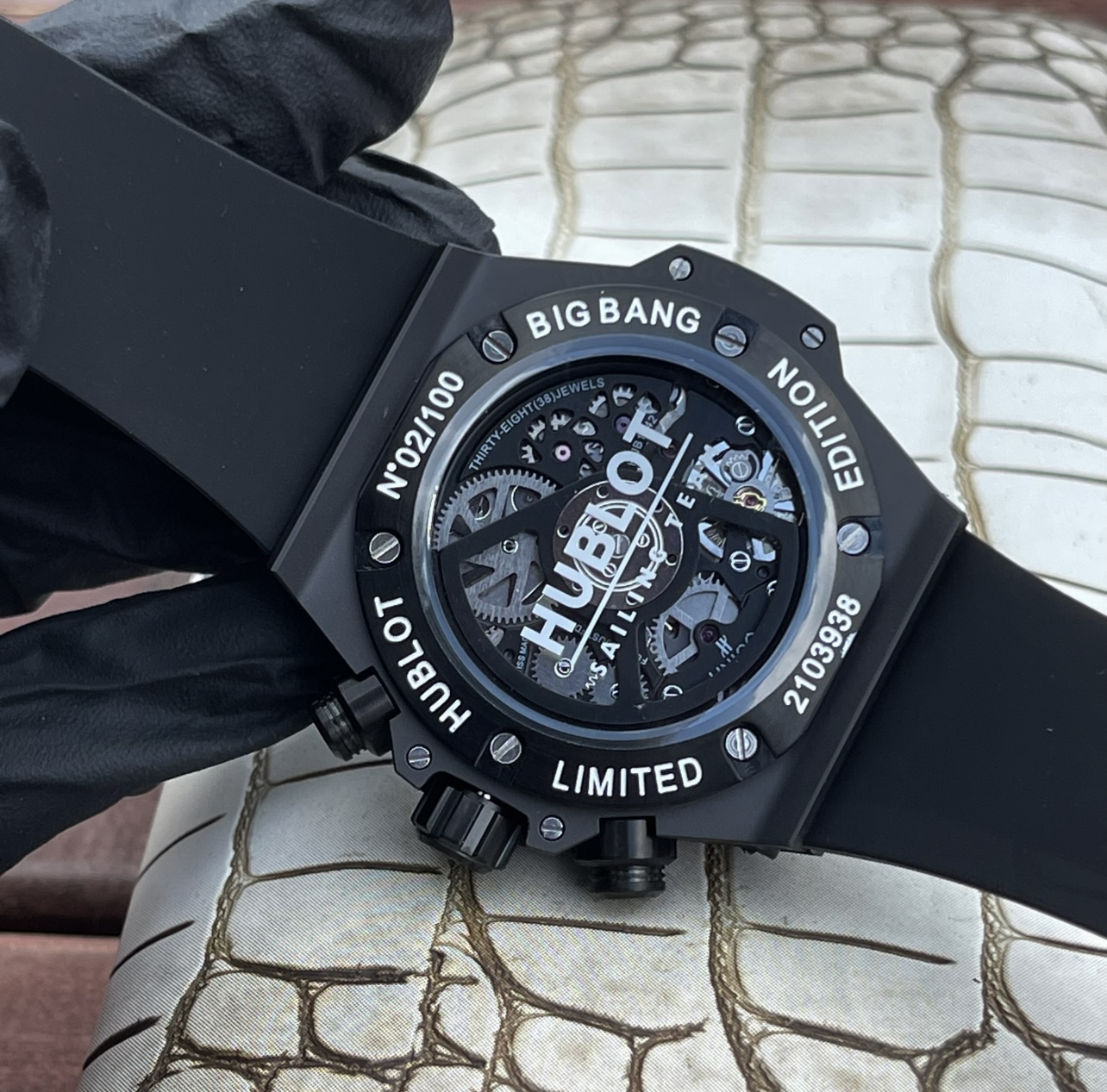 这款手表是AAAAA 1:1 质量 (非常棒). 使用了和原版一模一样的材料. 商标部分也保持了和Hublot一样. 图片拍摄是实物手表拍摄, 您所收到的实物保证和我们图片一模一样.
